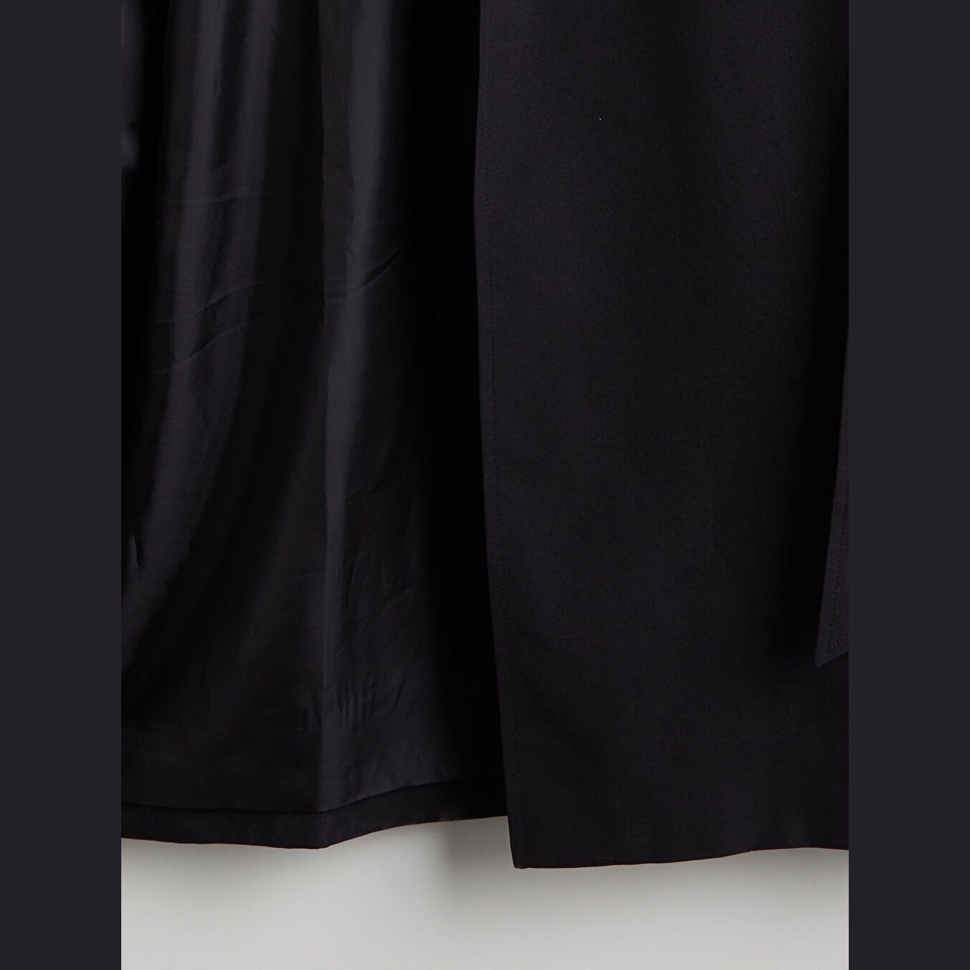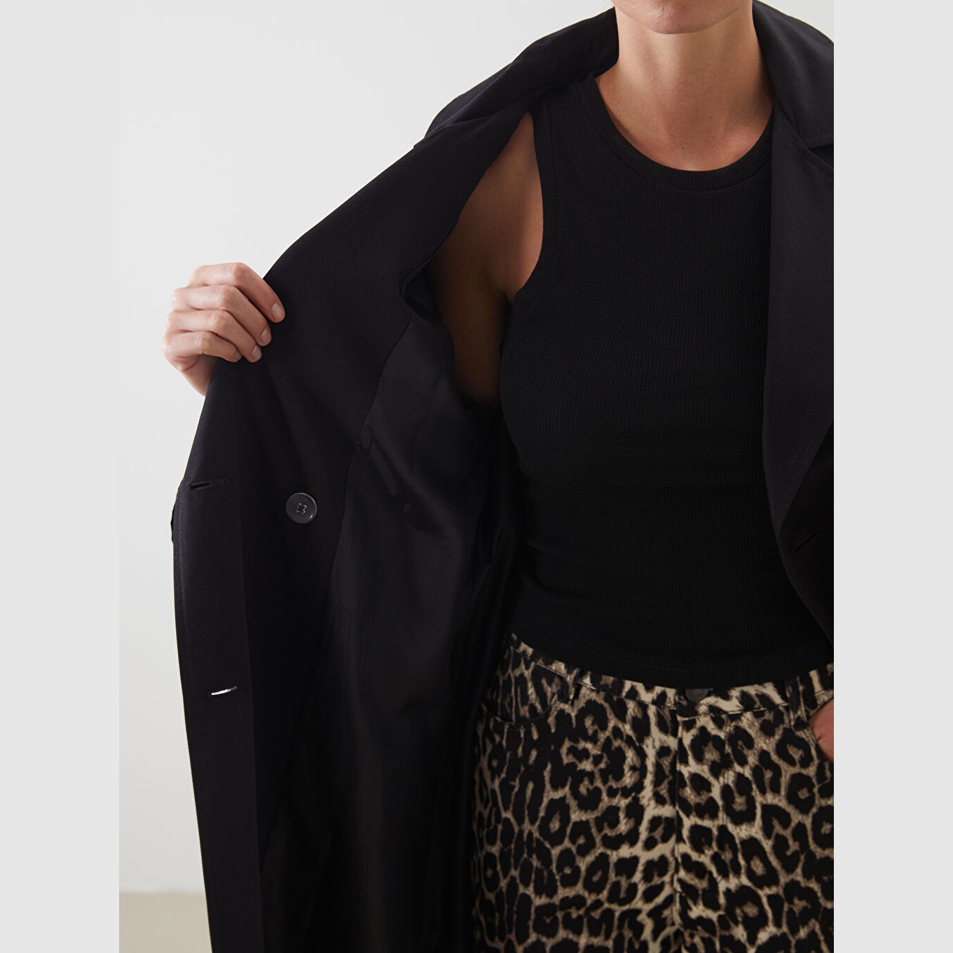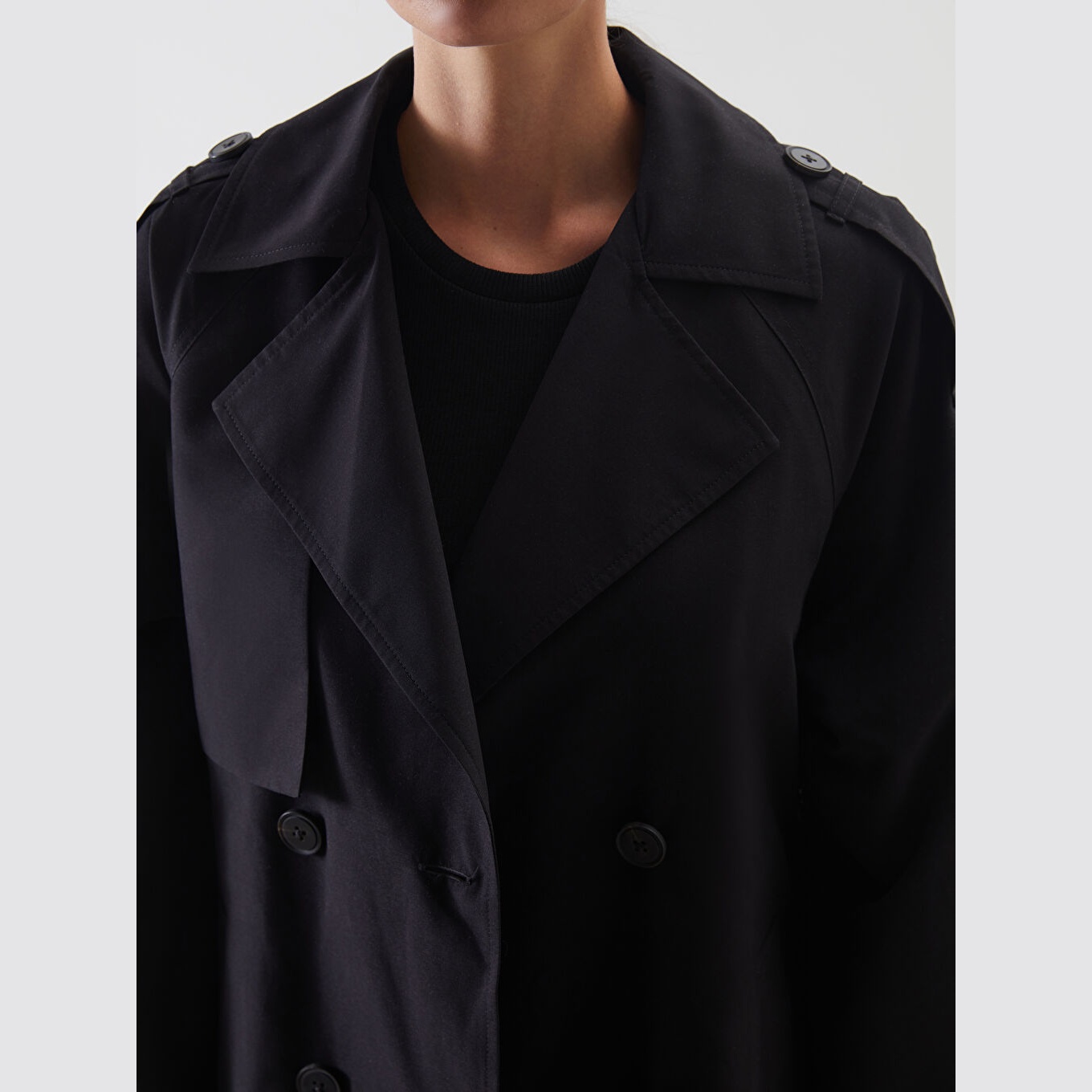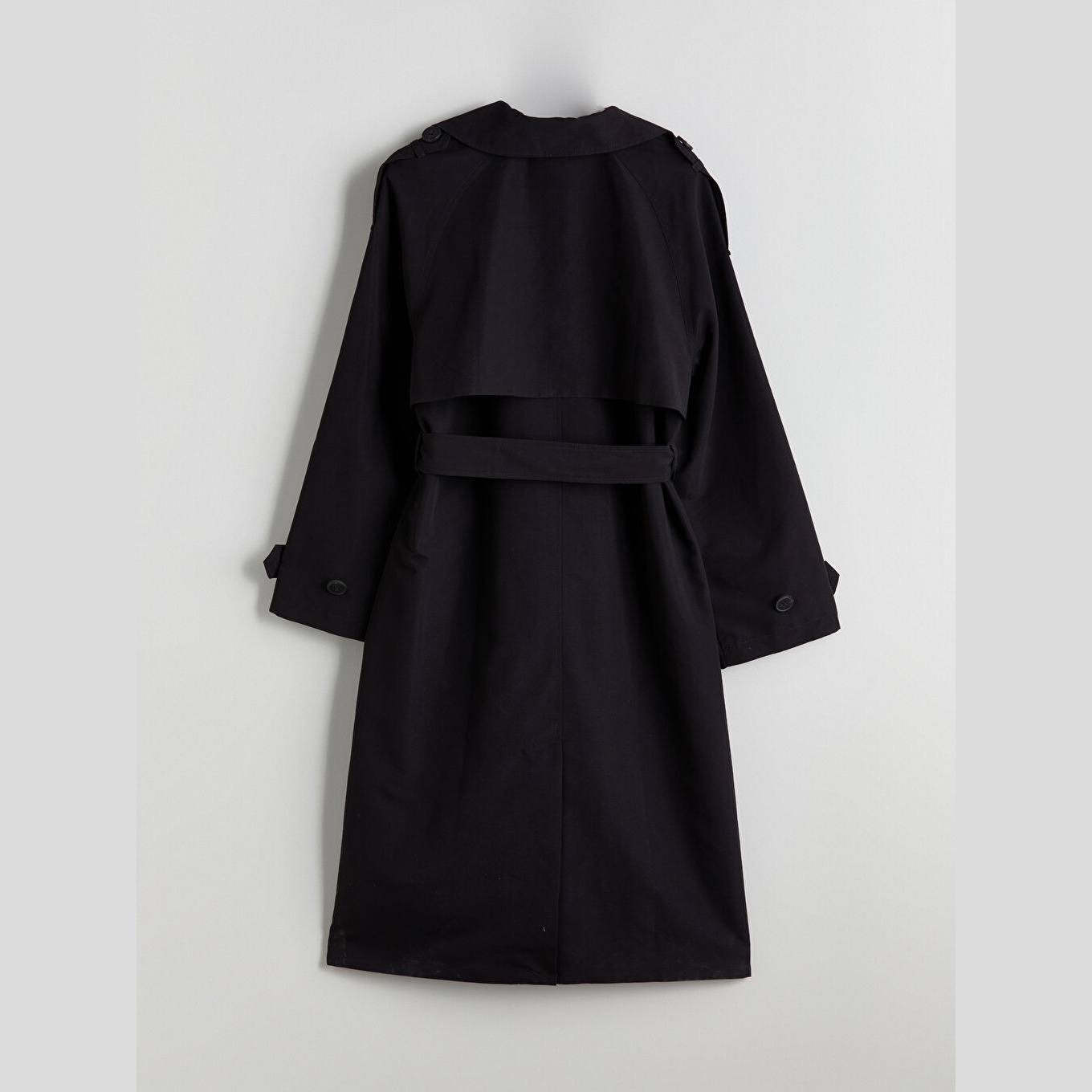 ترنش كوت نسائي بياقة جاكيت من LCW Vision – أسود (قصة واسعة، تصميم عصري طويل، خامة ناعمة مبطّنة بالكامل، مزود بحزام خصر، مثالي للإطلالات الرسمية والعصرية)