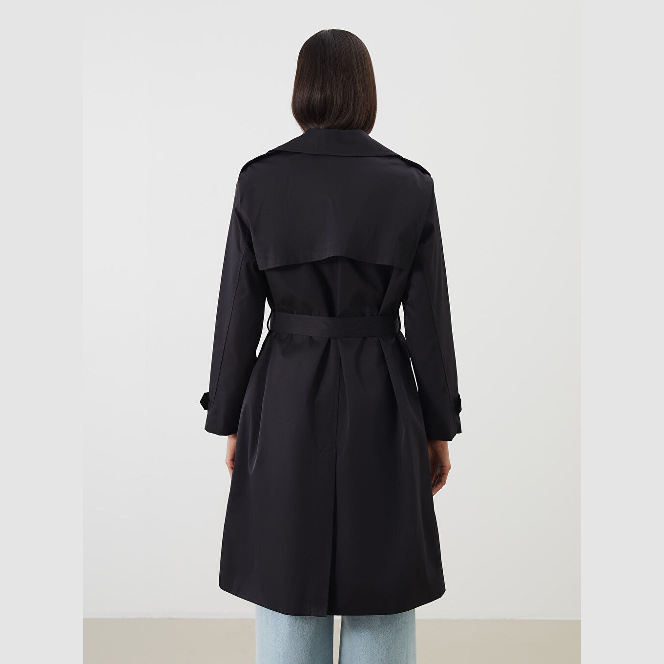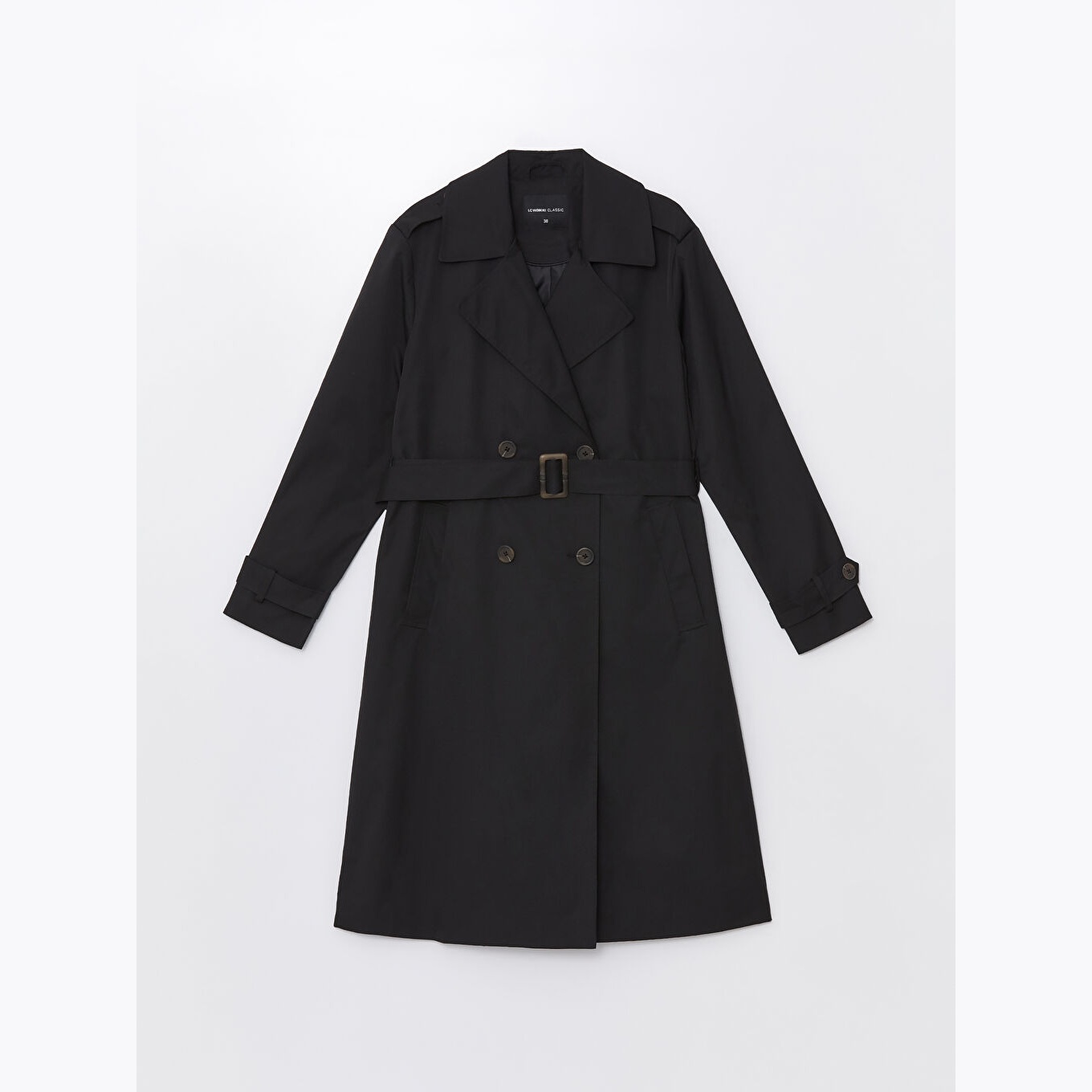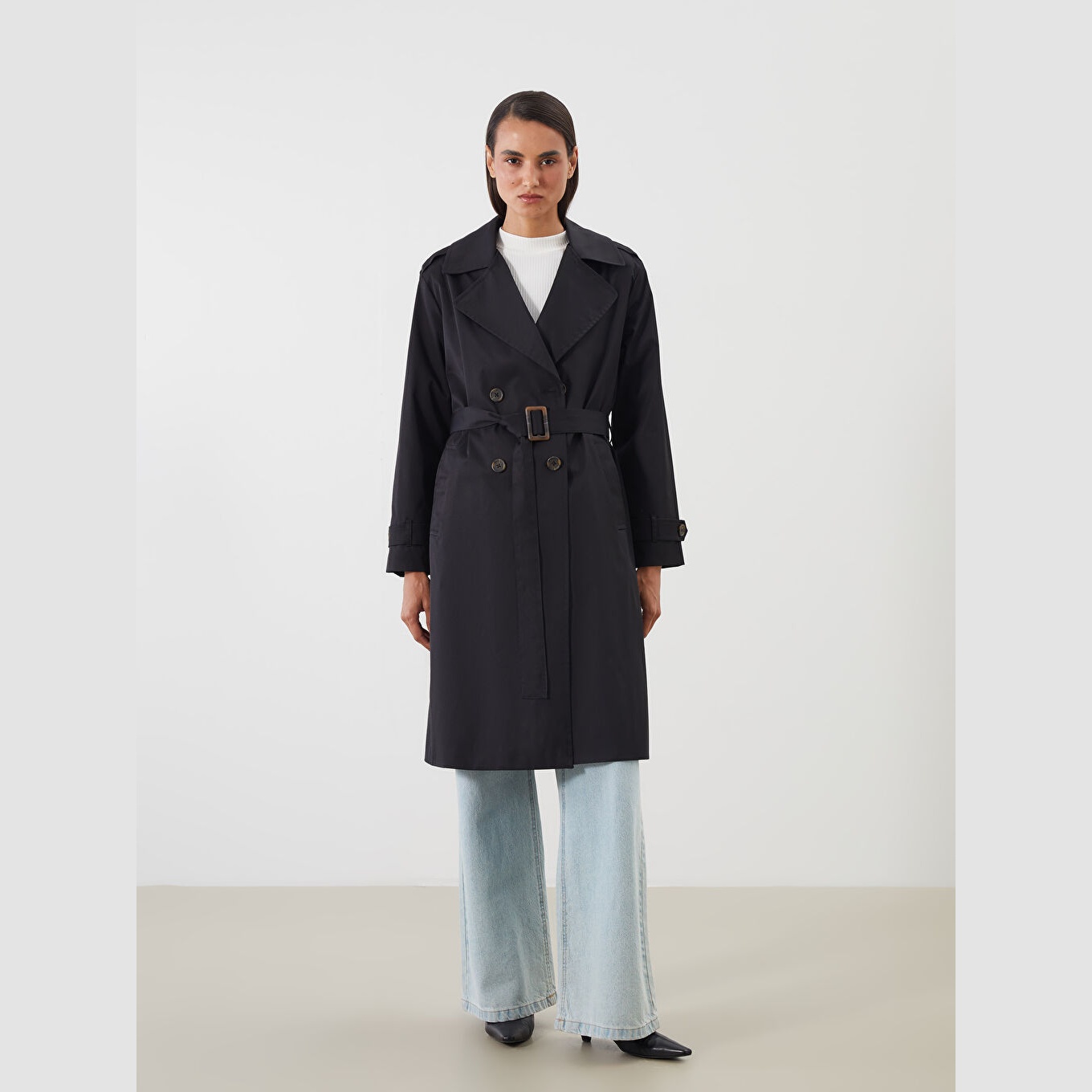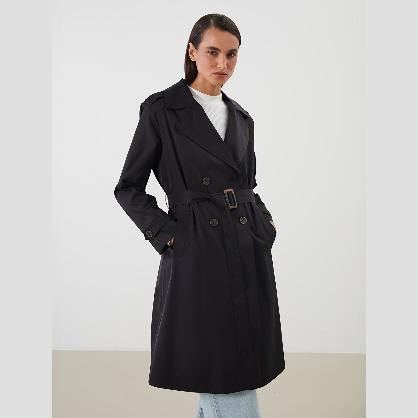 ترنش كوت نسائي بياقة مزدوجة من LCWAIKIKI Classic – أسود (قصة واسعة، تصميم رسمي متوسط الطول، خامة جاباردين ناعمة مبطّنة بالكامل، مزود بحزام خصر، مثالي للإطلالات الخريفية والرسمية)
