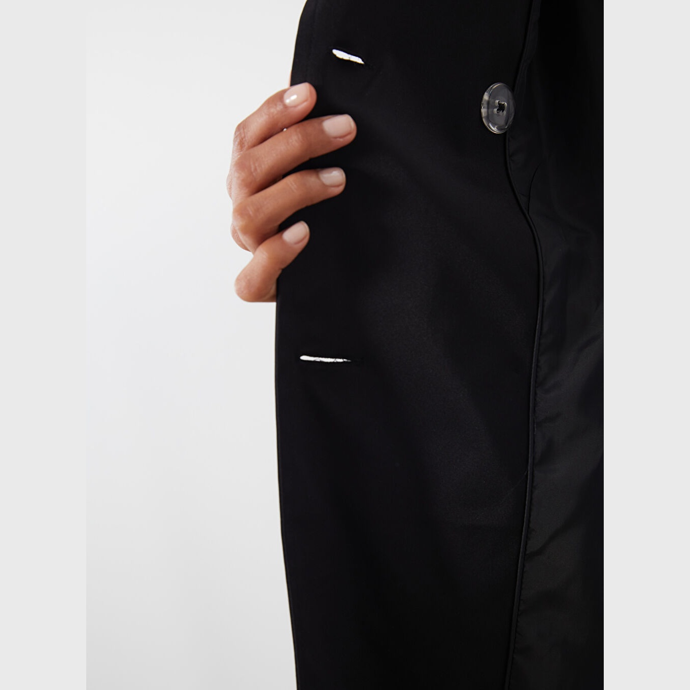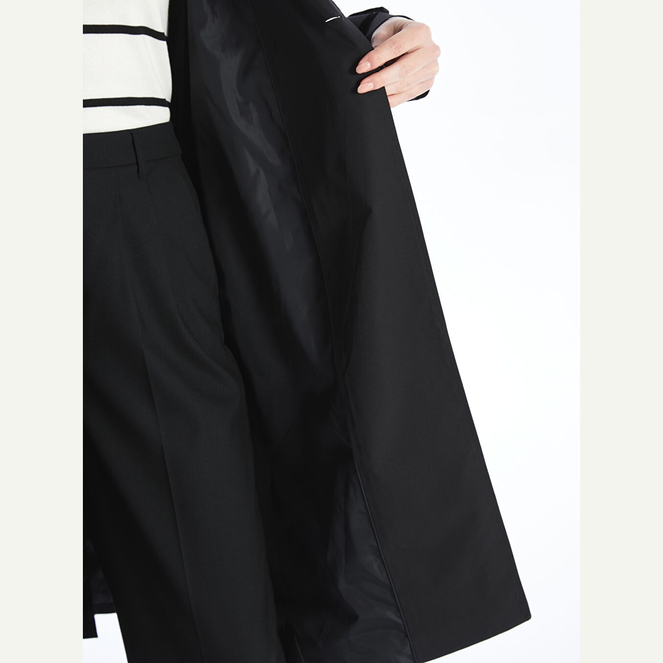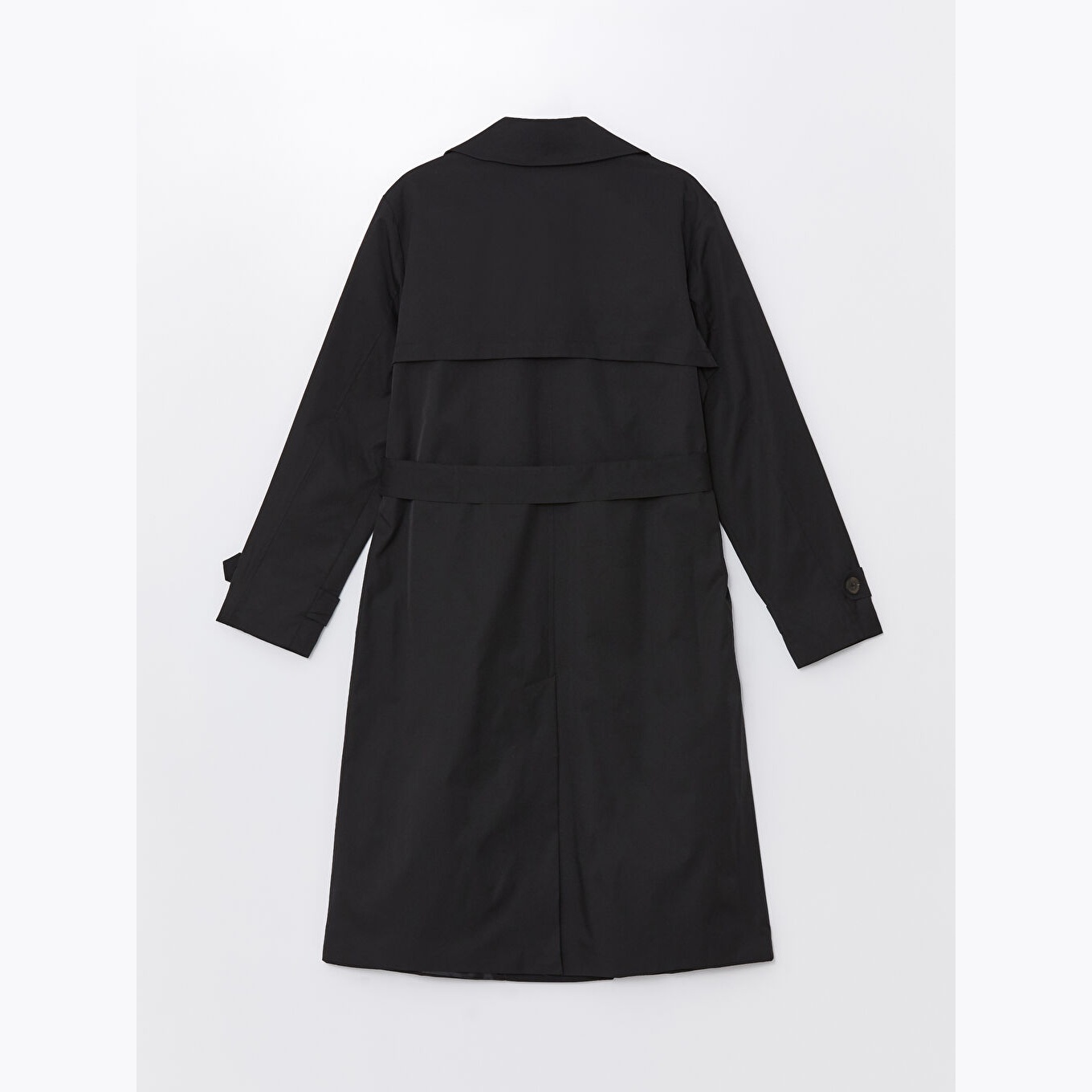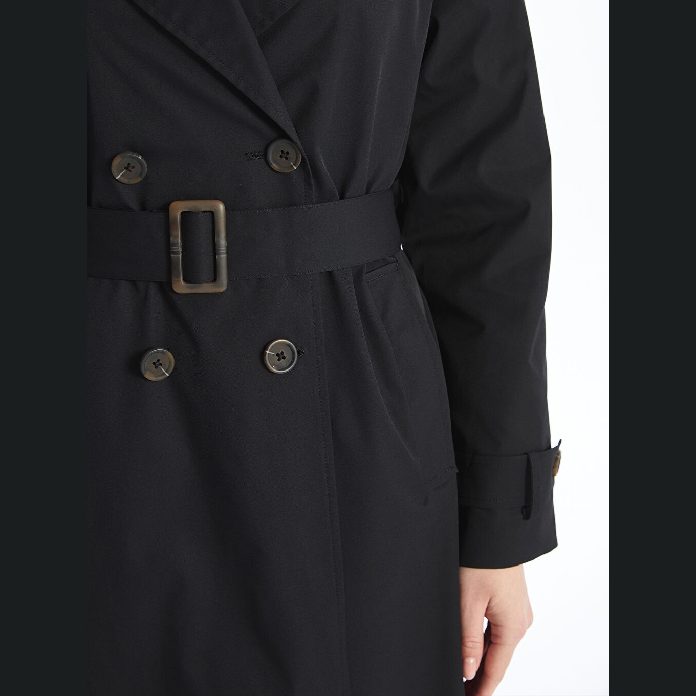 ترنش كوت نسائي بياقة مزدوجة من LCWAIKIKI Classic – أسود (قصة واسعة، تصميم رسمي متوسط الطول، خامة جاباردين ناعمة مبطّنة بالكامل، مزود بحزام خصر، مثالي للإطلالات الخريفية والرسمية)