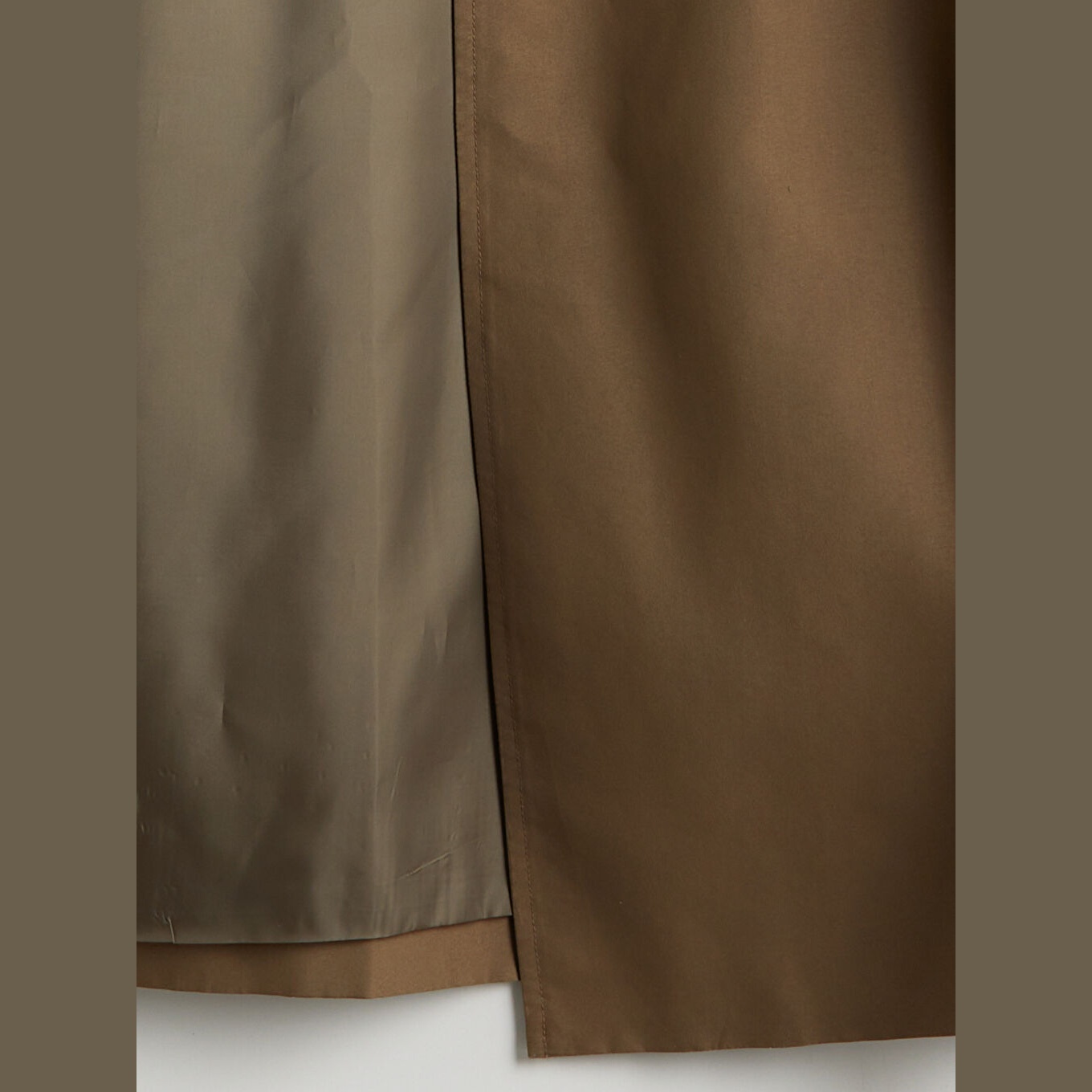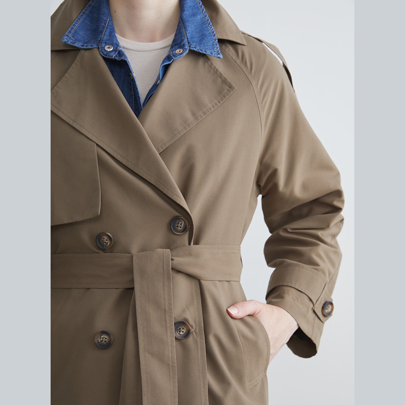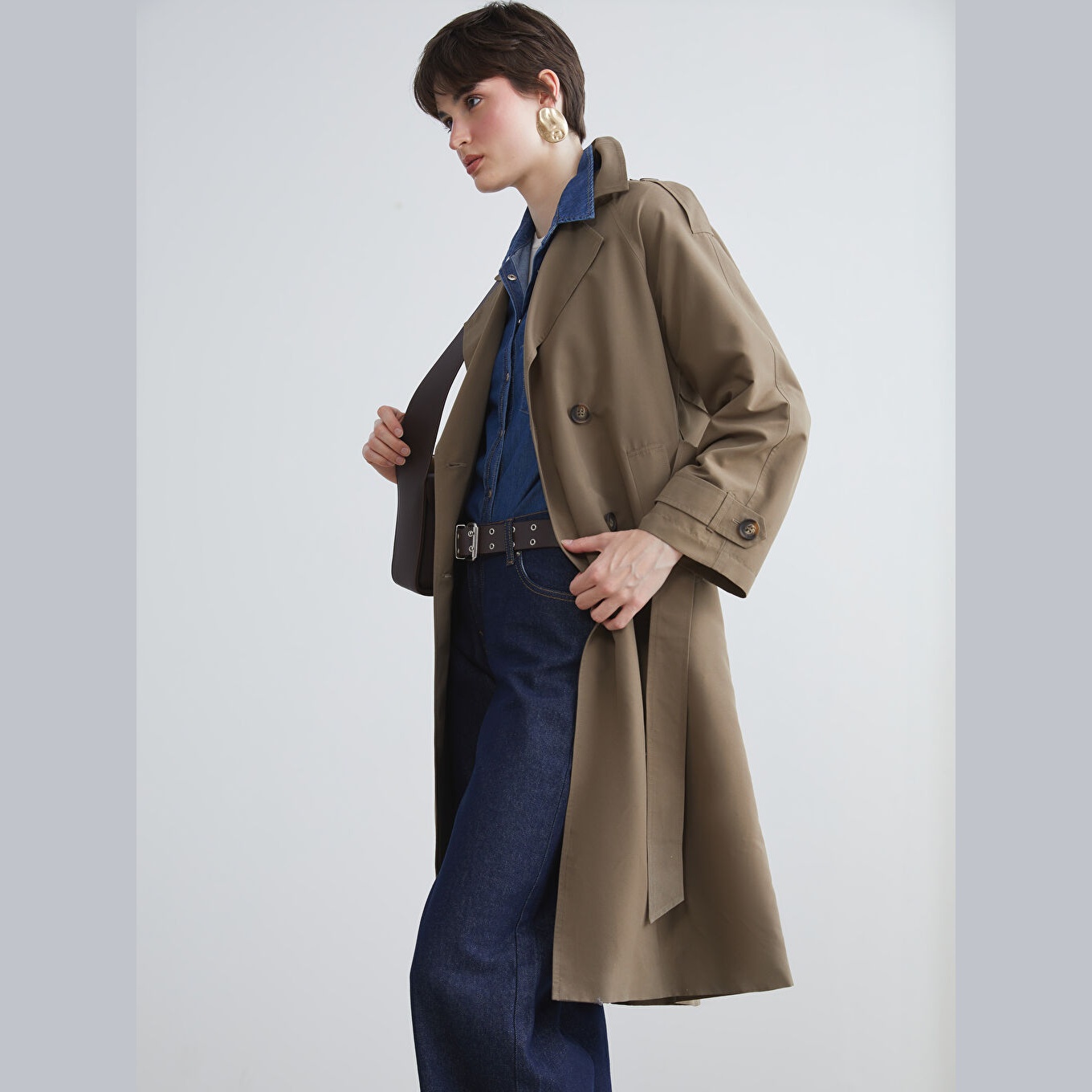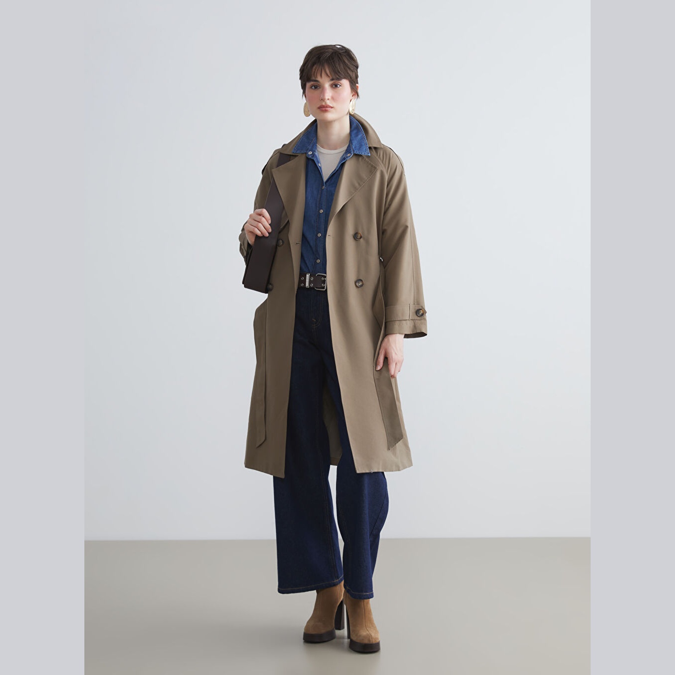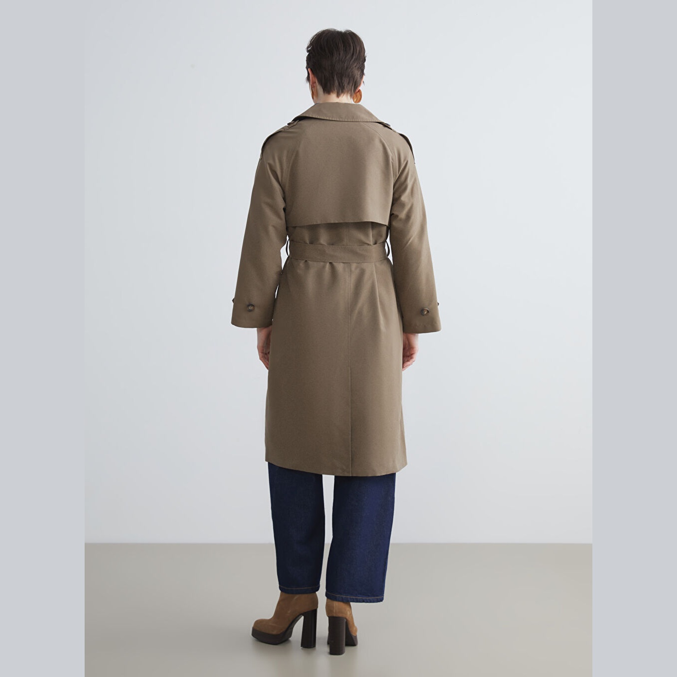 ترنش كوت نسائي بياقة جاكيت من LCW Vision – زيتي (قصة واسعة، تصميم ترندي طويل، خامة ناعمة مبطّنة بالكامل، مزود بحزام خصر، مثالي للإطلالات العصرية والمحتشمة)