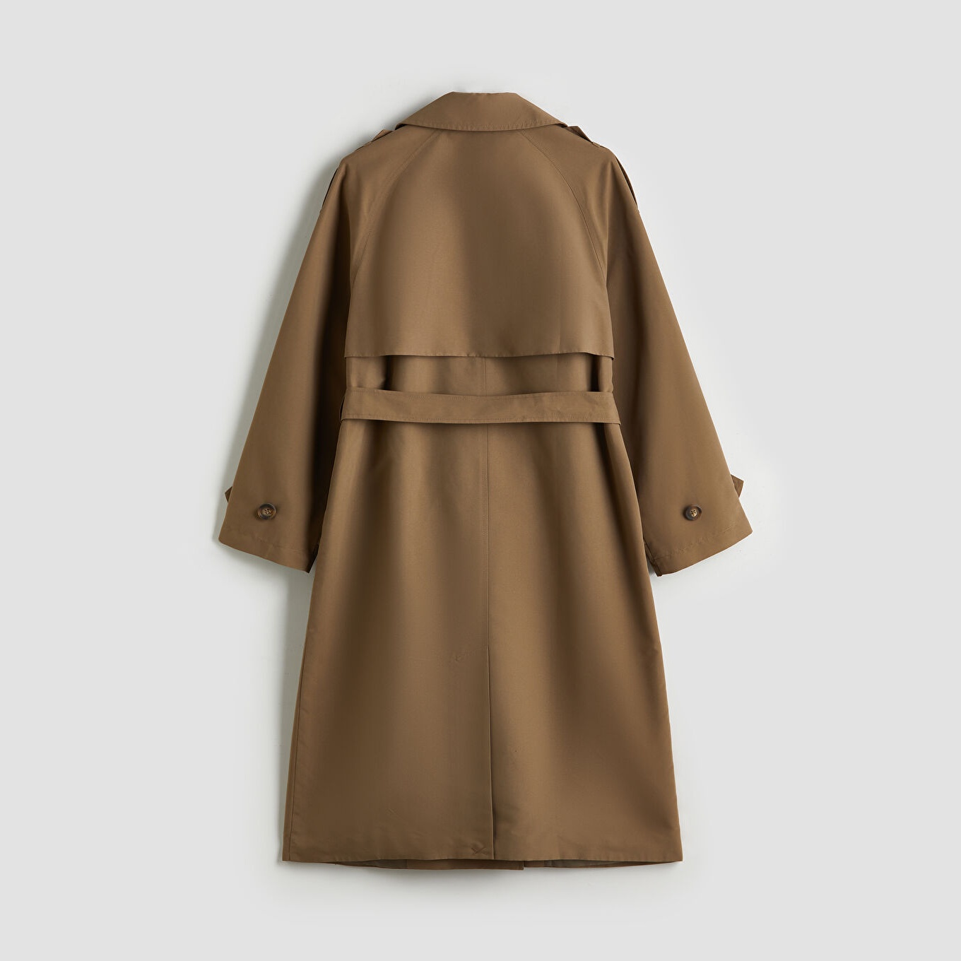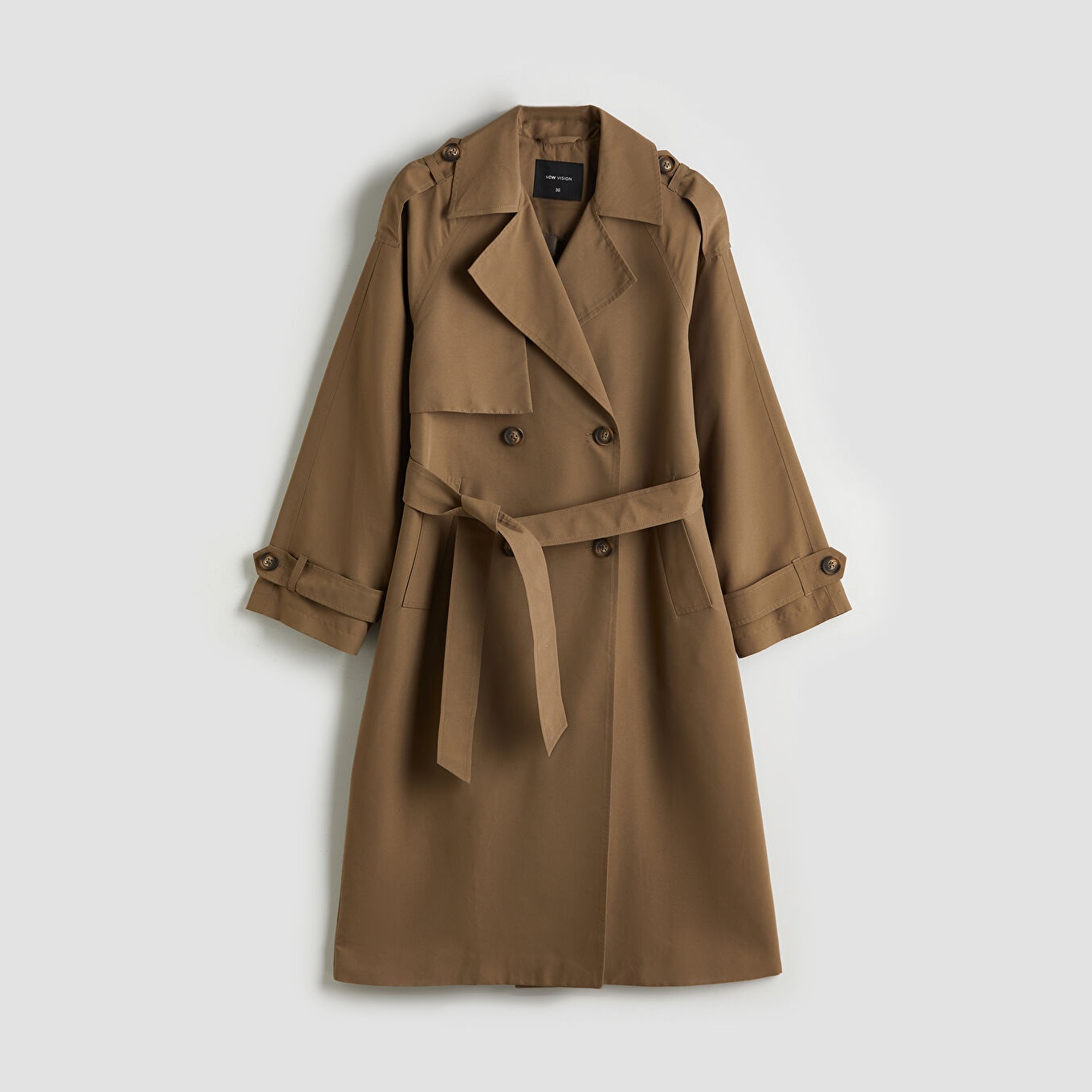 معطف ترنش بلون زيتي (Haki) من مجموعة LCW Vision – ترند الموسم، مصمم بياقة جاكيت كلاسيكية (Ceket Yaka) تضيف لمسة رسمية أنيقة، قصة واسعة (Loose Fit) تمنحك مظهرًا محتشمًا وانسيابيًا، خامة ناعمة من %100 بوليستر، مبطّن بالكامل بـ%100 بوليستر، تصميم سادة بدون نقوش، بطول طويل يُقاس من الكتف، بدون قبعة، مزود بحزام خصر خارجي، يتكون من قطعتين (المعطف + الحزام)، مثالي للإطلالات اليومية أو الرسمية في الأجواء المعتدلة.