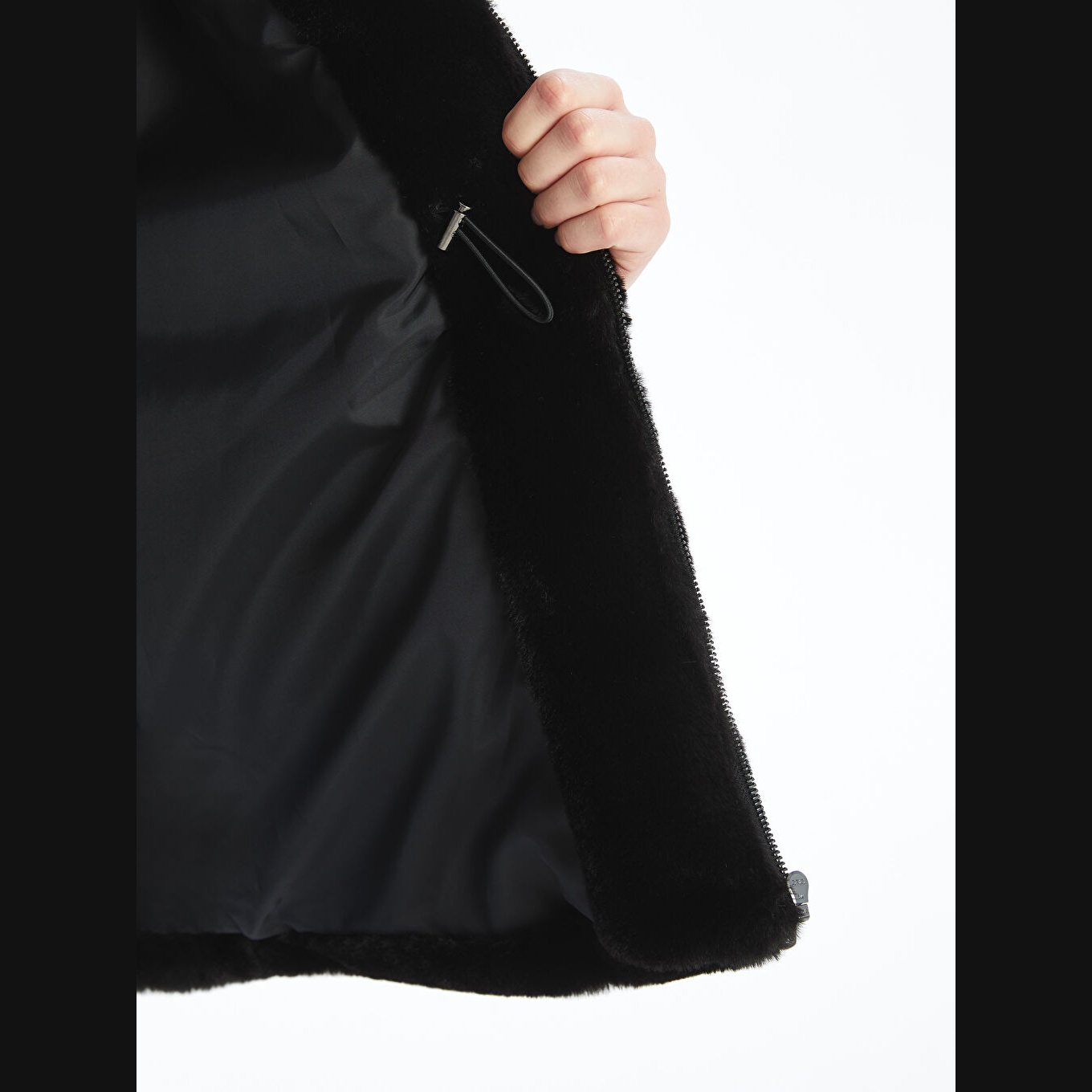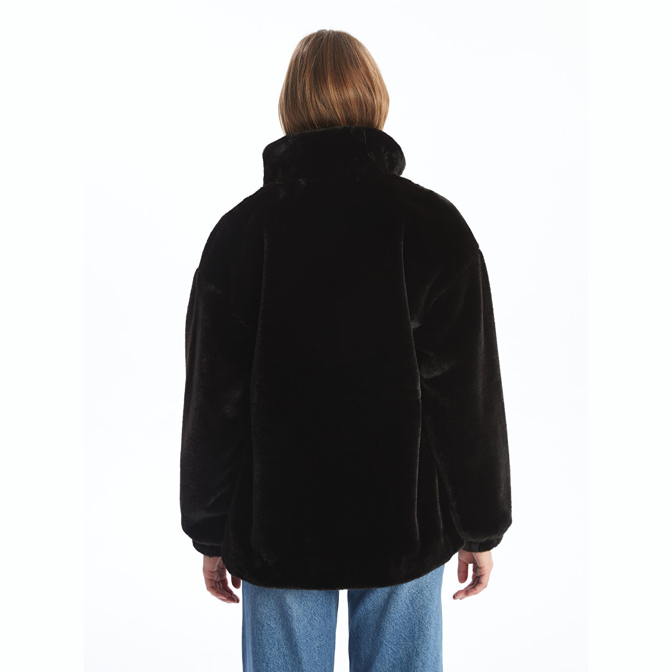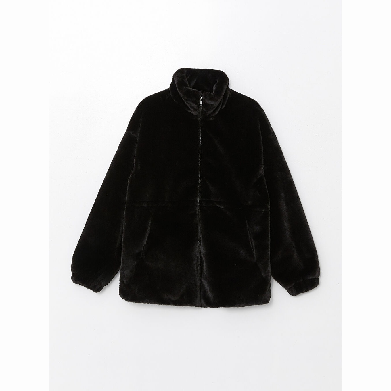 معطف نسائي بياقة مستقيمة من LCW Vision – أسود (قصة واسعة، تصميم شتوي متوسط الطول، خامة فرو صناعي ناعمة، مبطّن بالكامل، مثالي للإطلالات الفاخرة والدافئة)