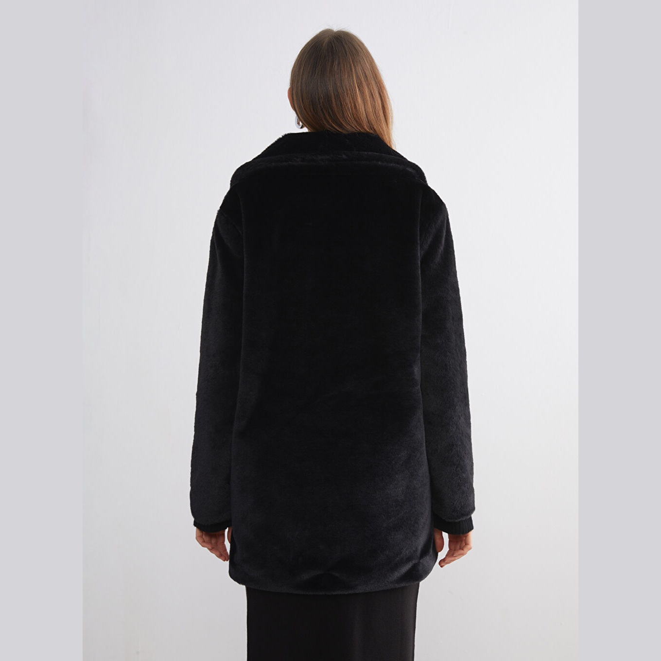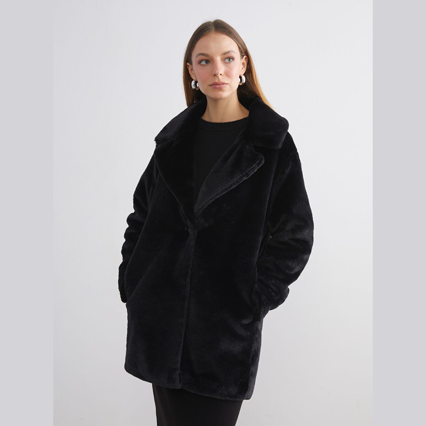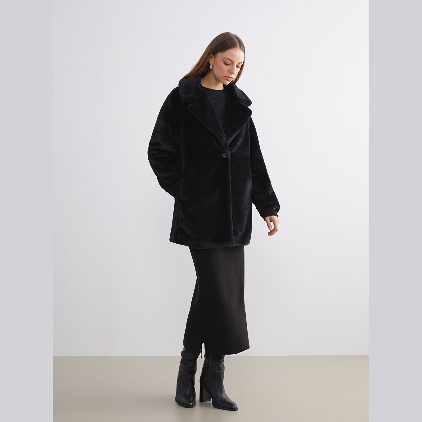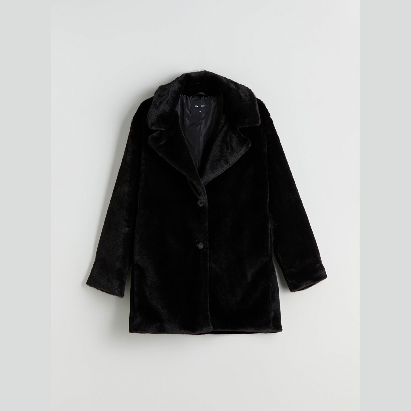 معطف نسائي بياقة جاكيت من LCW Modest – أسود (قصة واسعة، تصميم شتوي متوسط الطول، خامة فرو صناعي سميكة، مبطّن بالكامل، مزود بأزرار أمامية، مثالي للإطلالات المحتشمة والدافئة)