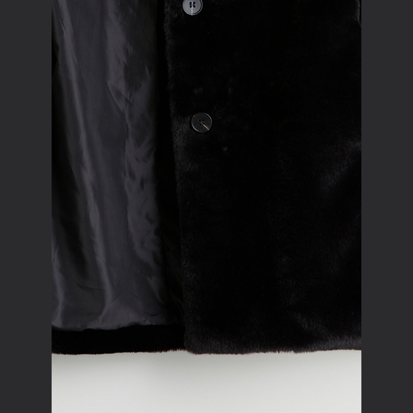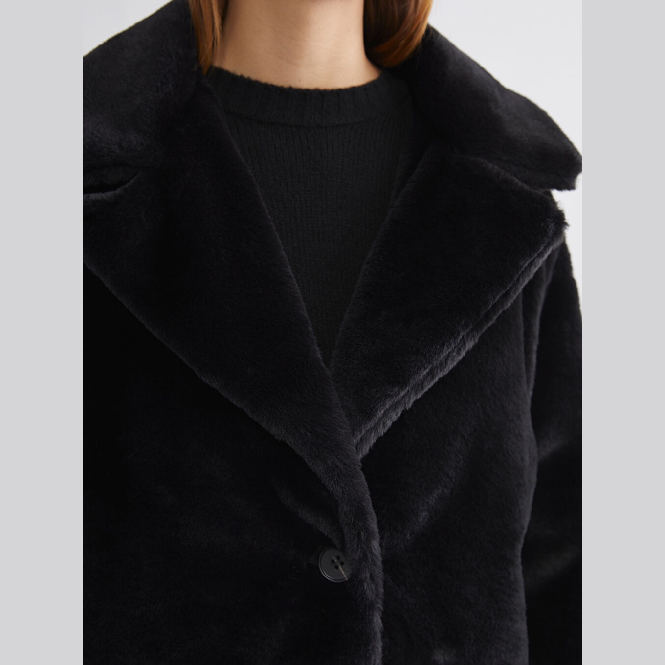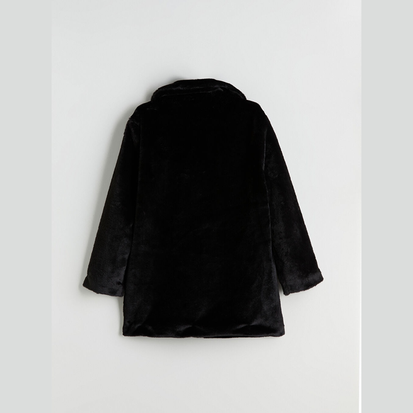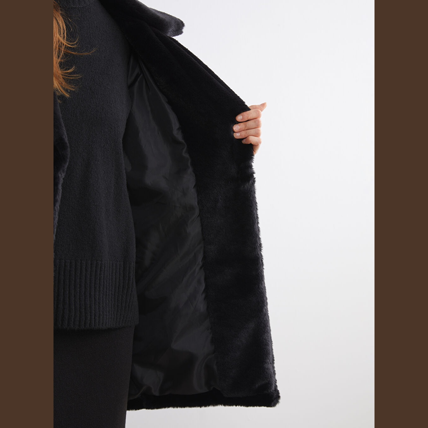 معطف نسائي بياقة جاكيت من LCW Modest – أسود (قصة واسعة، تصميم شتوي متوسط الطول، خامة فرو صناعي سميكة، مبطّن بالكامل، مزود بأزرار أمامية، مثالي للإطلالات المحتشمة والدافئة)