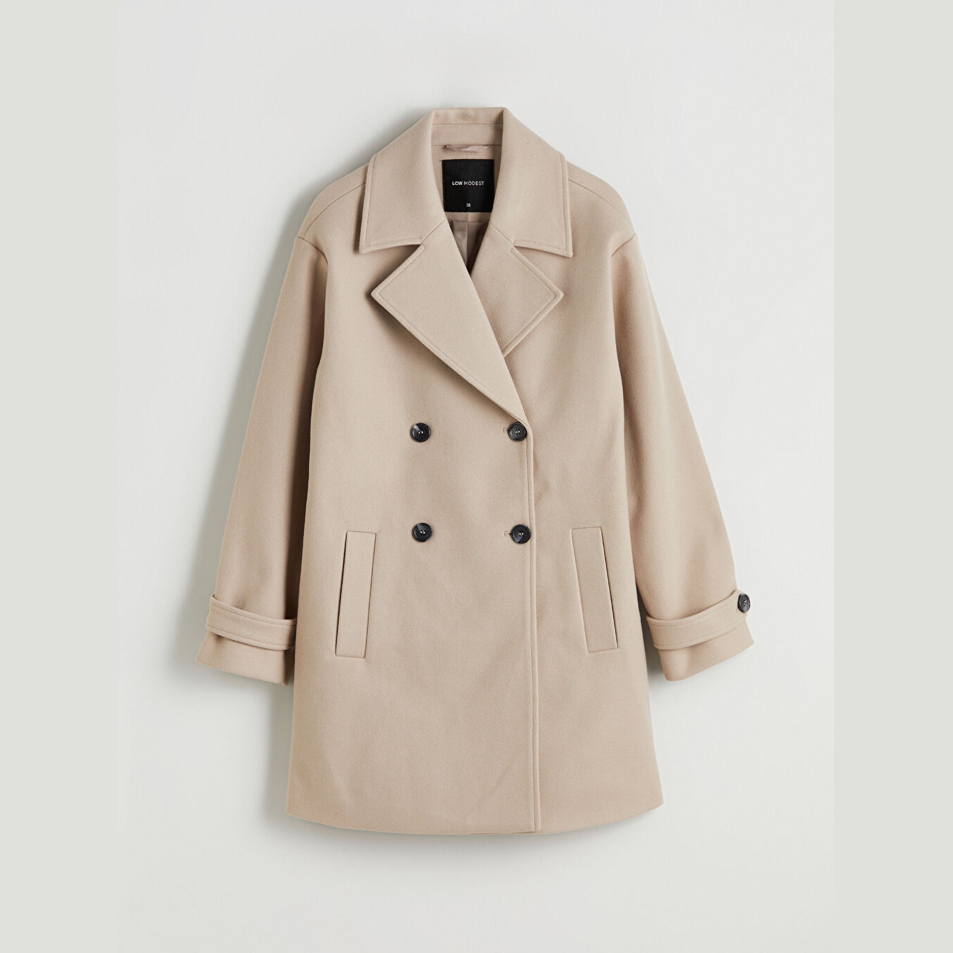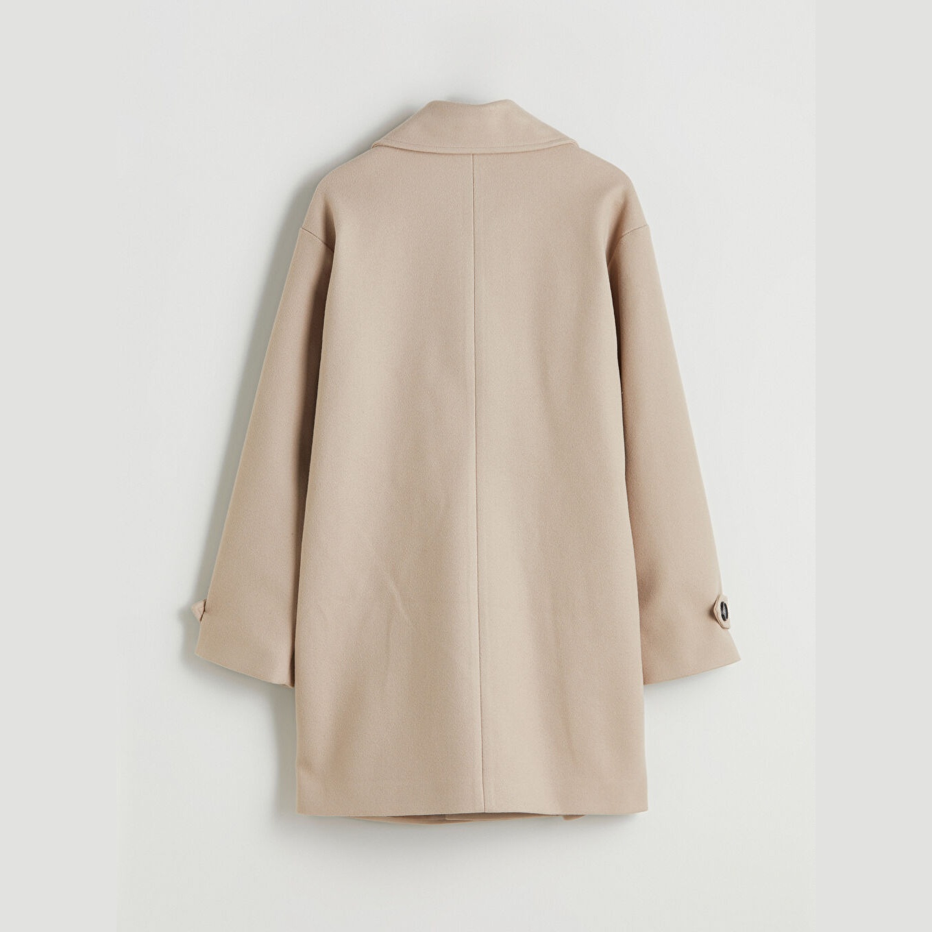 معطف نسائي بياقة جاكيت من LCW Modest – بيج (قصة واسعة، تصميم شتوي متوسط الطول، خامة كاشمير صناعي سميكة، مبطّن بالكامل، مزود بأزرار أمامية، مثالي للإطلالات المحتشمة والدافئة)