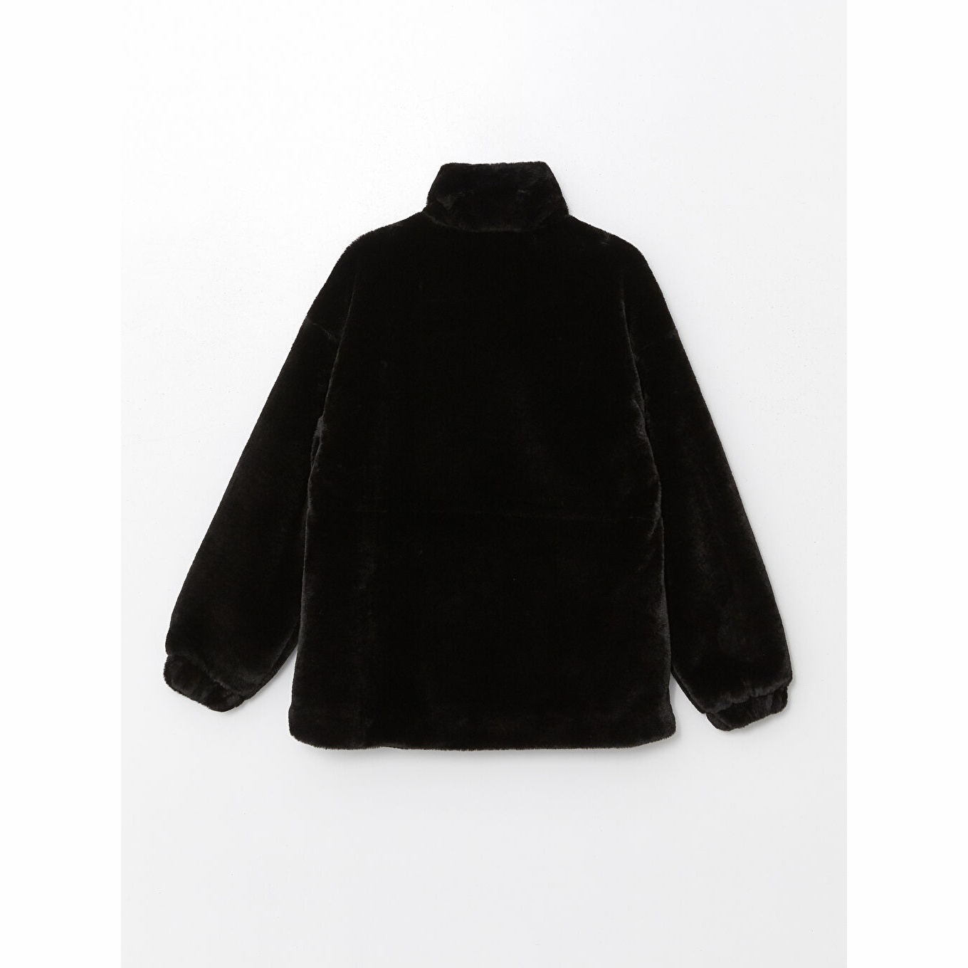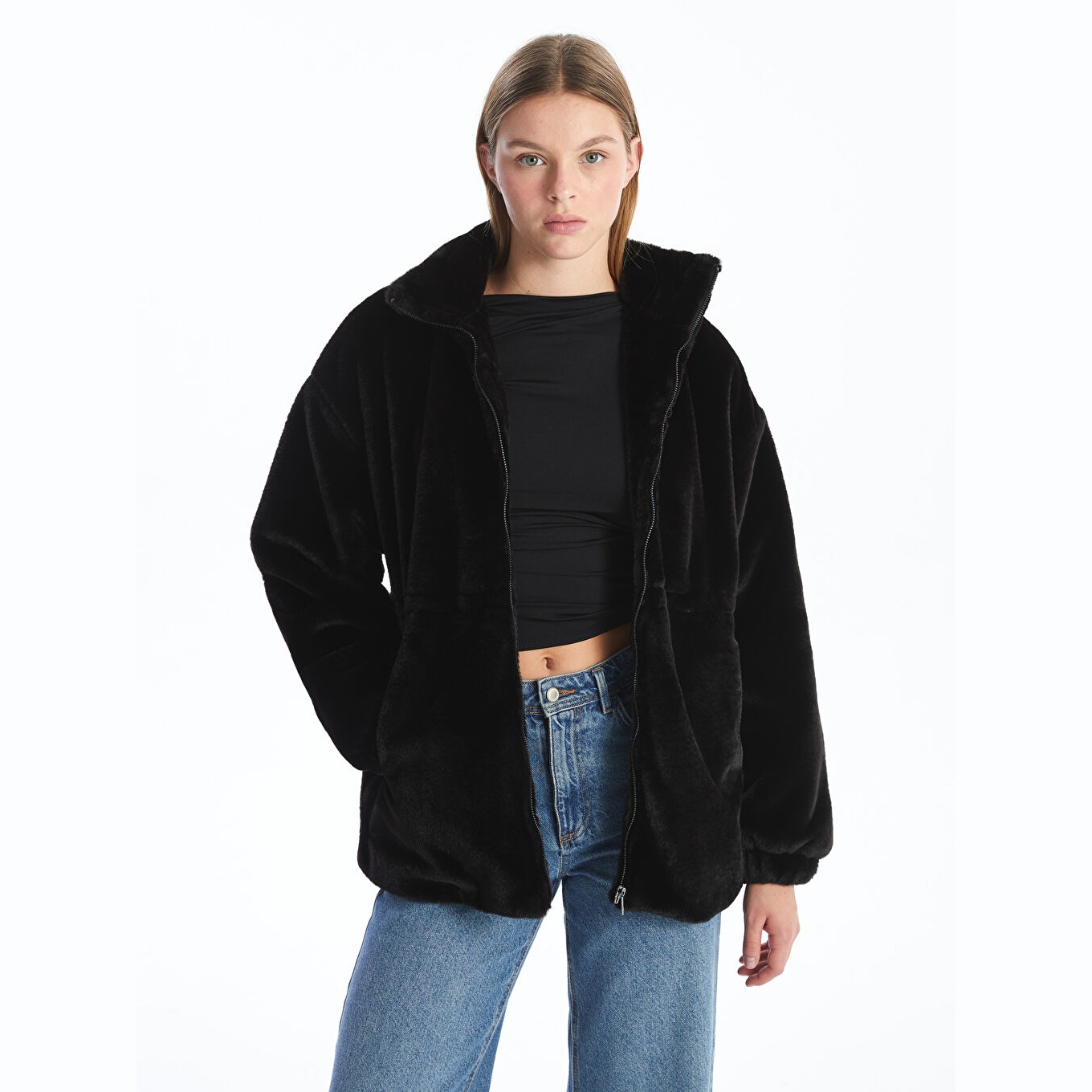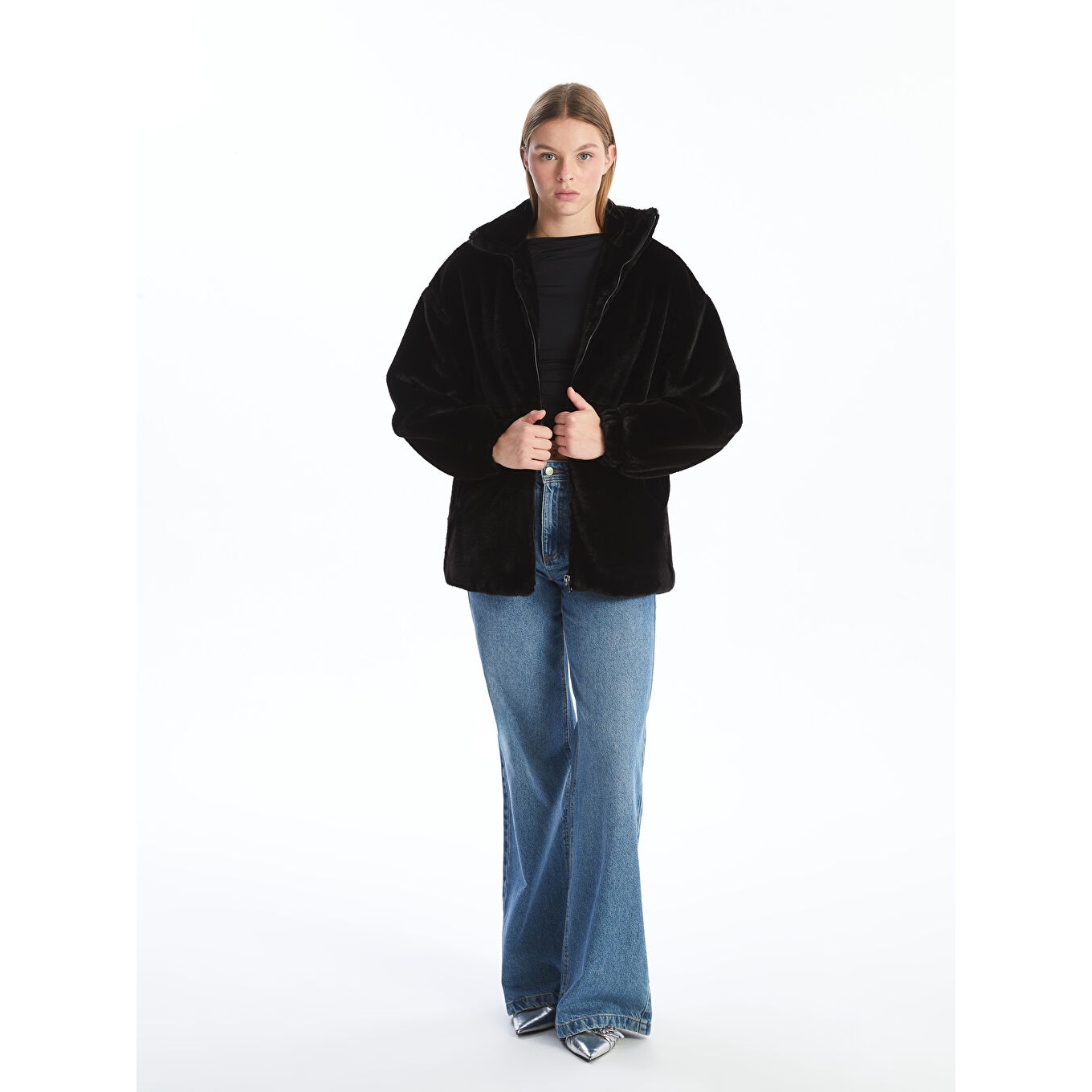 معطف نسائي بياقة مستقيمة من LCW Vision – أسود (قصة واسعة، تصميم شتوي متوسط الطول، خامة فرو صناعي متوسطة السماكة، مبطّن بالكامل، بدون قبعة، مزود بأزرار أمامية، مثالي للإطلالات المحتشمة والأنيقة)