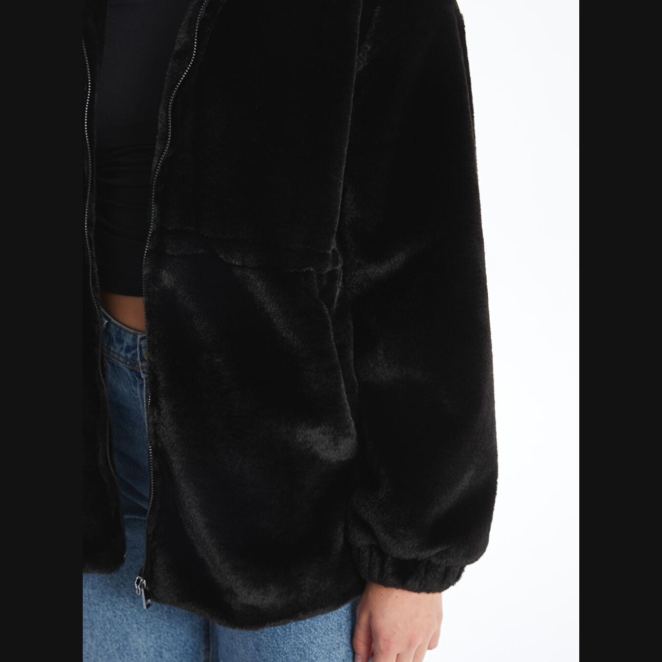 معطف بلون أسود من مجموعة LCW Vision، مصمم بياقة مستقيمة تضيف لمسة أنيقة وعصرية، قصة واسعة تمنحك مظهرًا محتشمًا وانسيابيًا، خامة فرو صناعي من %100 بوليستر، مبطّن بالكامل بـ%100 بوليستر، تصميم سادة بدون نقوش، بطول ميدي يُقاس من الكتف، بدون قبعة، مزود بأزرار أمامية، مثالي للإطلالات الشتوية الرسمية أو اليومية.