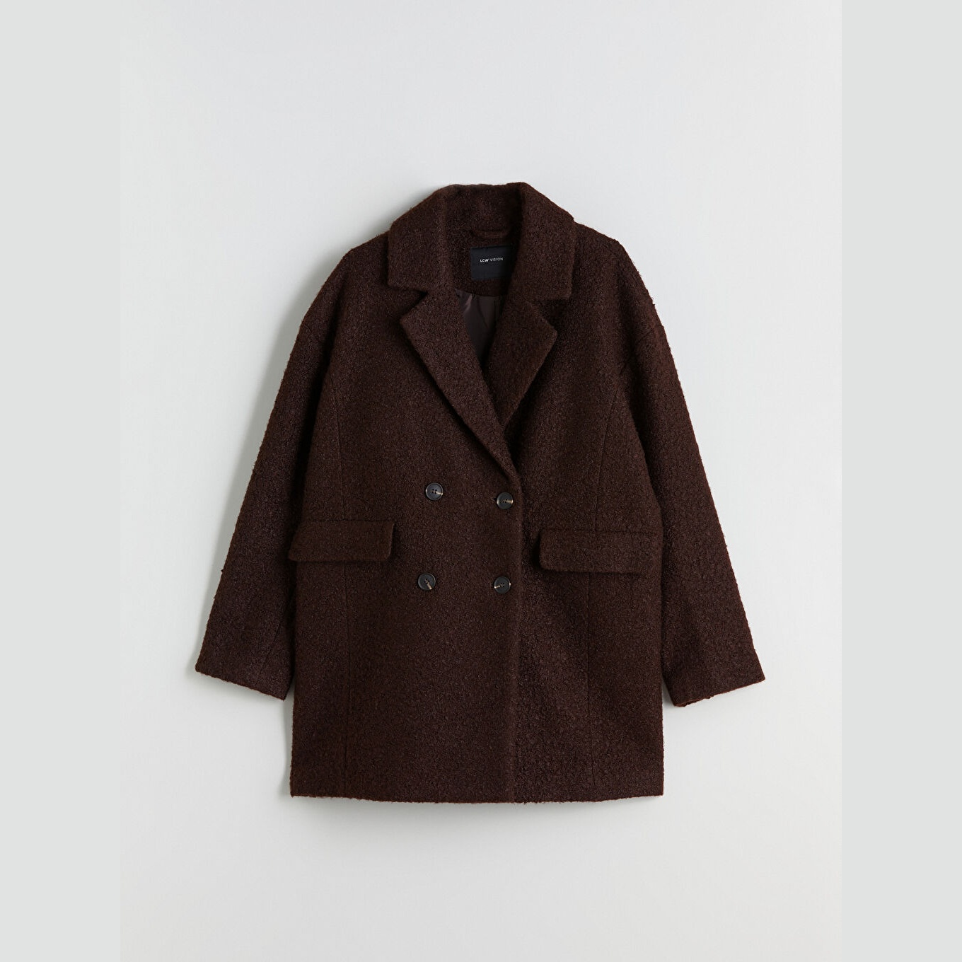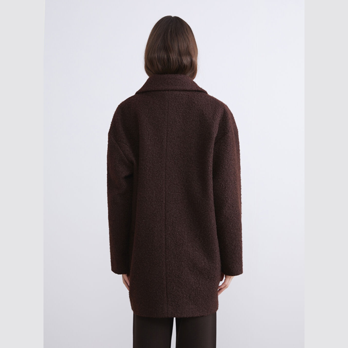 معطف نسائي بياقة كروّاز من LCW Vision – بني (قصة واسعة، تصميم شتوي متوسط الطول، خامة كاشمير صناعي سميكة، مبطّن بالكامل، بدون قبعة، مزود بأزرار أمامية، مثالي للإطلالات الرسمية والدافئة)