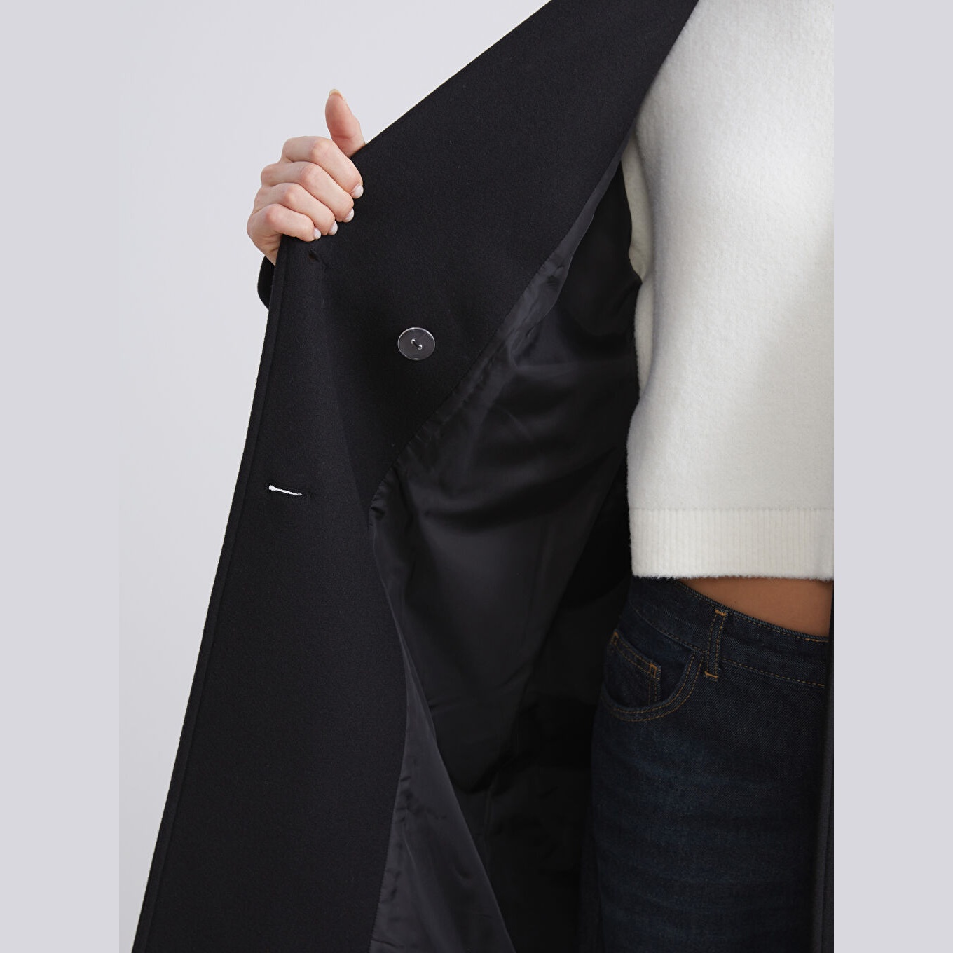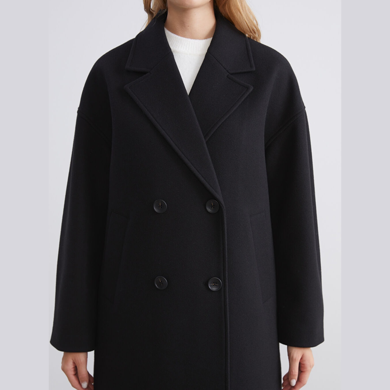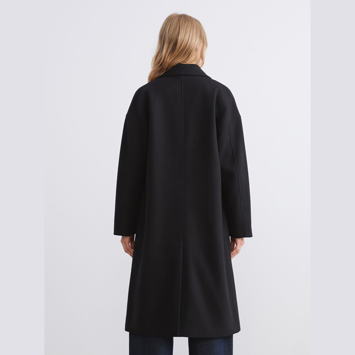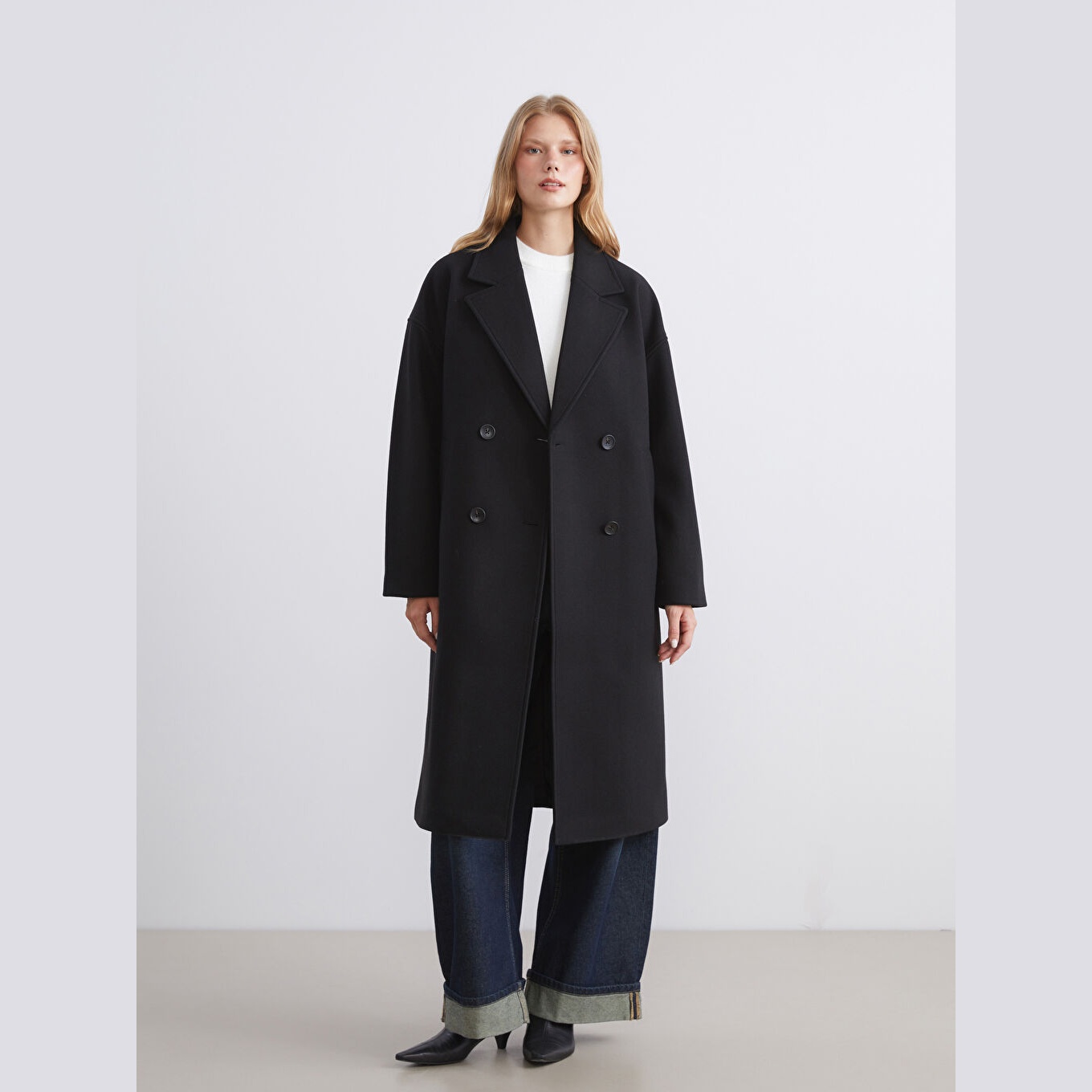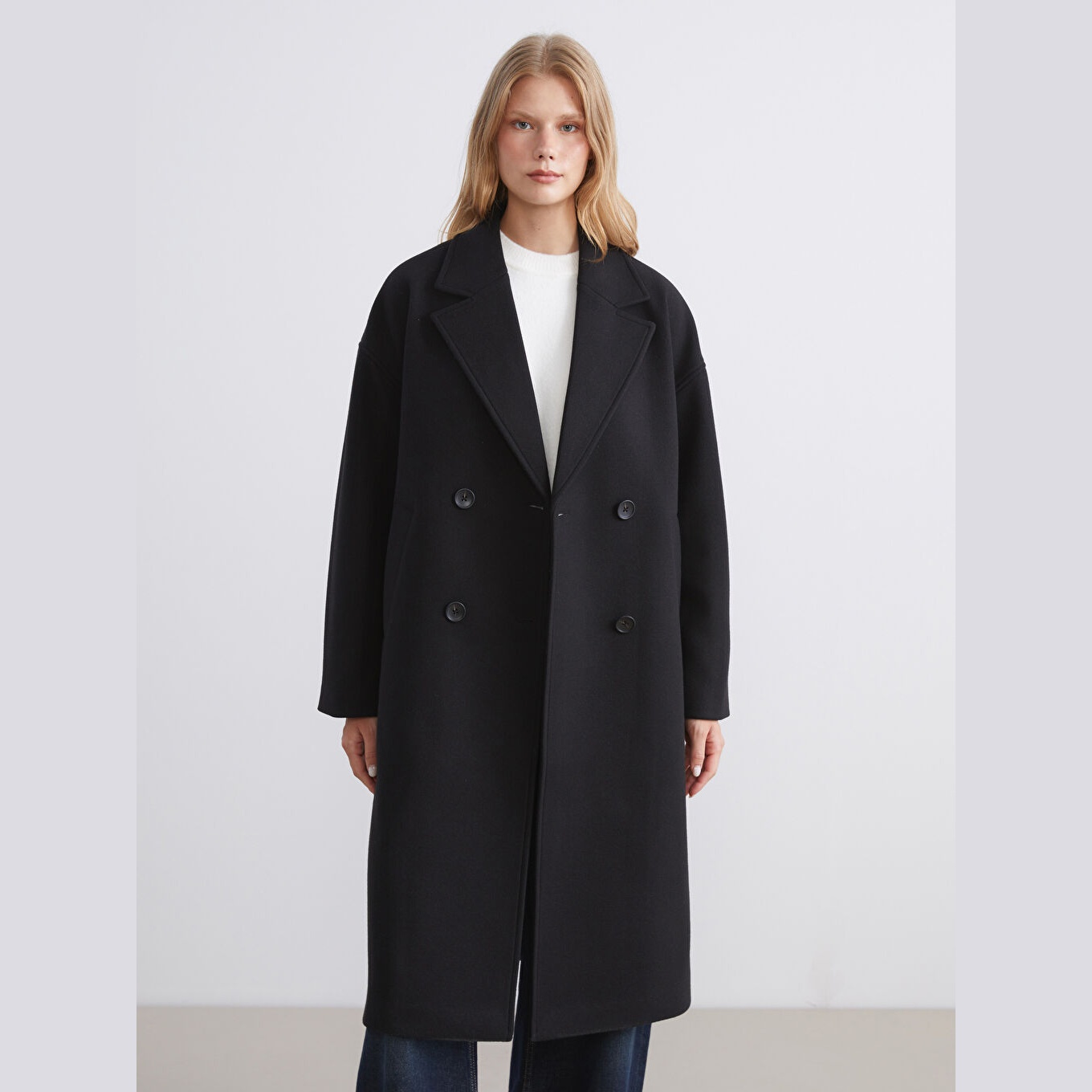 معطف نسائي بياقة كروّاز من LCW Vision – أسود (قصة واسعة، تصميم شتوي متوسط الطول، خامة كاشمير صناعي سميكة، مبطّن بالكامل، بدون قبعة، مزود بأزرار أمامية، مثالي للإطلالات الرسمية والدافئة)