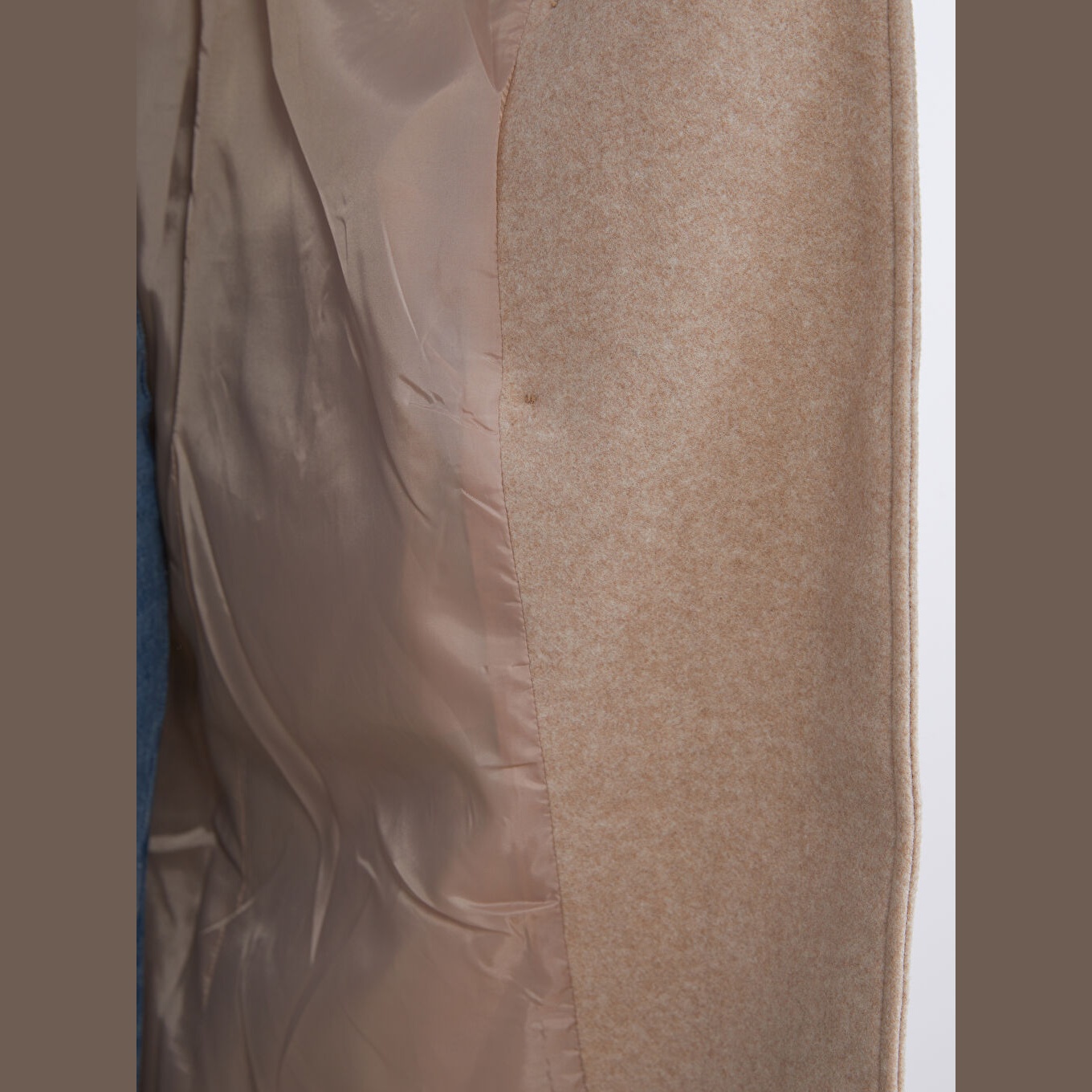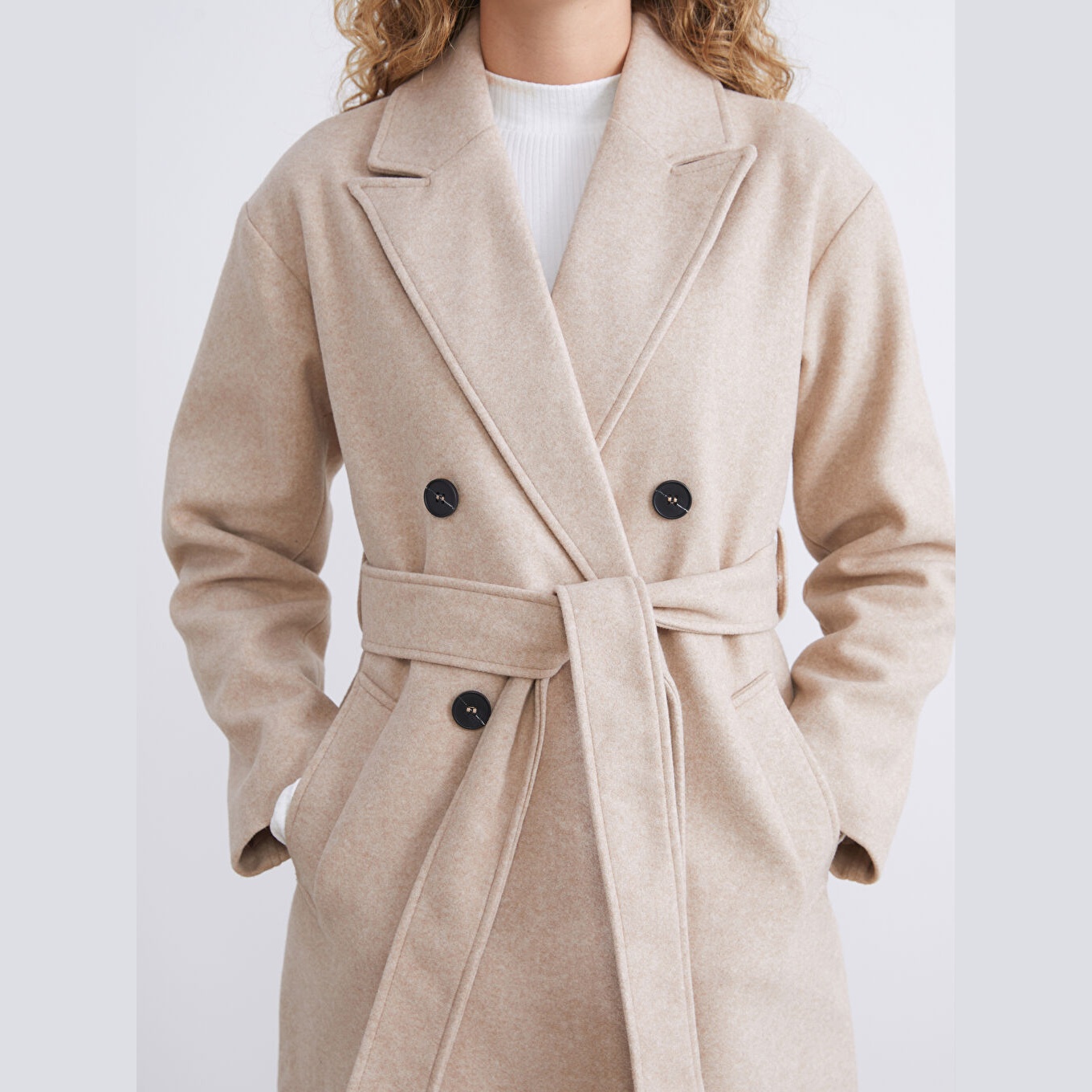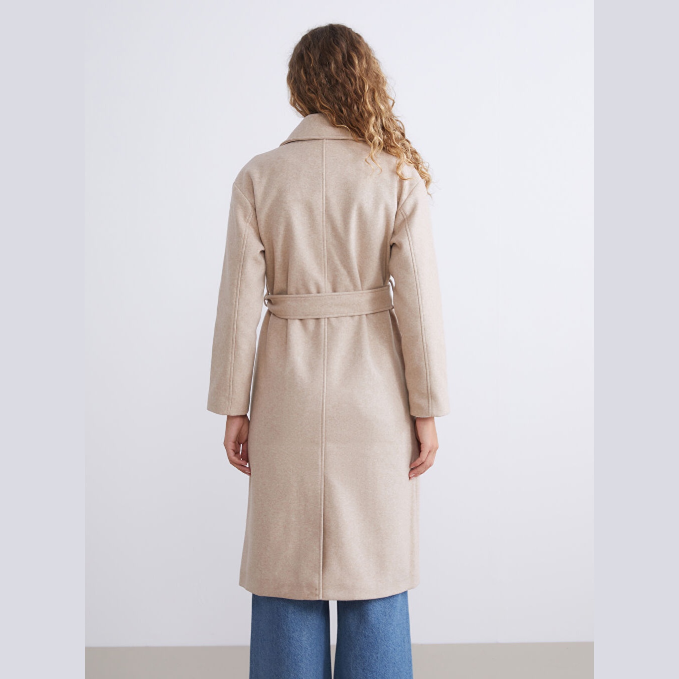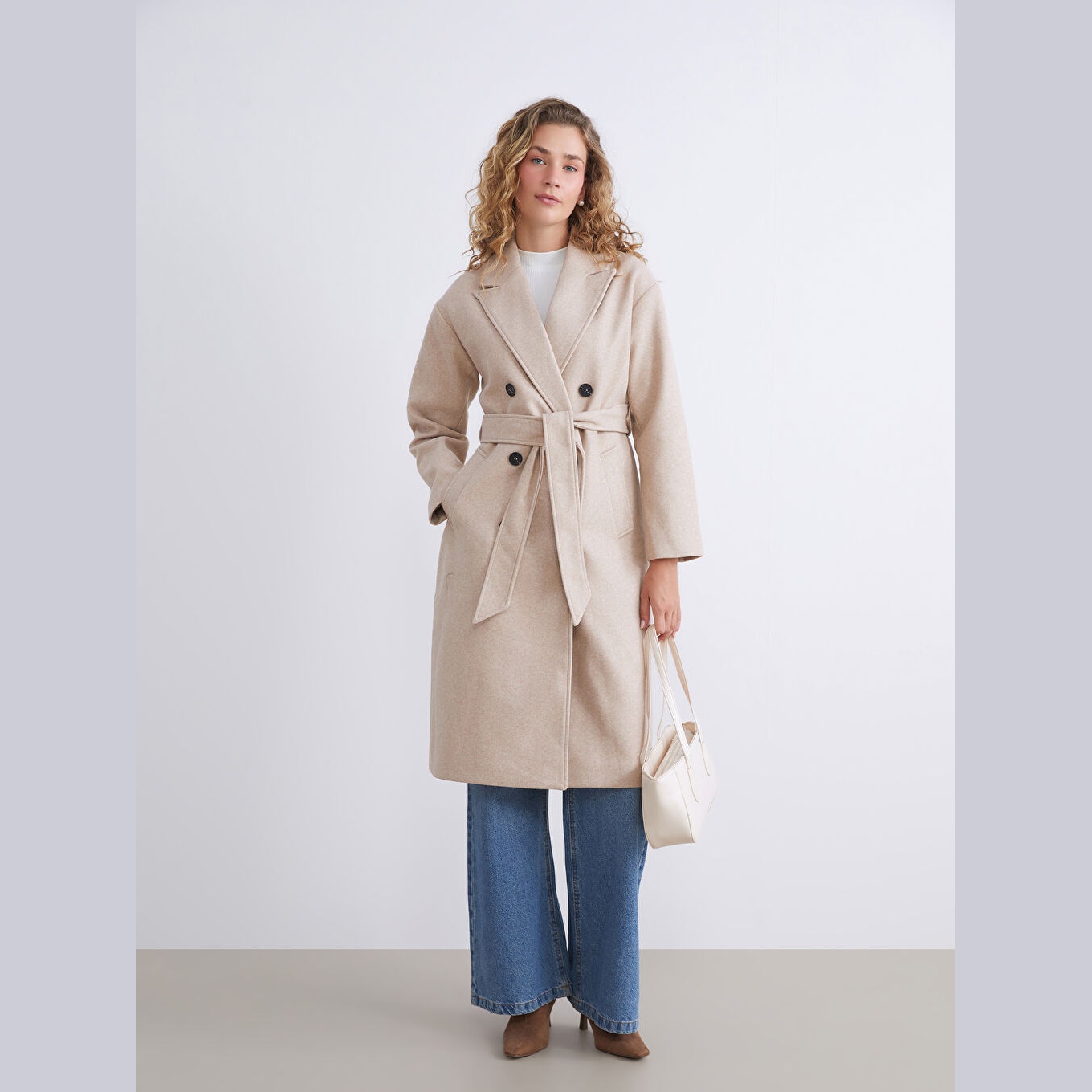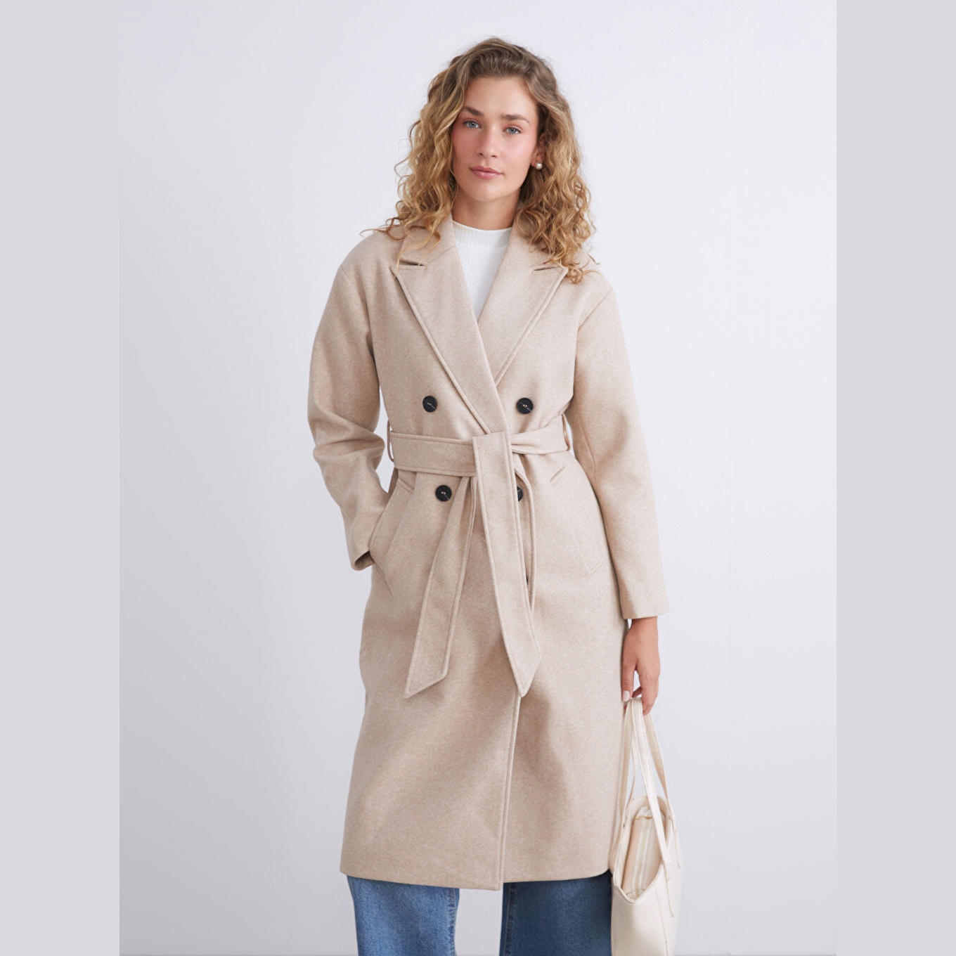 معطف نسائي بياقة جاكيت من LCW Modest – بيج (قصة واسعة، تصميم شتوي متوسط الطول، خامة كاشمير صناعي سميكة، مبطّن بالكامل، بدون قبعة، مزود بحزام خارجي وأزرار أمامية، مثالي للإطلالات المحتشمة والأنيقة ضمن مجموعة LCW Modest)