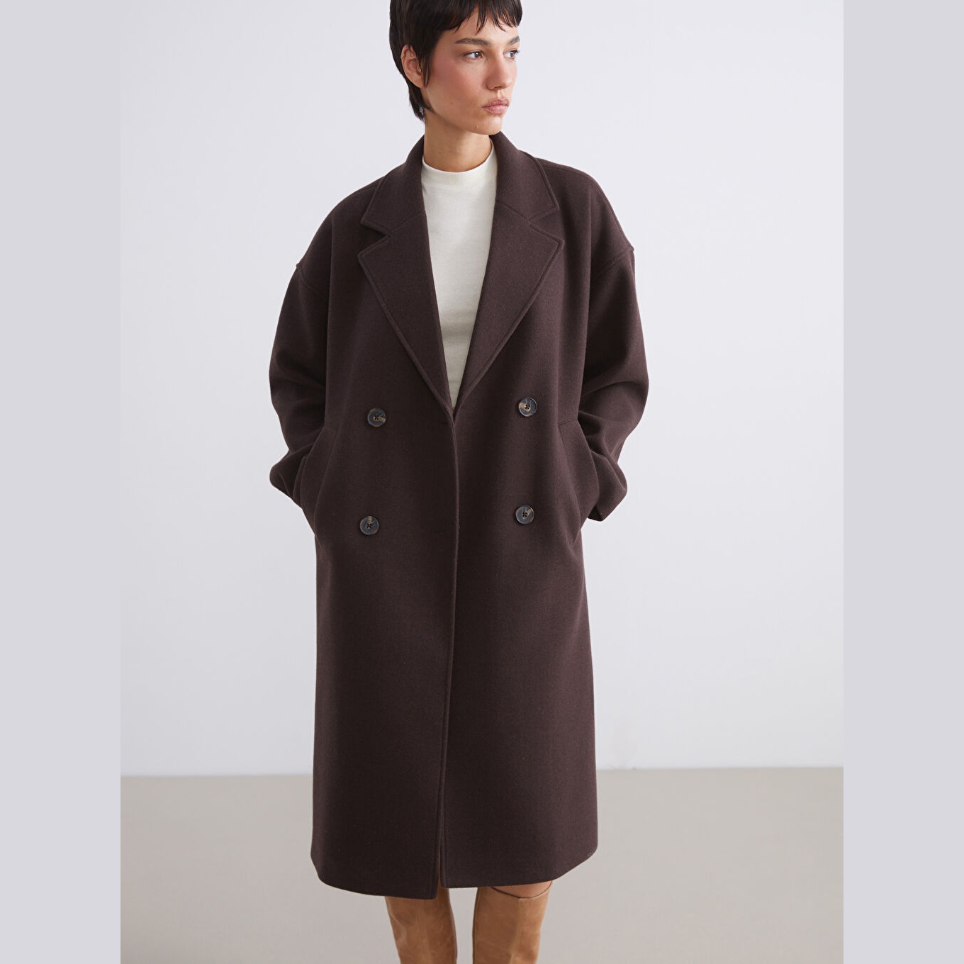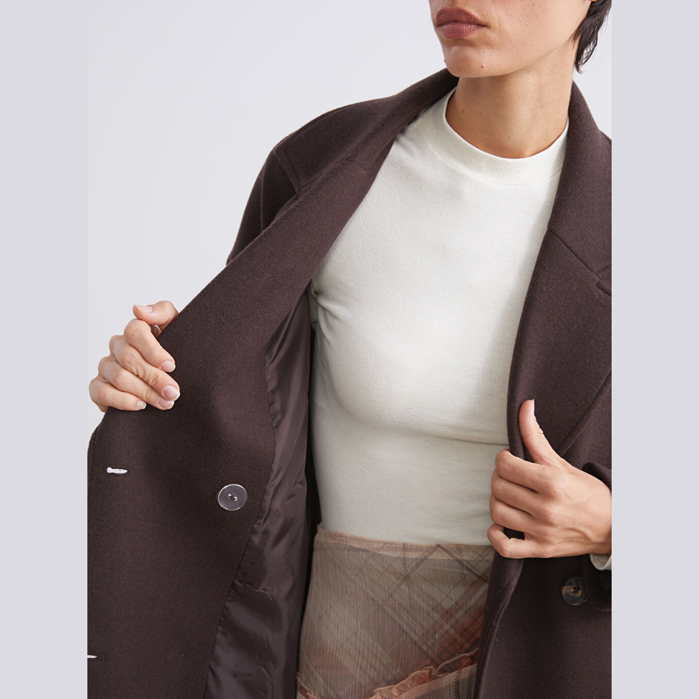 معطف بلون بني من مجموعة LCW Vision، مصمم بياقة كروّاز تضيف لمسة فاخرة وعصرية، قصة واسعة (Loose & Bol) تمنحك مظهرًا محتشمًا وانسيابيًا، خامة كاشمير صناعي من %100 بوليستر، مبطّن بالكامل بـ%100 بوليستر، تصميم سادة بدون نقوش، بطول ميدي يُقاس من الكتف، بدون قبعة، مزود بأزرار أمامية، مثالي للإطلالات الشتوية الرسمية أو العملية.