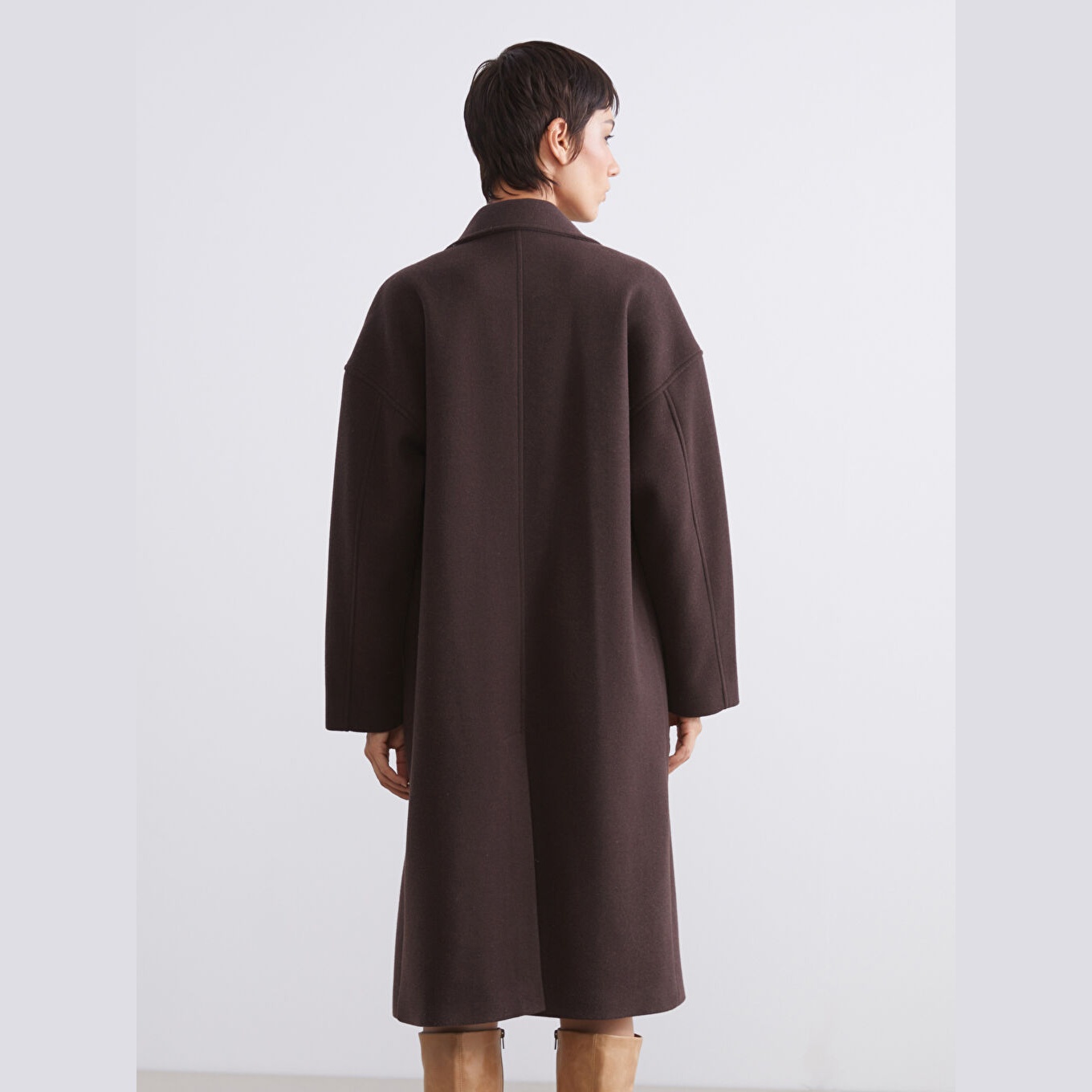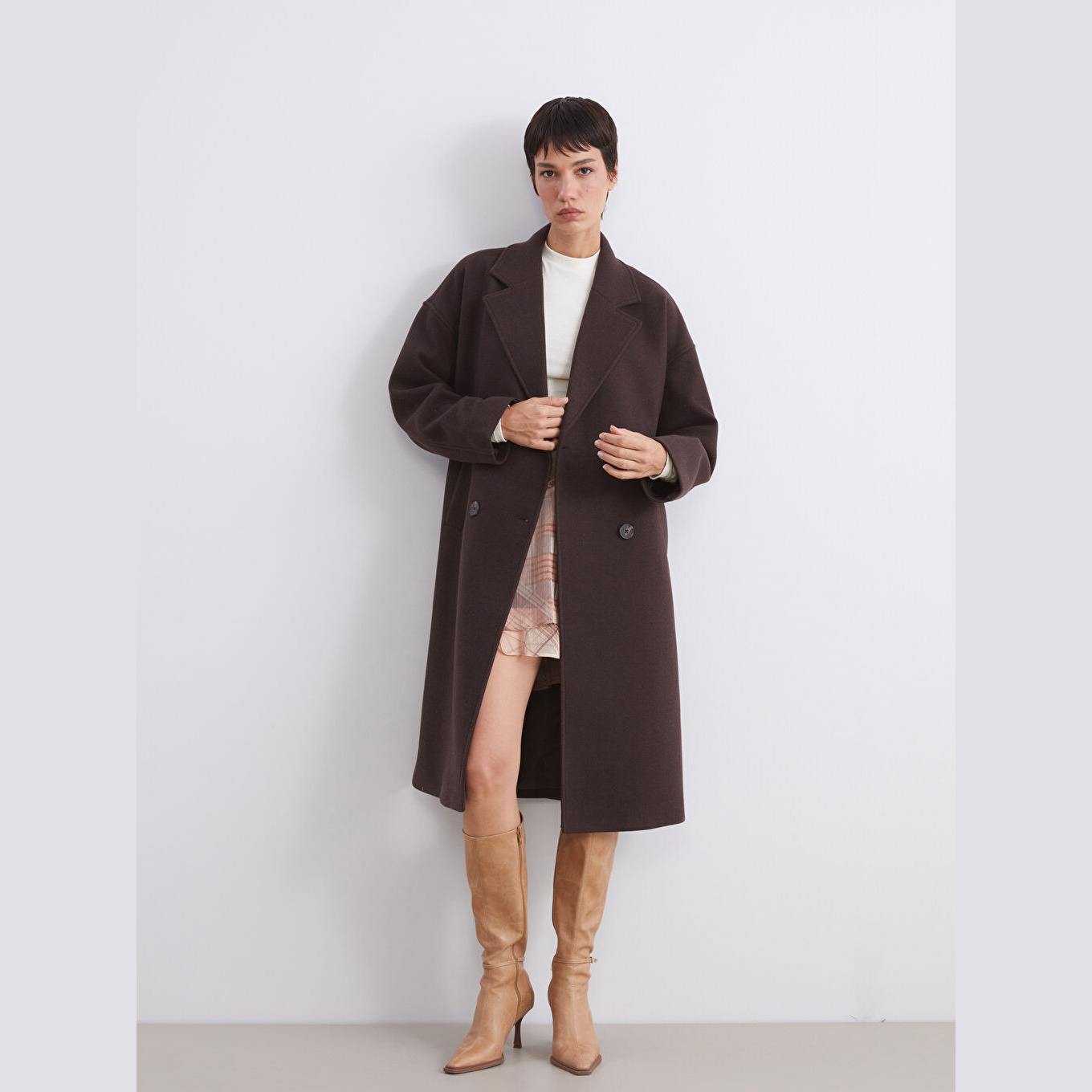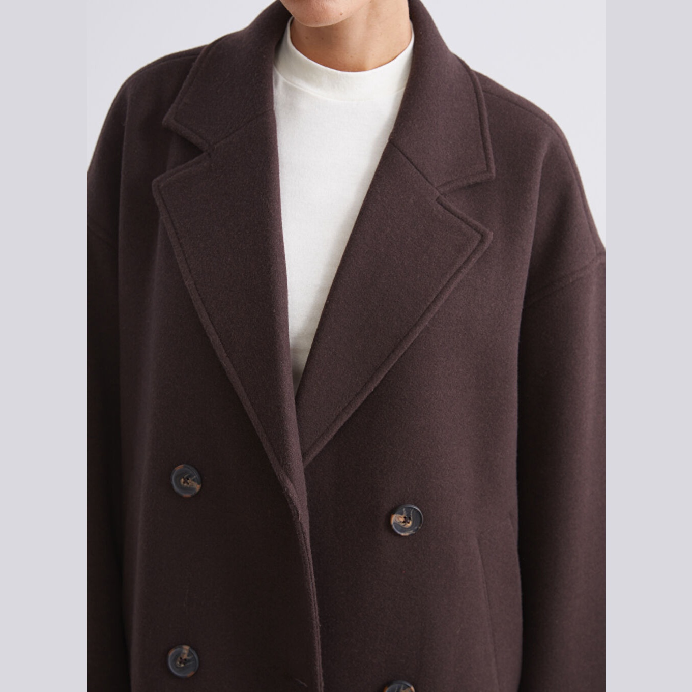 معطف نسائي بياقة كروّاز من LCW Vision – بني (قصة واسعة، تصميم شتوي متوسط الطول، خامة كاشمير صناعي سميكة، مبطّن بالكامل، بدون قبعة، مزود بأزرار أمامية، مثالي للإطلالات الرسمية والدافئة)