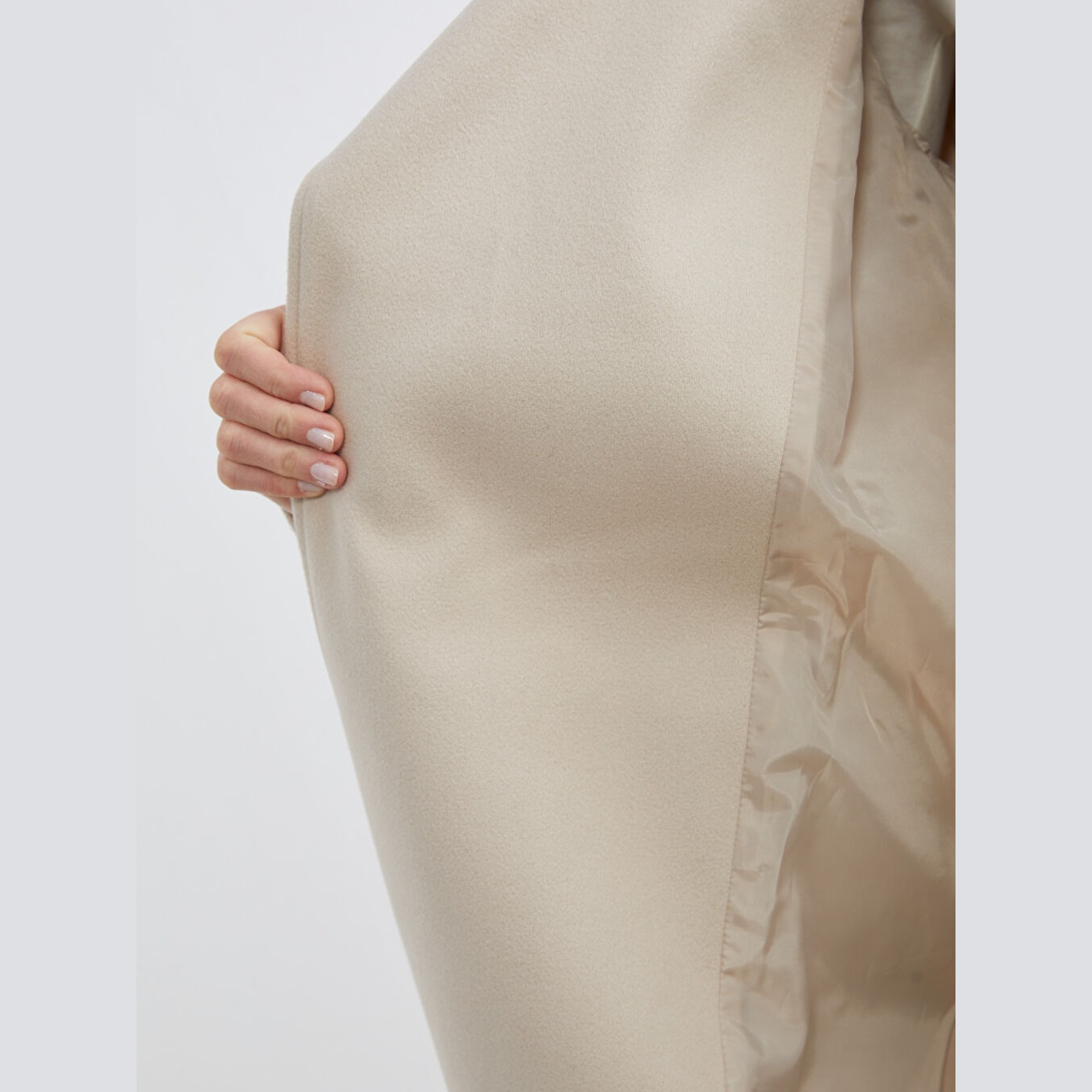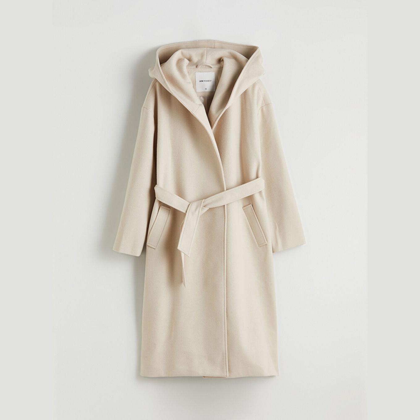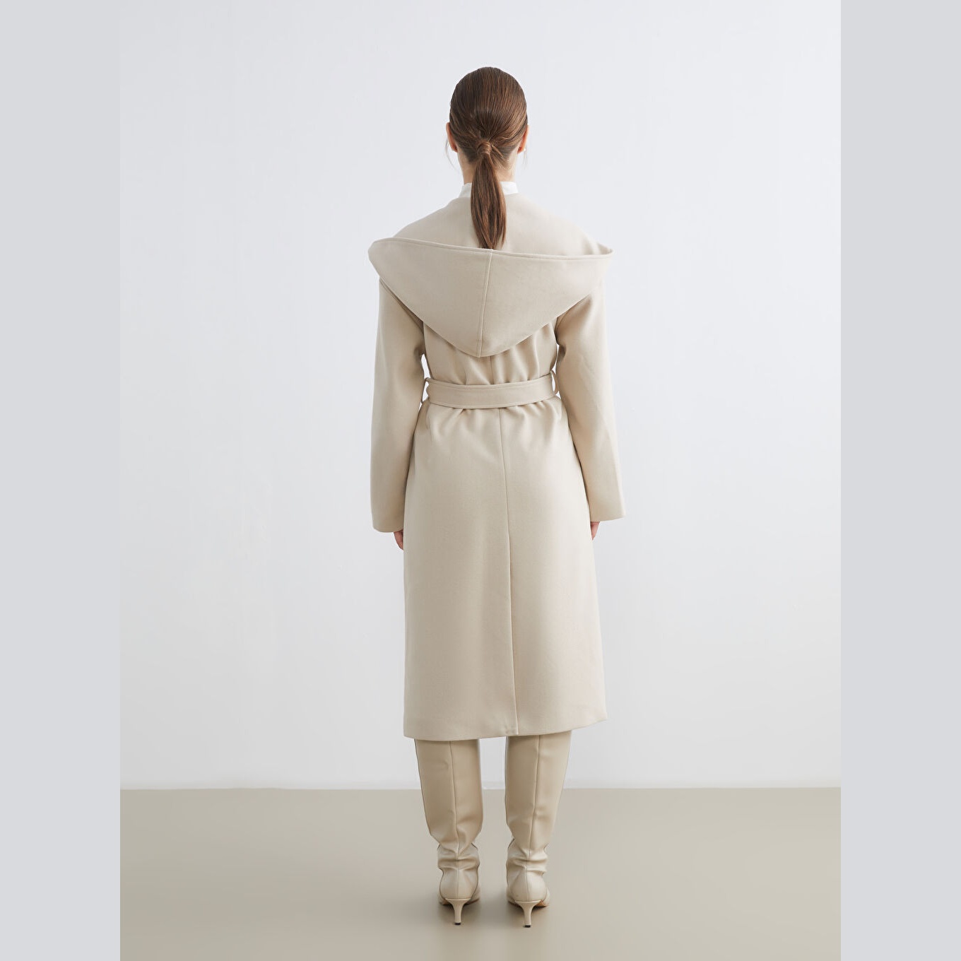 معطف نسائي بقبعة من LCW Modest – بيج (قصة واسعة، تصميم شتوي طويل، خامة كاشمير صناعي سميكة، مبطّن بالكامل، مزود بقبعة ثابتة وحزام خارجي، مثالي للإطلالات المحتشمة والدافئة)