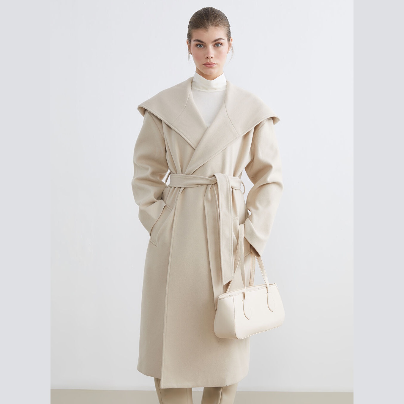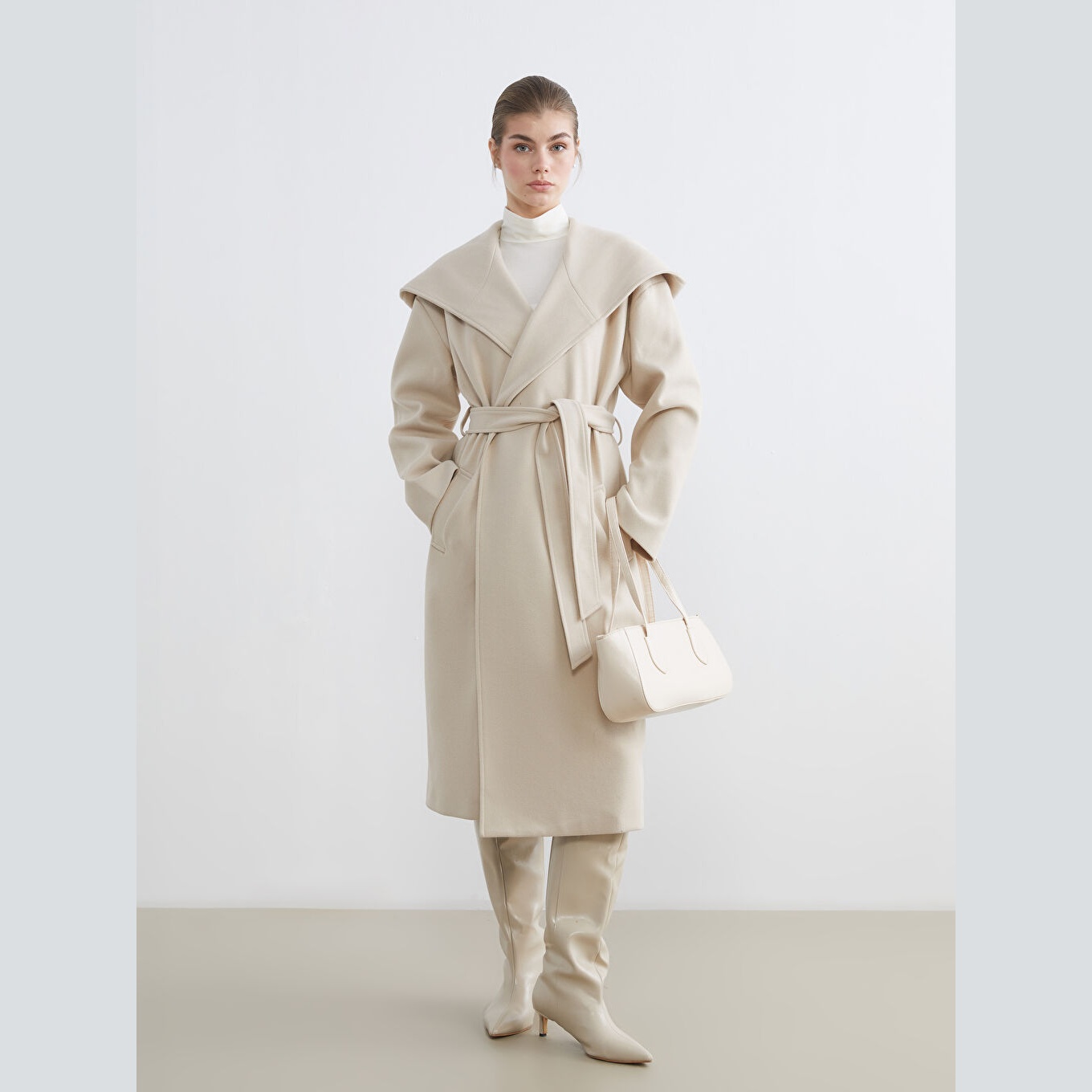 معطف بلون بيج من مجموعة LCW Modest – الأزياء المحتشمة، مصمم بياقة كلاسيكية مع قبعة ثابتة، قصة واسعة (Loose & Bol) تمنحك مظهرًا محتشمًا وانسيابيًا، خامة كاشمير صناعي من %100 بوليستر، مبطّن بالكامل بـ%100 بوليستر، تصميم سادة بدون نقوش، بطول طويل يُقاس من الكتف، مزود بأزرار أمامية وحزام خارجي، يتكون من قطعتين (المعطف + الحزام)، مثالي للإطلالات الشتوية المحتشمة والرسمية.