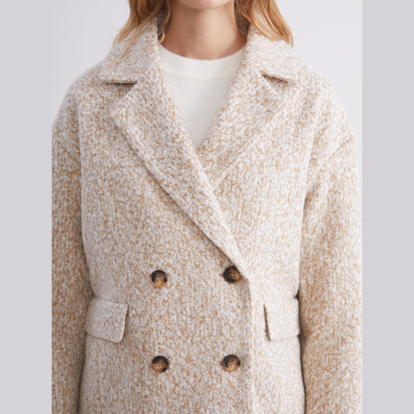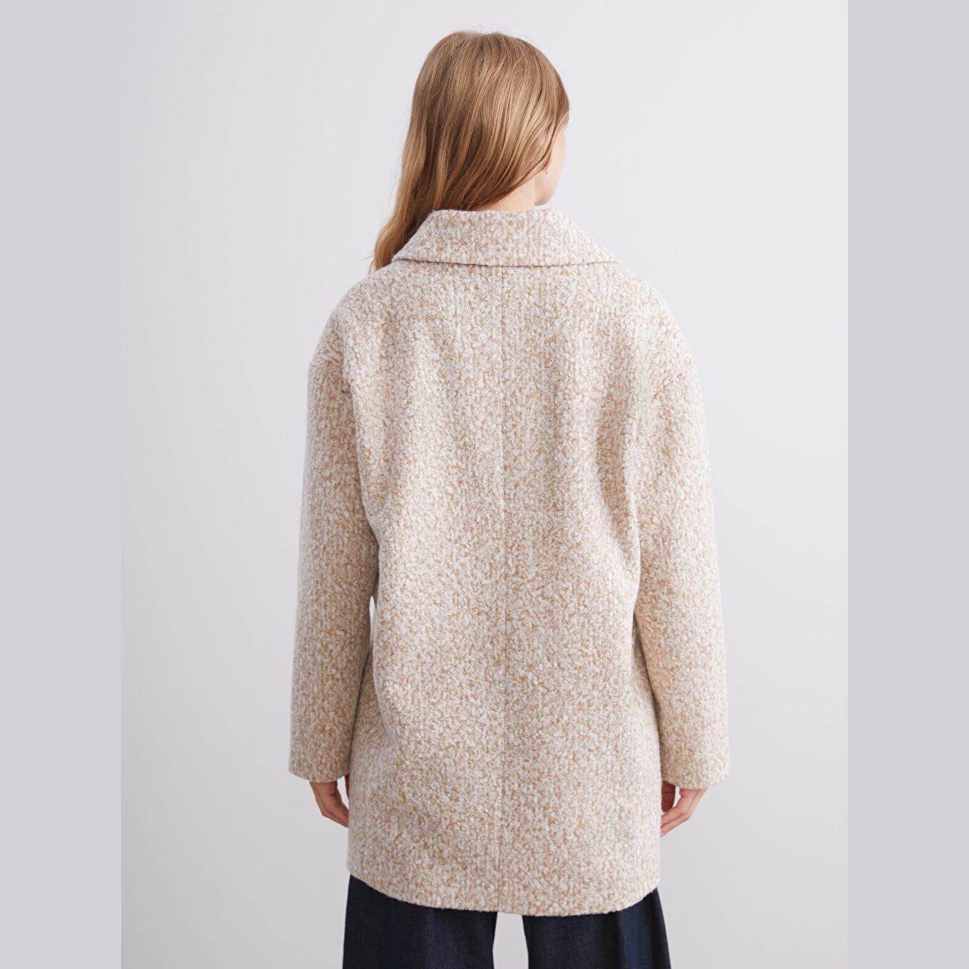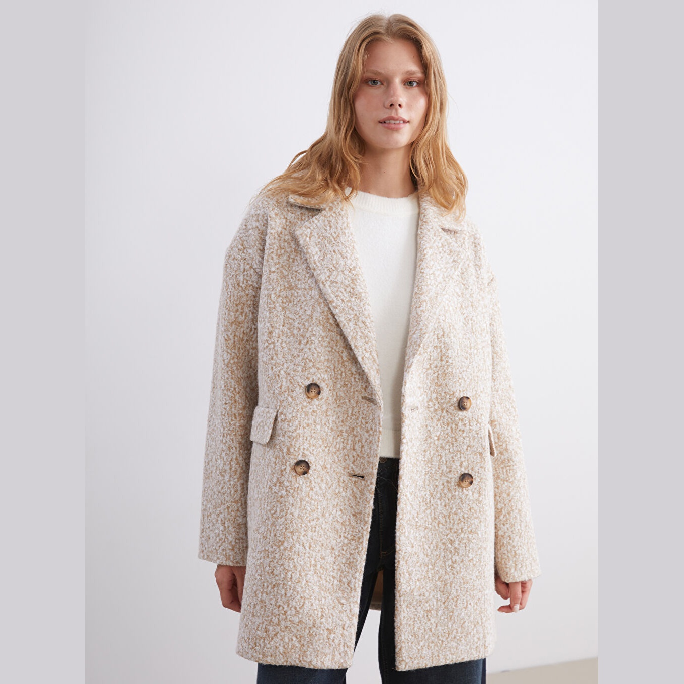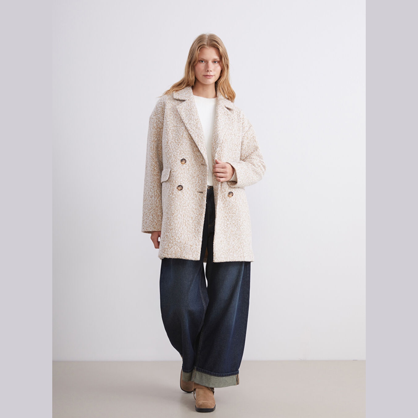 معطف نسائي بياقة كروّاز أوفرسايز من LCW Vision – بيج (قصة واسعة جدًا، تصميم شتوي متوسط الطول، خامة كاشمير صناعي سميكة، مبطّن بالكامل، بدون قبعة، مزود بأزرار أمامية، مثالي للإطلالات العصرية والدافئة)