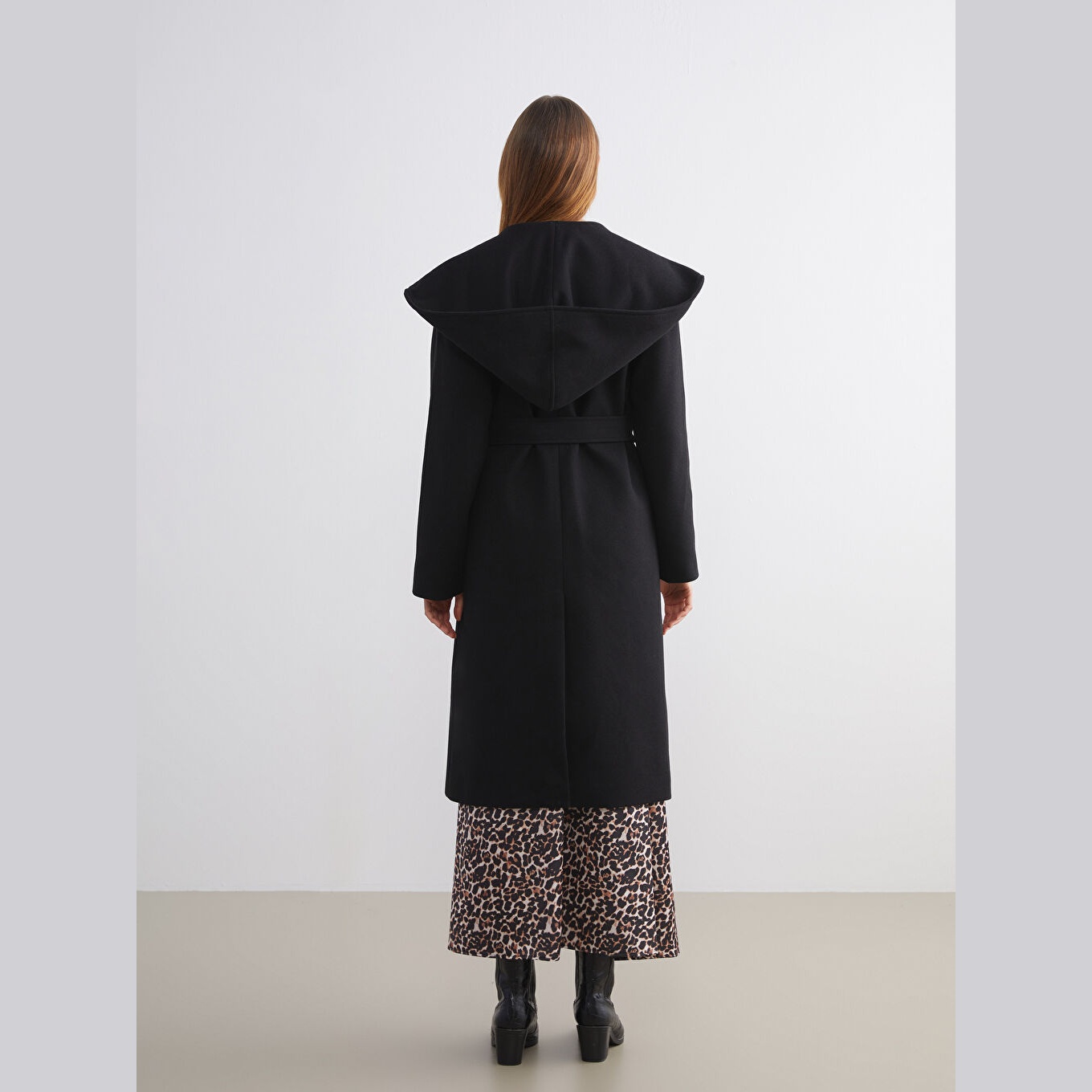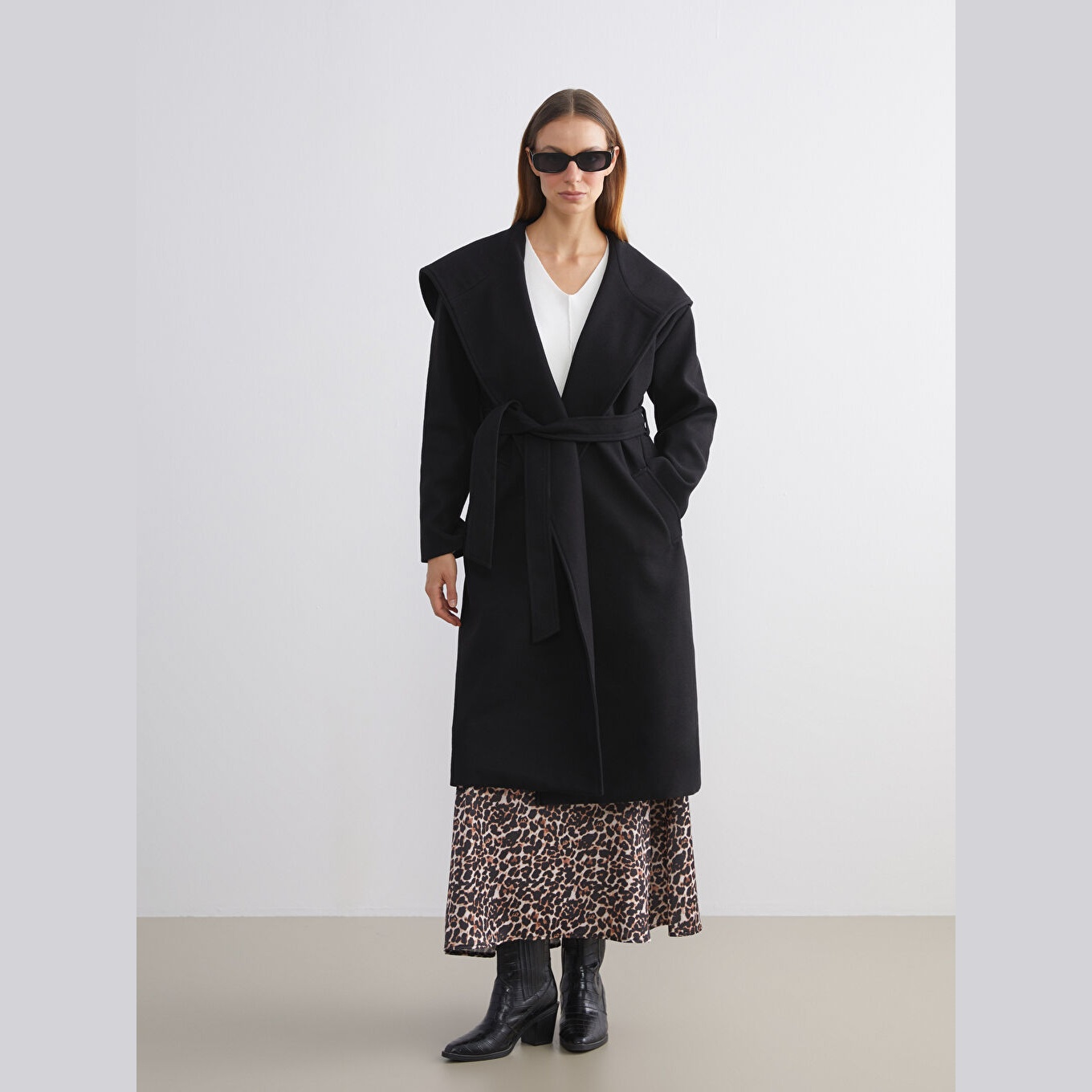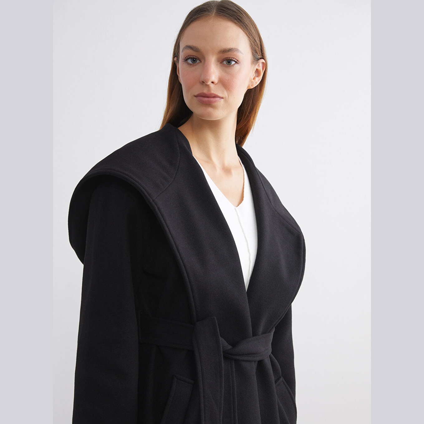 معطف نسائي بقبعة من LCW Modest – أسود (قصة واسعة، تصميم شتوي طويل، خامة كاشمير صناعي سميكة، مبطّن بالكامل، مزود بقبعة ثابتة وحزام خارجي، مثالي للإطلالات المحتشمة والدافئة)
