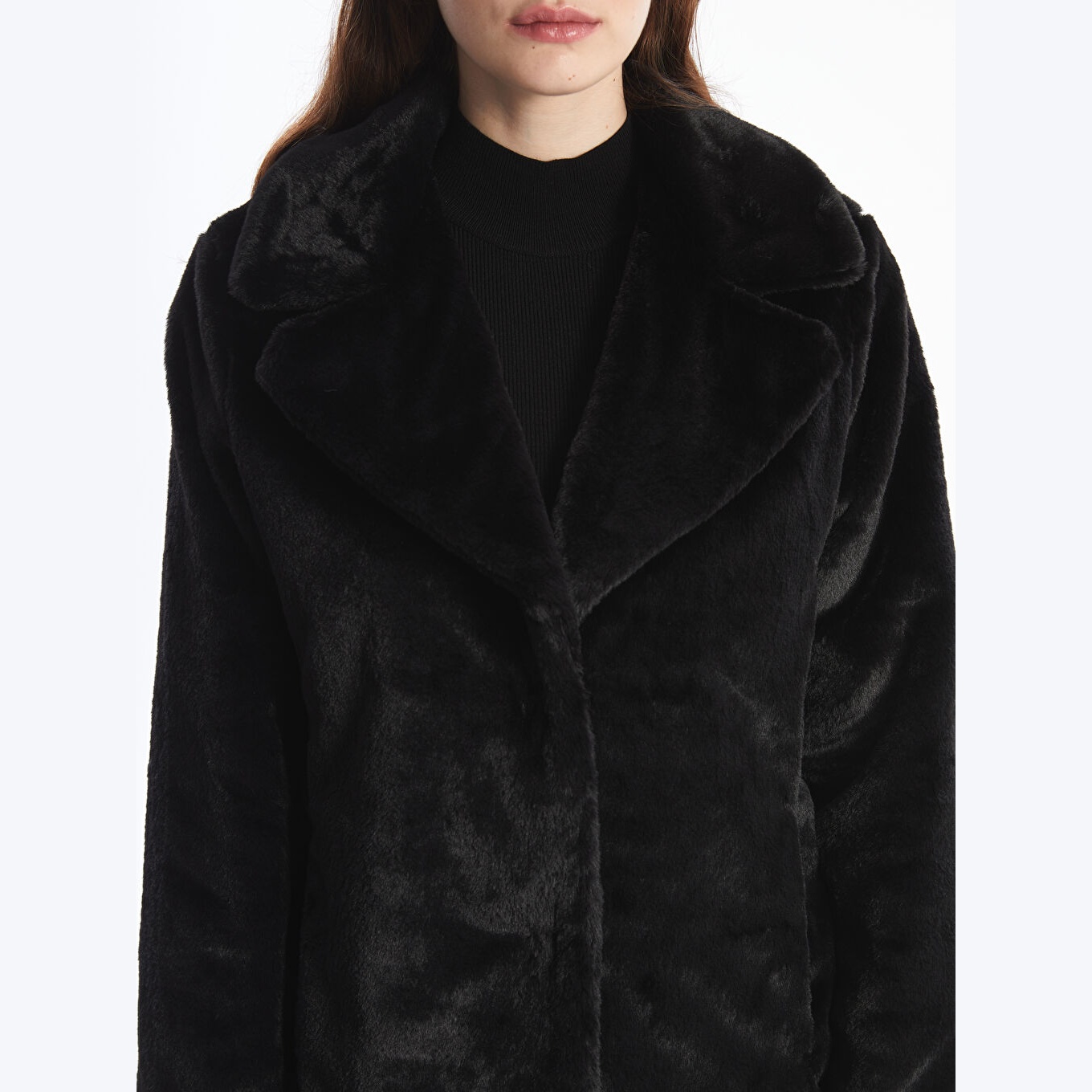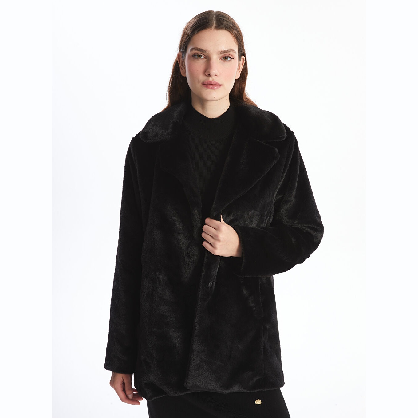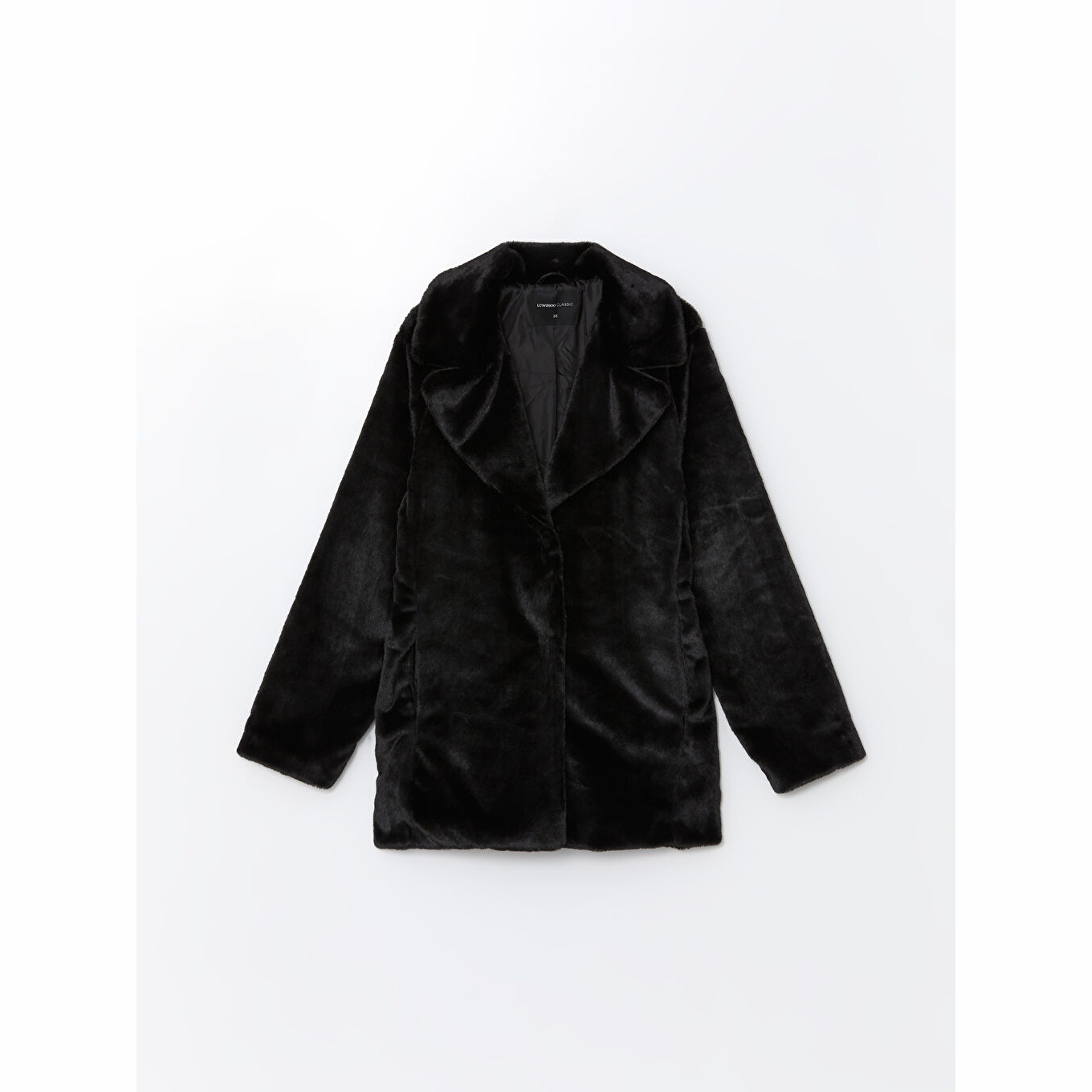 كاب نسائي بياقة جاكيت من LCW Classic – أسود (قصة واسعة، تصميم شتوي متوسط الطول، خامة فرو صناعي سميكة، مبطّن بالكامل، بدون قبعة، مزود بأزرار أمامية، مثالي للإطلالات الرسمية والأنيقة)