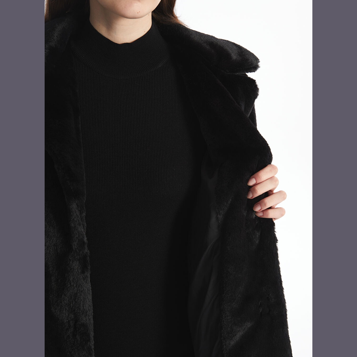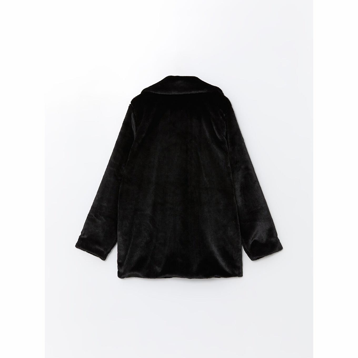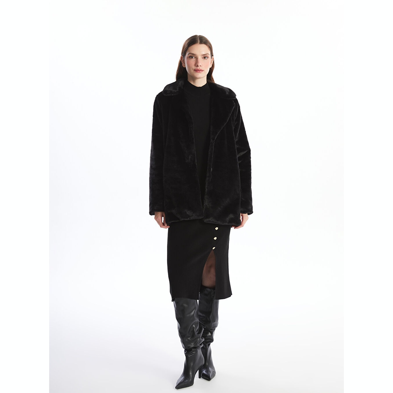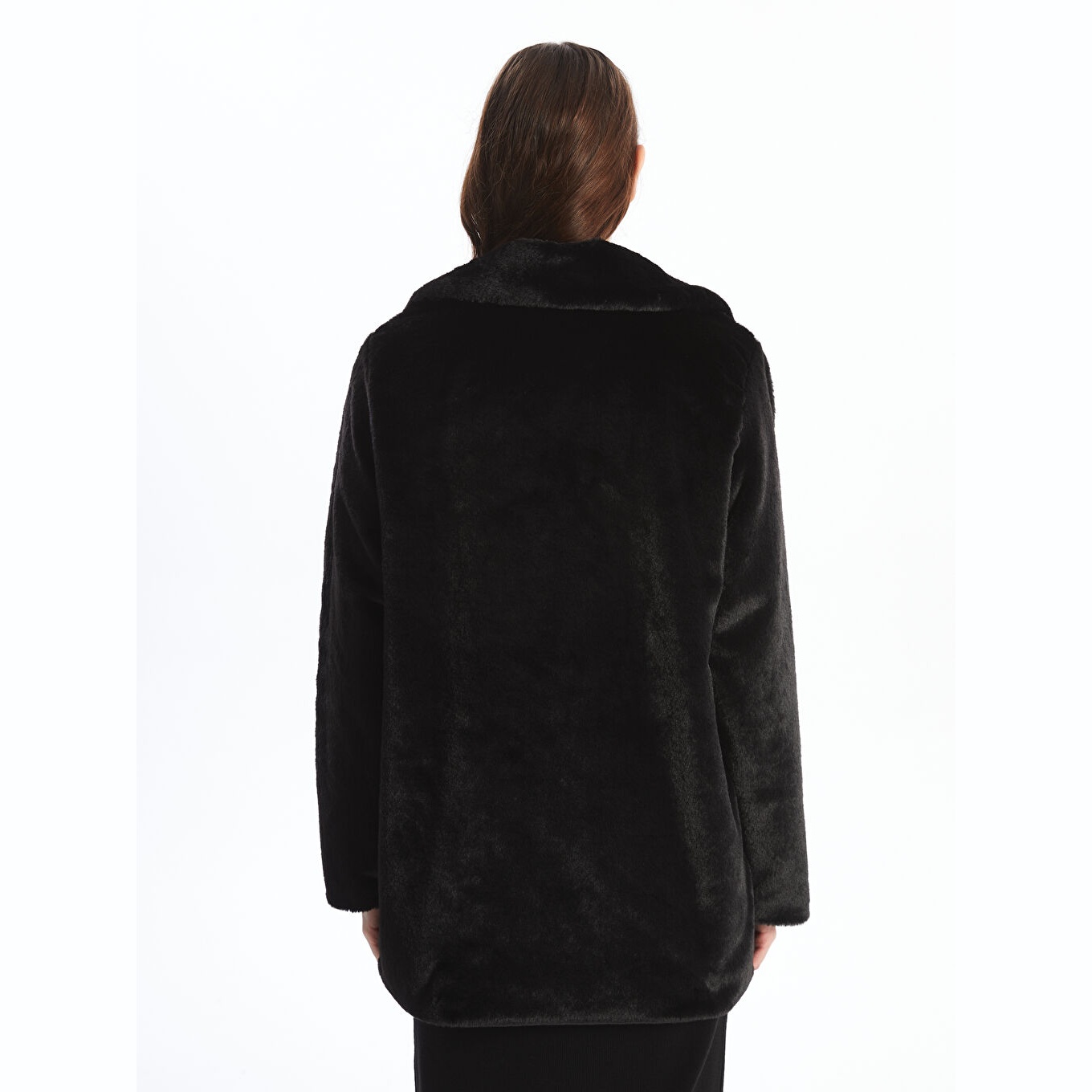 كاب نسائي بياقة جاكيت من LCW Classic – أسود (قصة واسعة، تصميم شتوي متوسط الطول، خامة فرو صناعي سميكة، مبطّن بالكامل، بدون قبعة، مزود بأزرار أمامية، مثالي للإطلالات الرسمية والأنيقة)