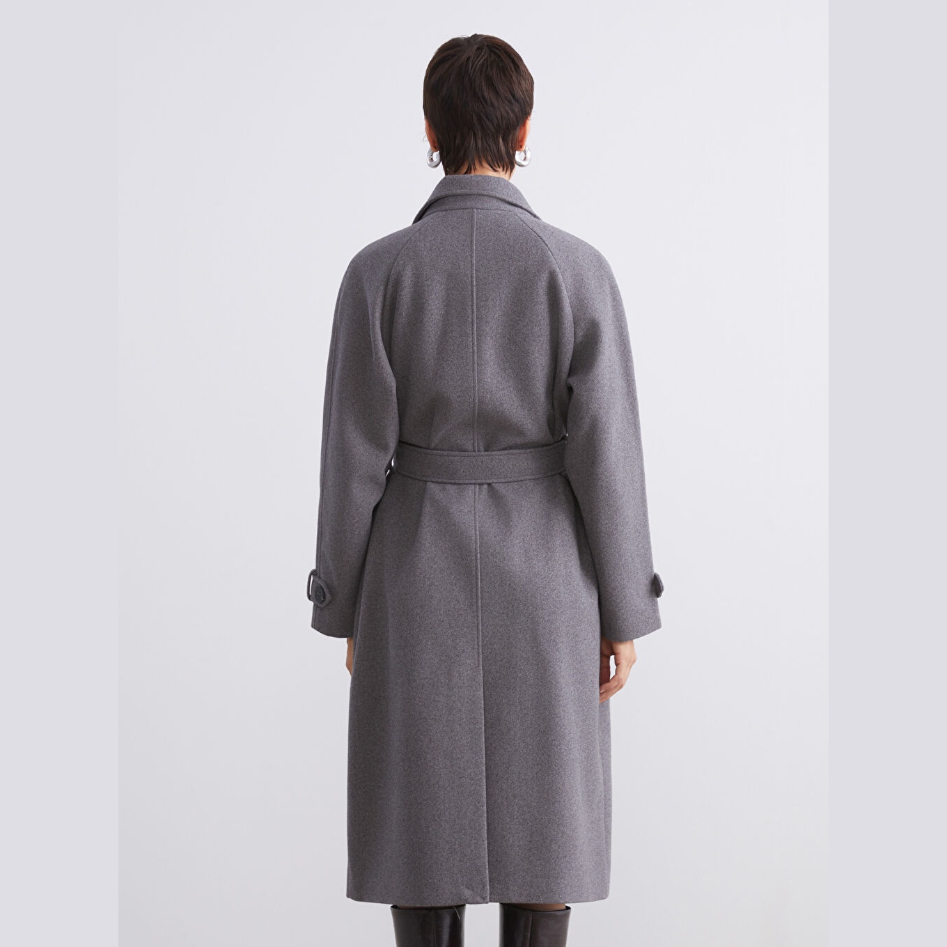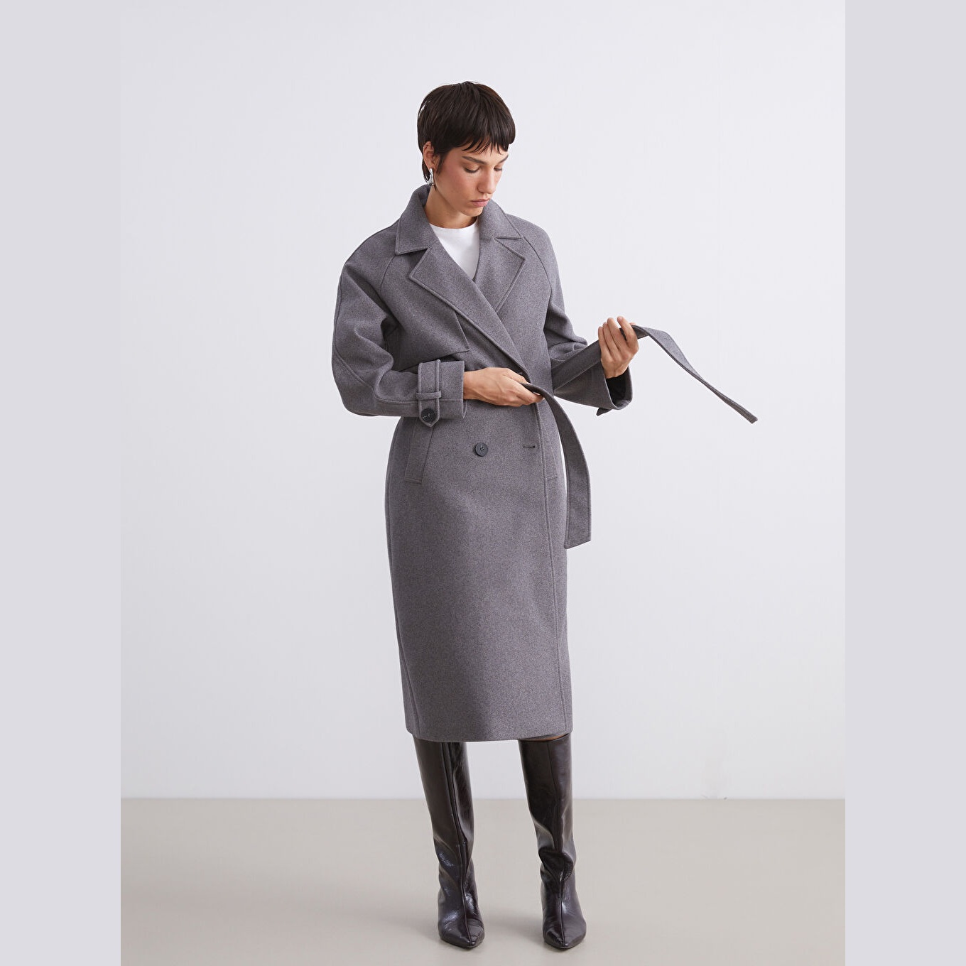 معطف نسائي بياقة جاكيت أوفرسايز من LCW Vision – رمادي (قصة واسعة جدًا، تصميم شتوي طويل، خامة كاشمير صناعي سميكة، مبطّن بالكامل، بدون قبعة، مزود بحزام خارجي وأزرار أمامية، مثالي للإطلالات الرسمية والعصرية)