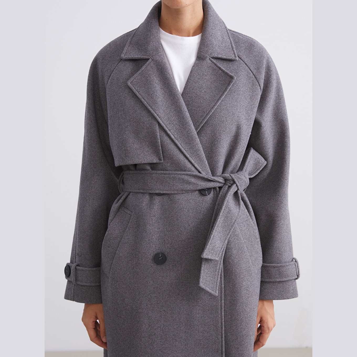 - الخصائص: تصميم شتوي، مبطّن بالكامل، بدون قبعة، أزرار أمامية، حزام خارجي