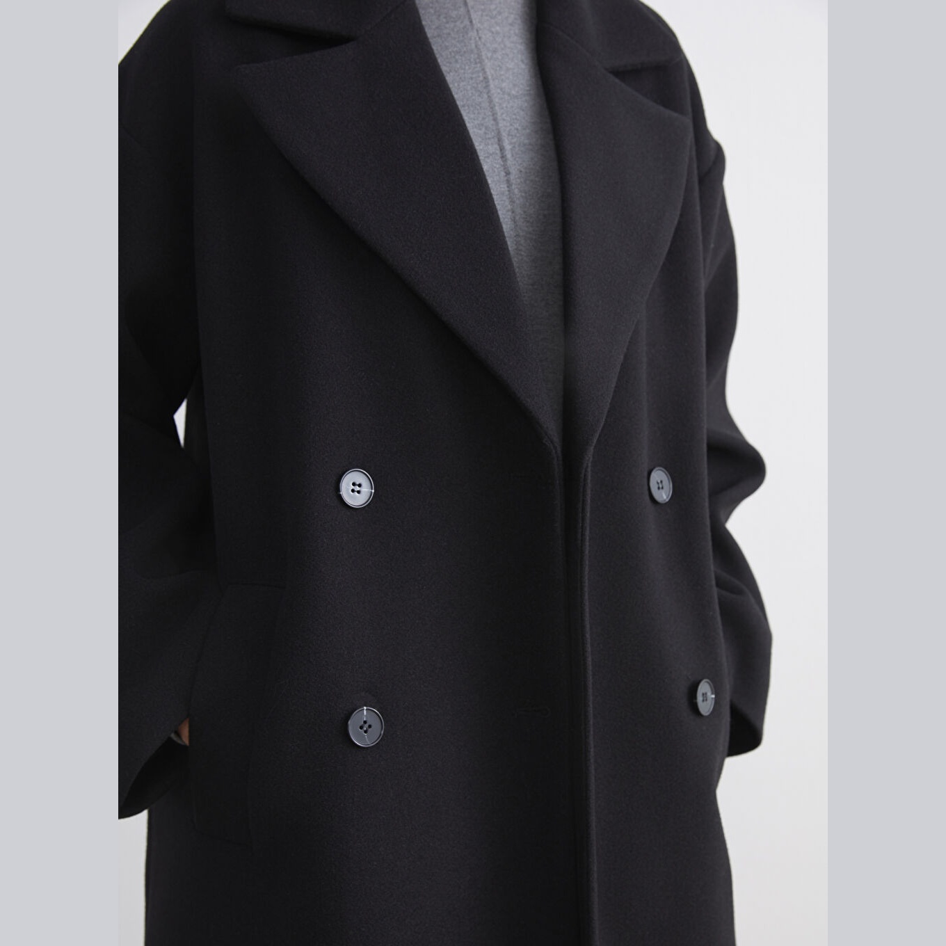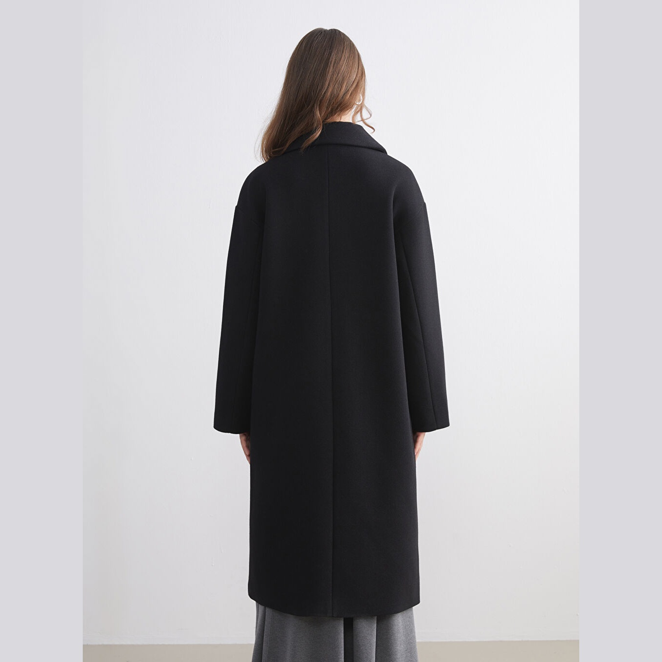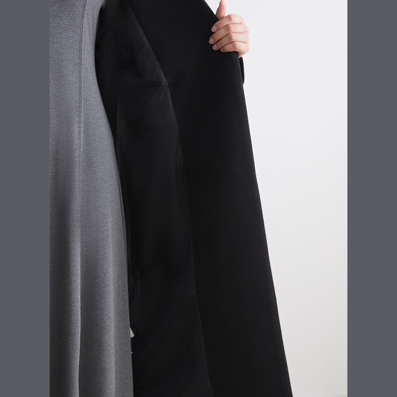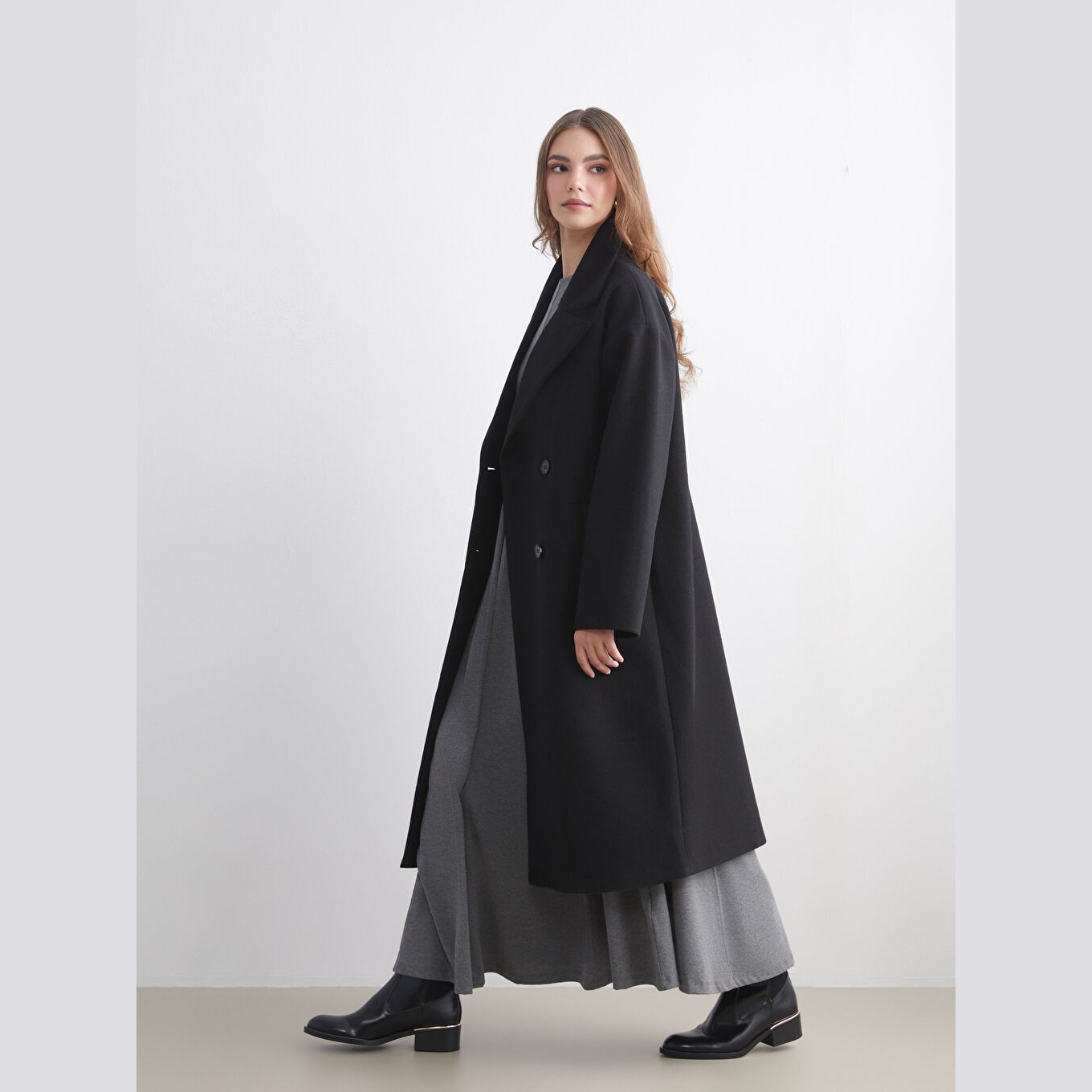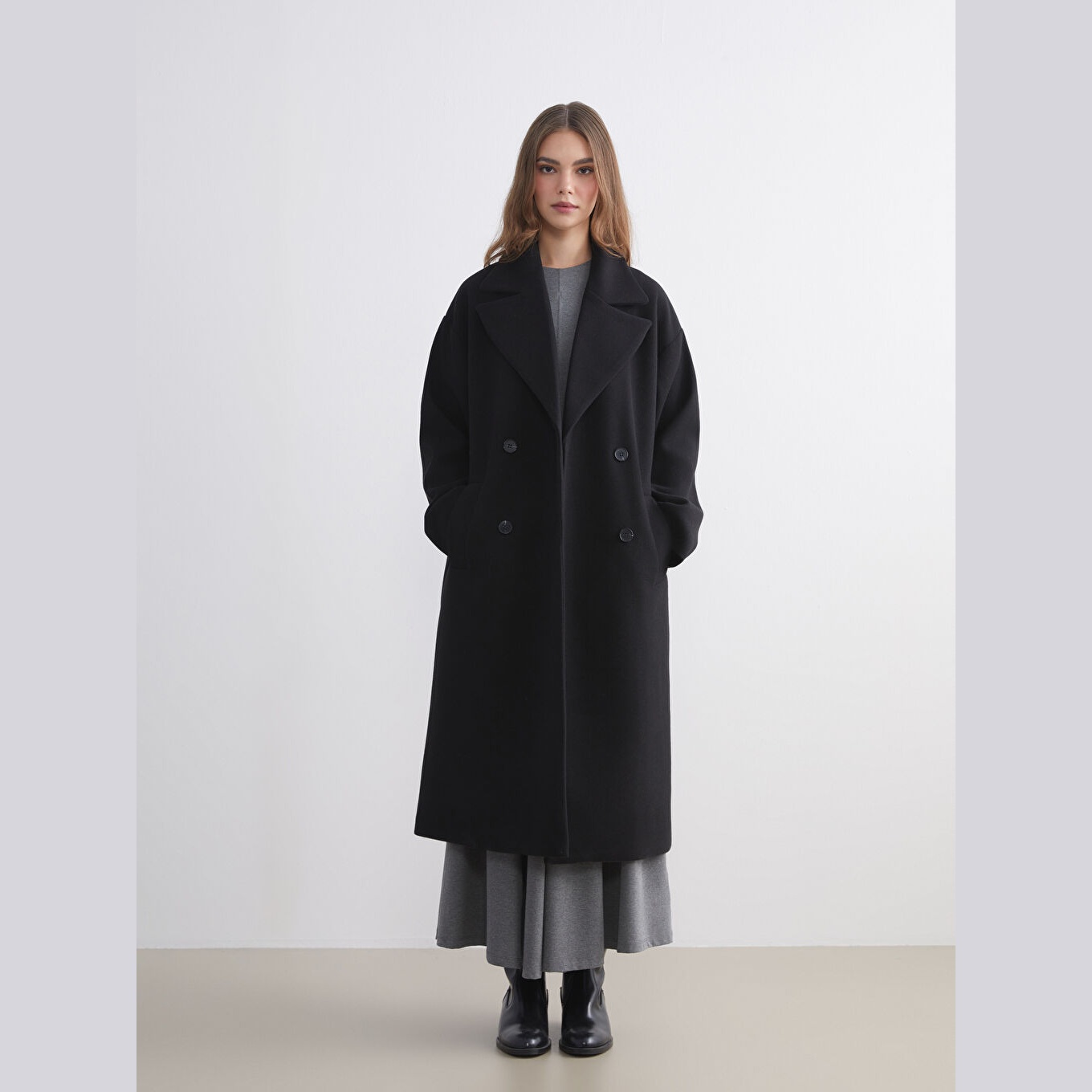 معطف نسائي بياقة جاكيت من LCW Modest – أسود (قصة واسعة، تصميم شتوي طويل، خامة كاشمير صناعي سميكة، مبطّن بالكامل، بدون قبعة، مزود بأزرار أمامية، مثالي للإطلالات المحتشمة والرسمية)
