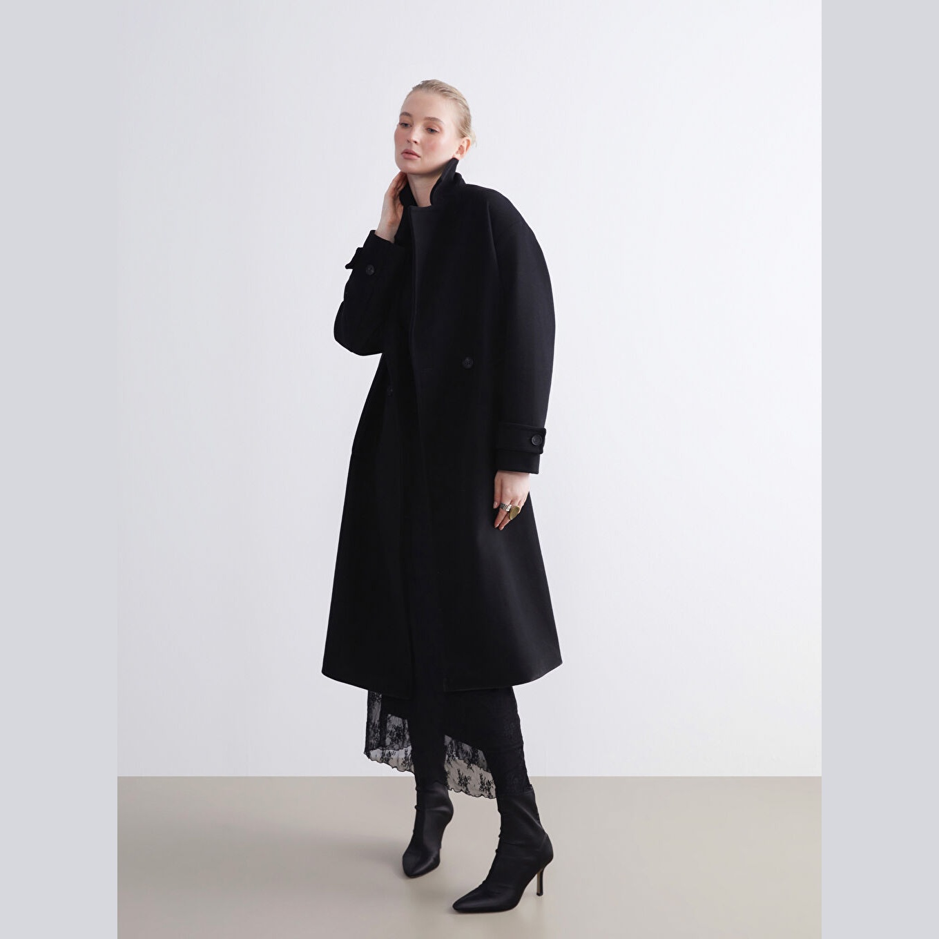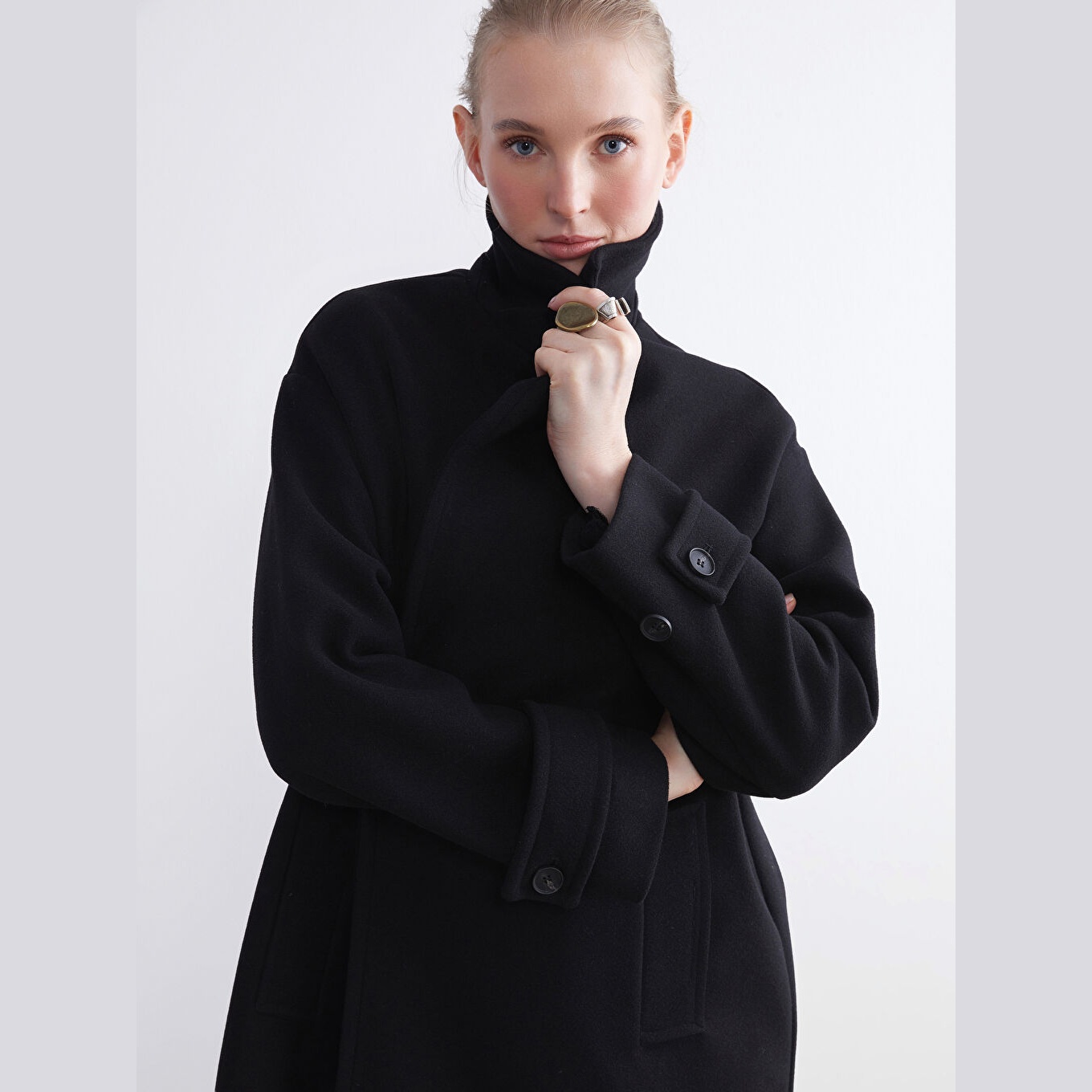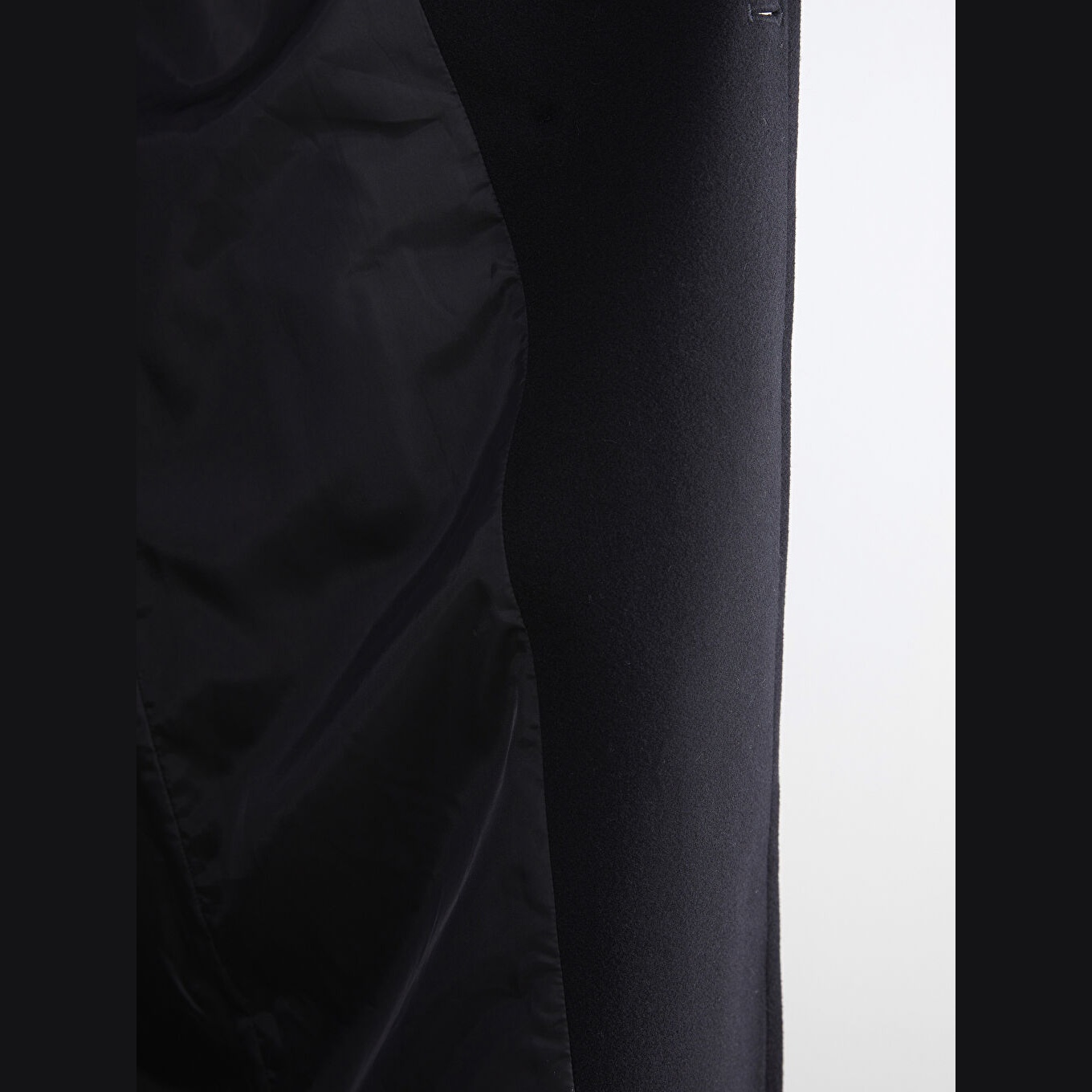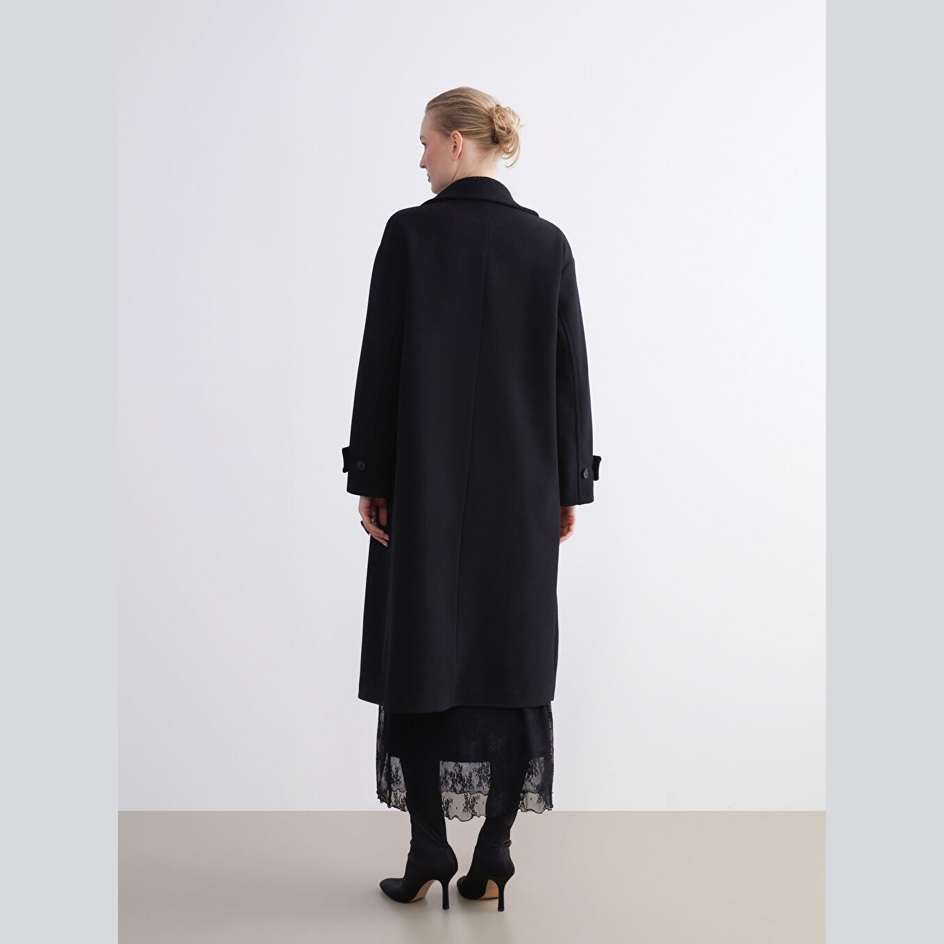 معطف نسائي بياقة جاكيت من LCW Classic – أسود (قصة واسعة، تصميم شتوي طويل، خامة كاشمير صناعي سميكة، مبطّن بالكامل، بدون قبعة، مزود بأزرار أمامية، مثالي للإطلالات الرسمية والدافئة)