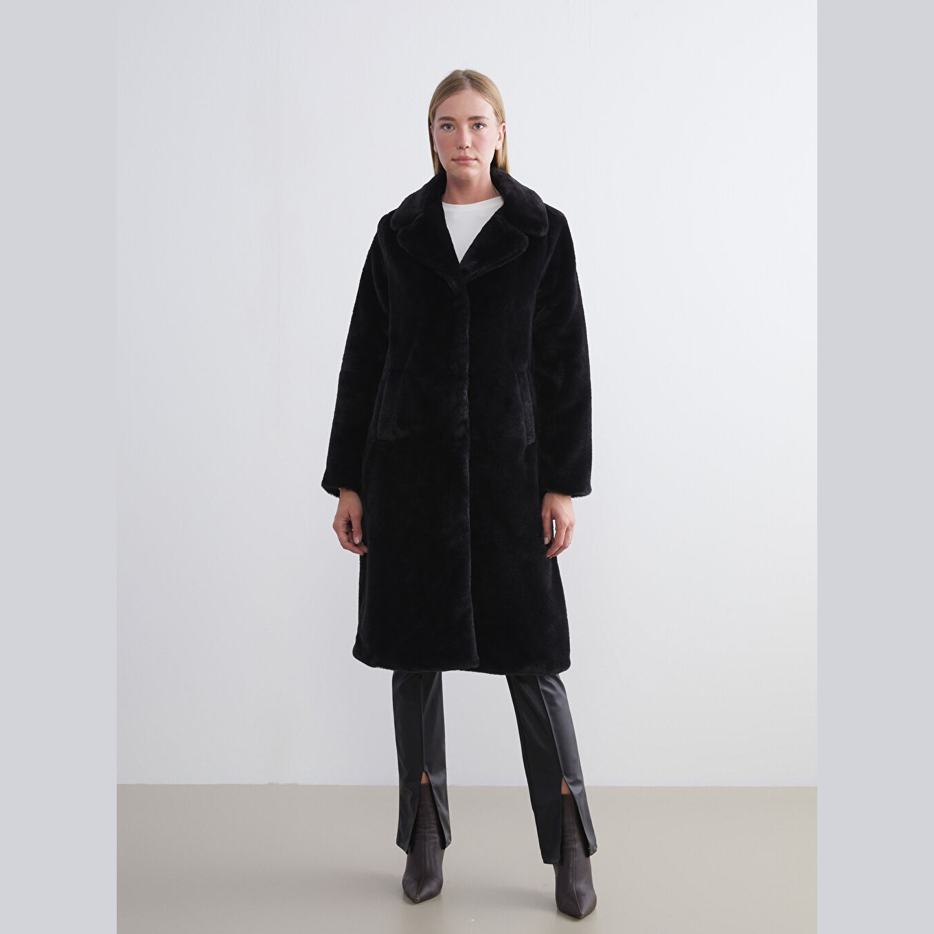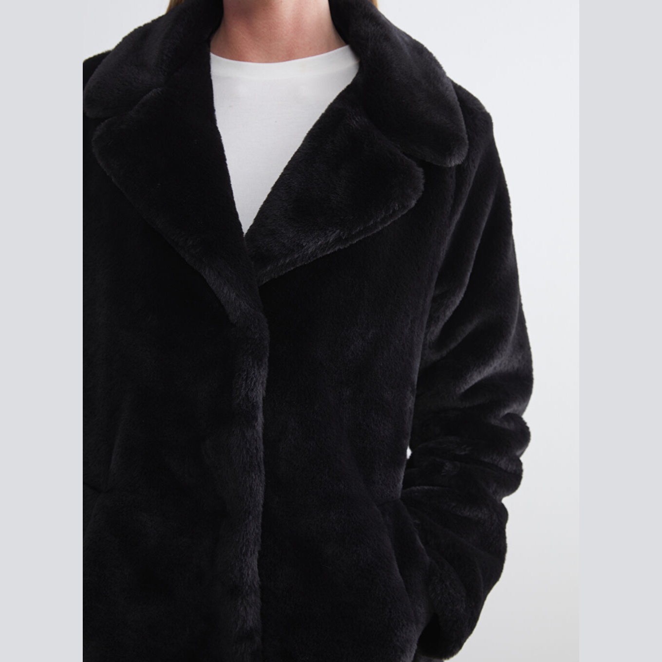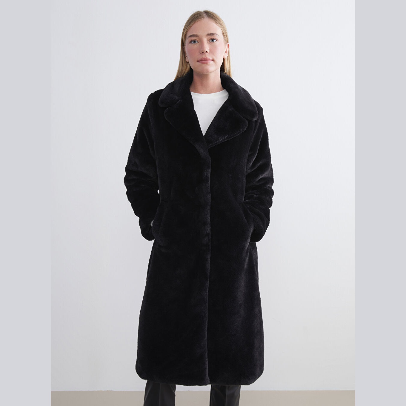 كاب نسائي بياقة جاكيت من LCW Classic – أسود (قصة قياسية، تصميم شتوي طويل، خامة فرو صناعي بسمك متوسط، مبطّن بالكامل، بدون قبعة، مثالي للإطلالات الرسمية والدافئة ضمن مجموعة المقاسات الكبيرة)