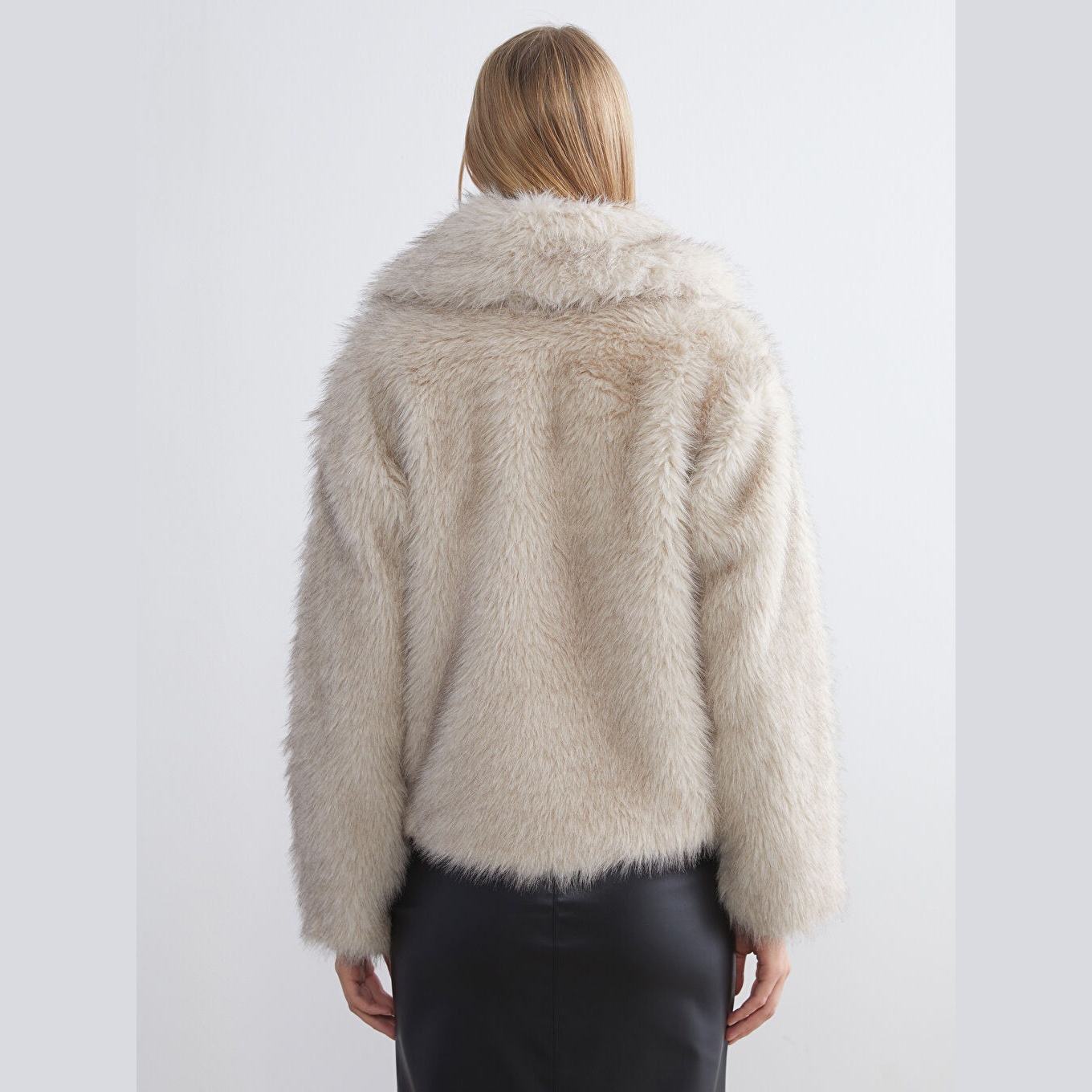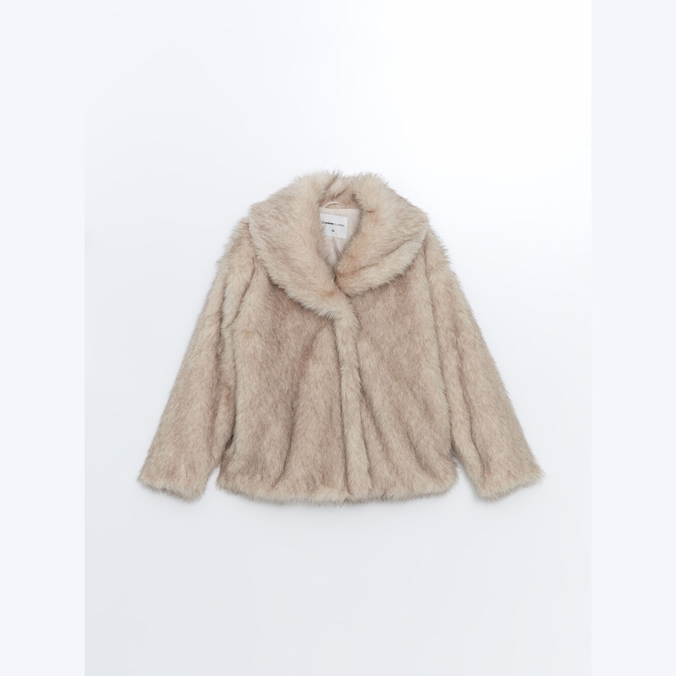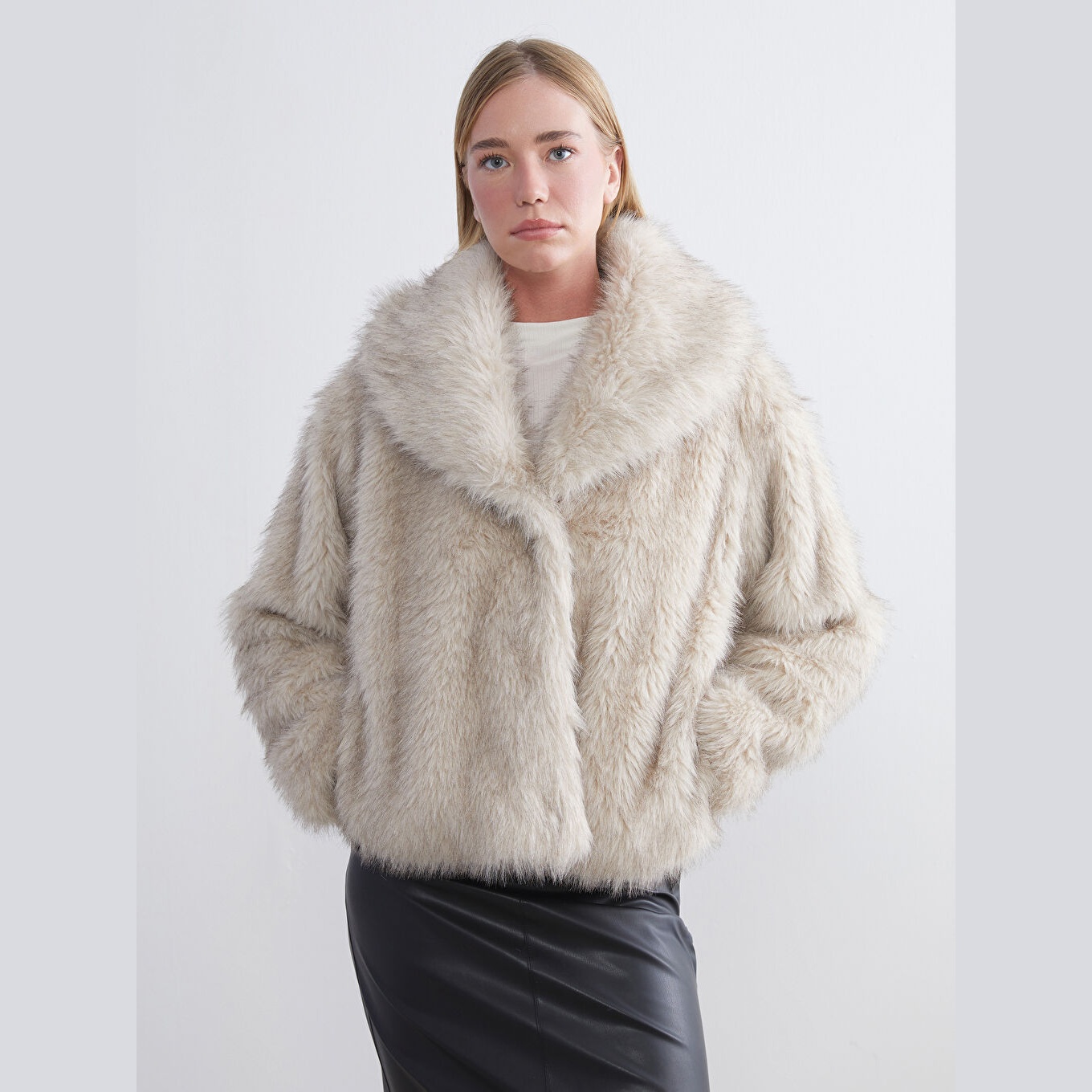 كاب نسائي بياقة جاكيت من LCW Classic – إكرو (قصة واسعة، تصميم شتوي قصير، خامة فرو صناعي سميكة، مبطّن بالكامل، بدون قبعة، مثالي للإطلالات الرسمية والدافئة)
