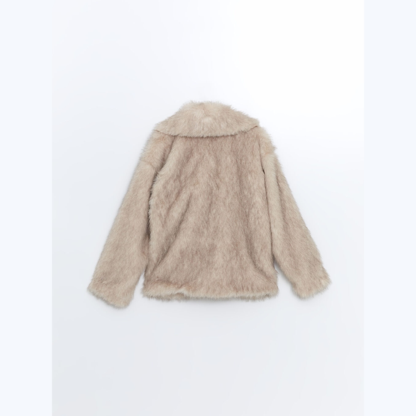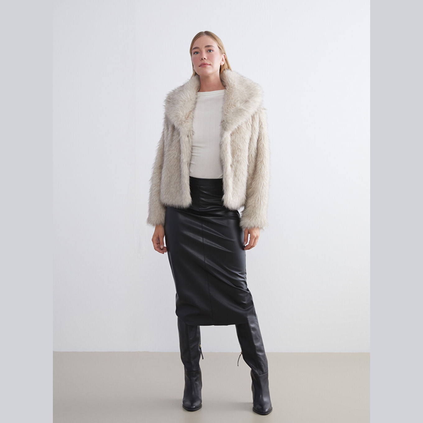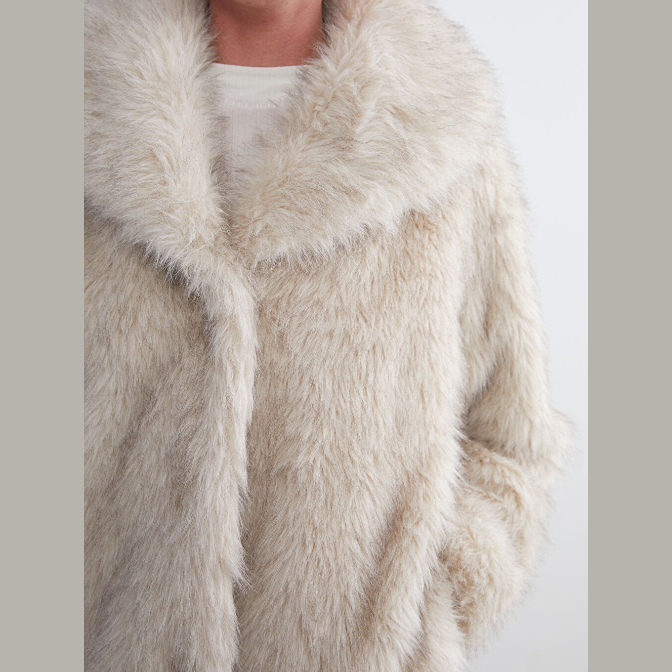 كاب نسائي بياقة جاكيت من LCW Classic – إكرو (قصة واسعة، تصميم شتوي قصير، خامة فرو صناعي سميكة، مبطّن بالكامل، بدون قبعة، مثالي للإطلالات الرسمية والدافئة)