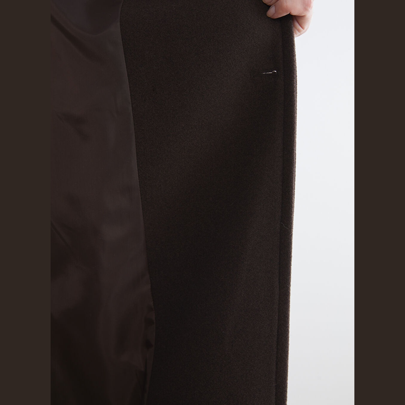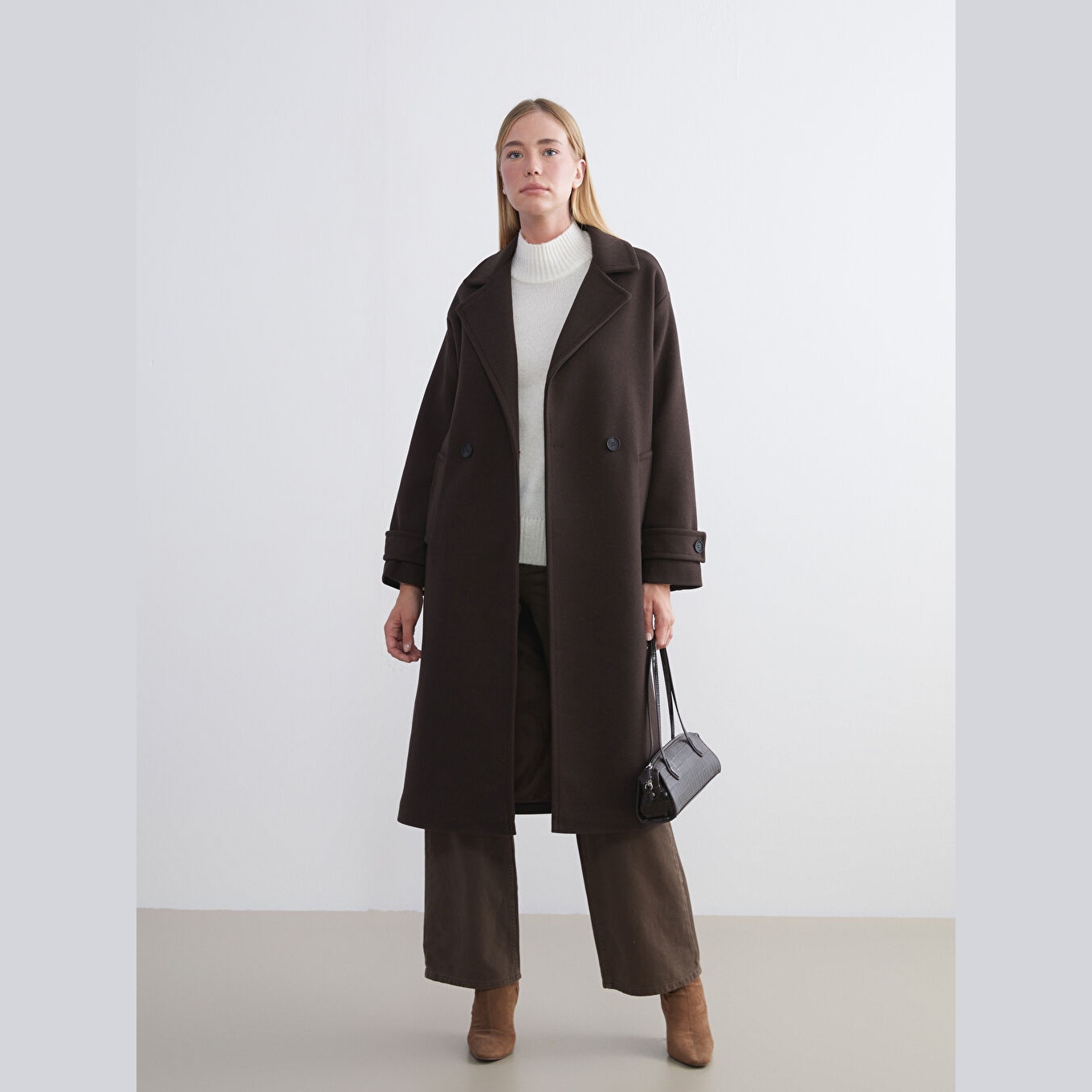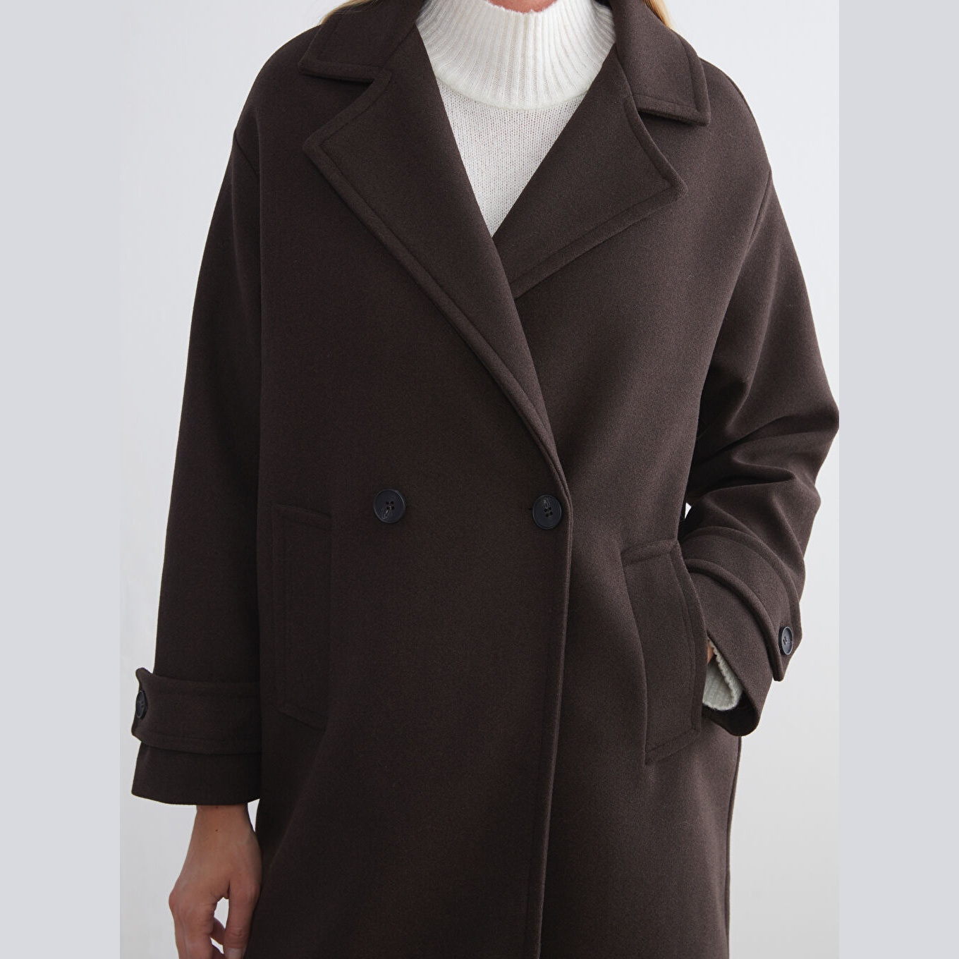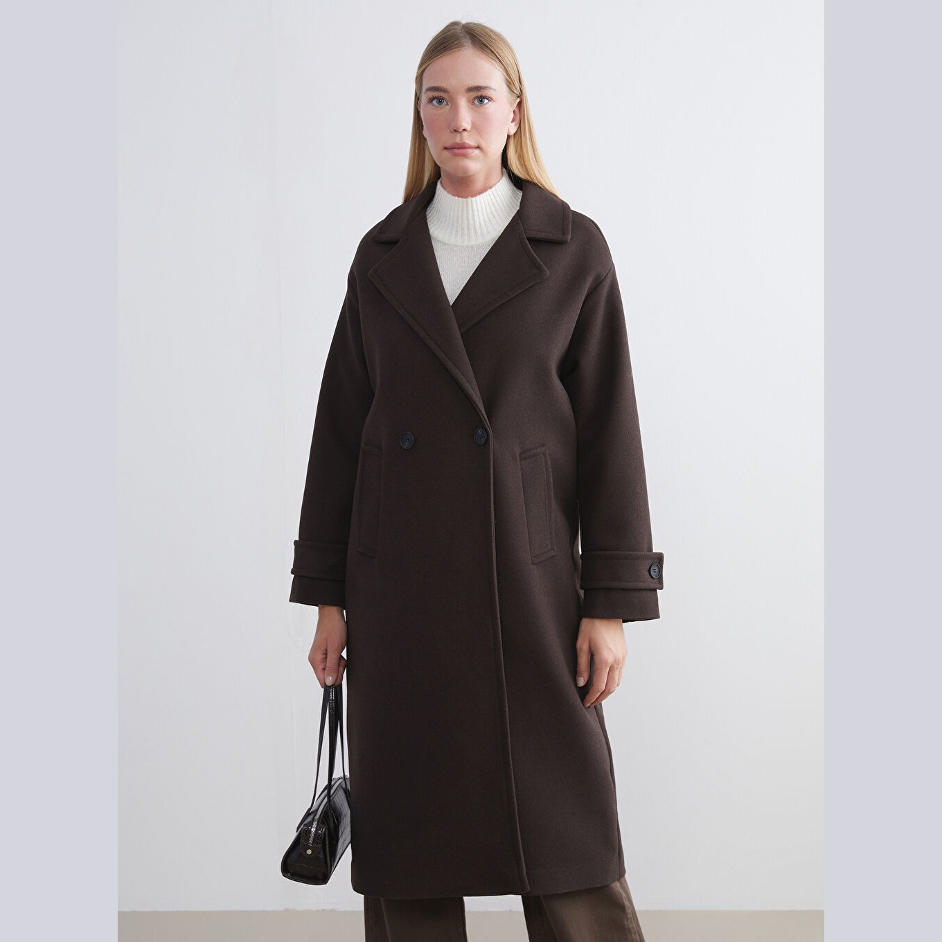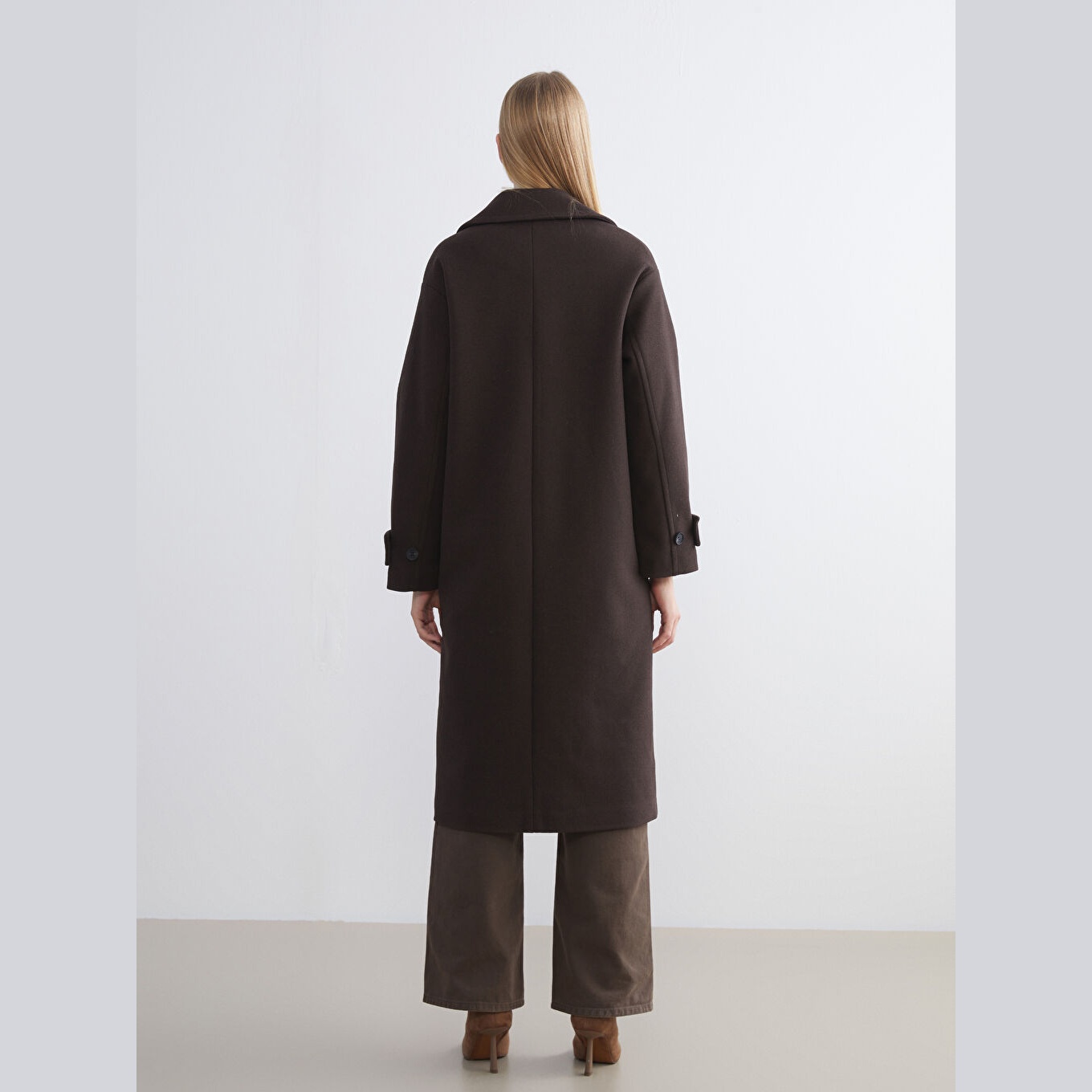 معطف بلون بني من مجموعة LCW Classic، مصمم بياقة جاكيت كلاسيكية تضيف لمسة رسمية، قصة واسعة (Loose & Bol) تمنحك مظهرًا أنيقًا ومريحًا، خامة كاشمير صناعي من %100 بوليستر، مبطّن بالكامل بـ%100 بوليستر، تصميم سادة بدون نقوش، بطول طويل يُقاس من الكتف، بدون قبعة، مزود بأزرار أمامية، مثالي للإطلالات الشتوية الرسمية أو العملية.