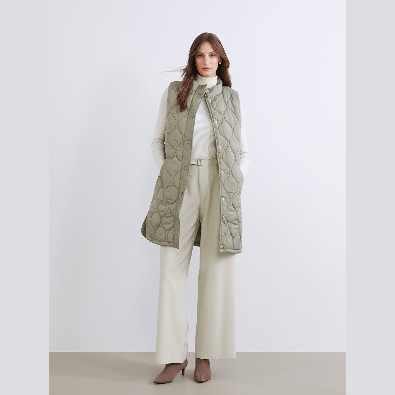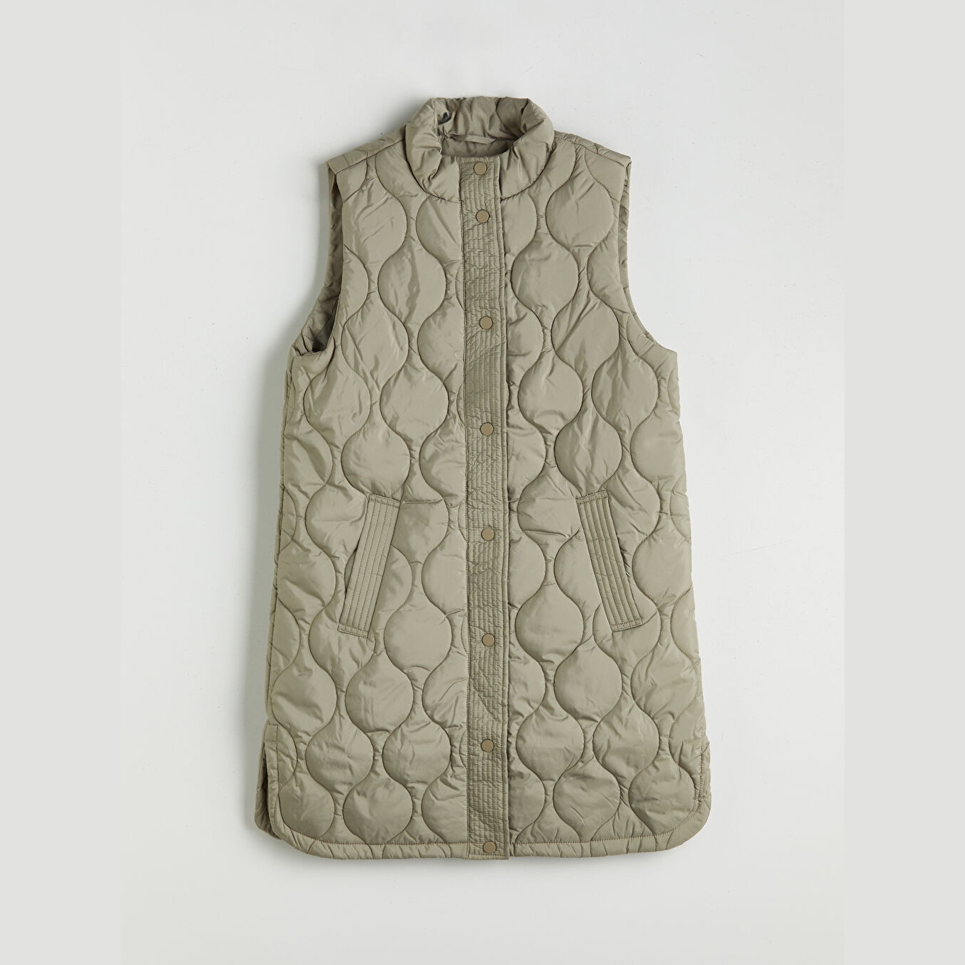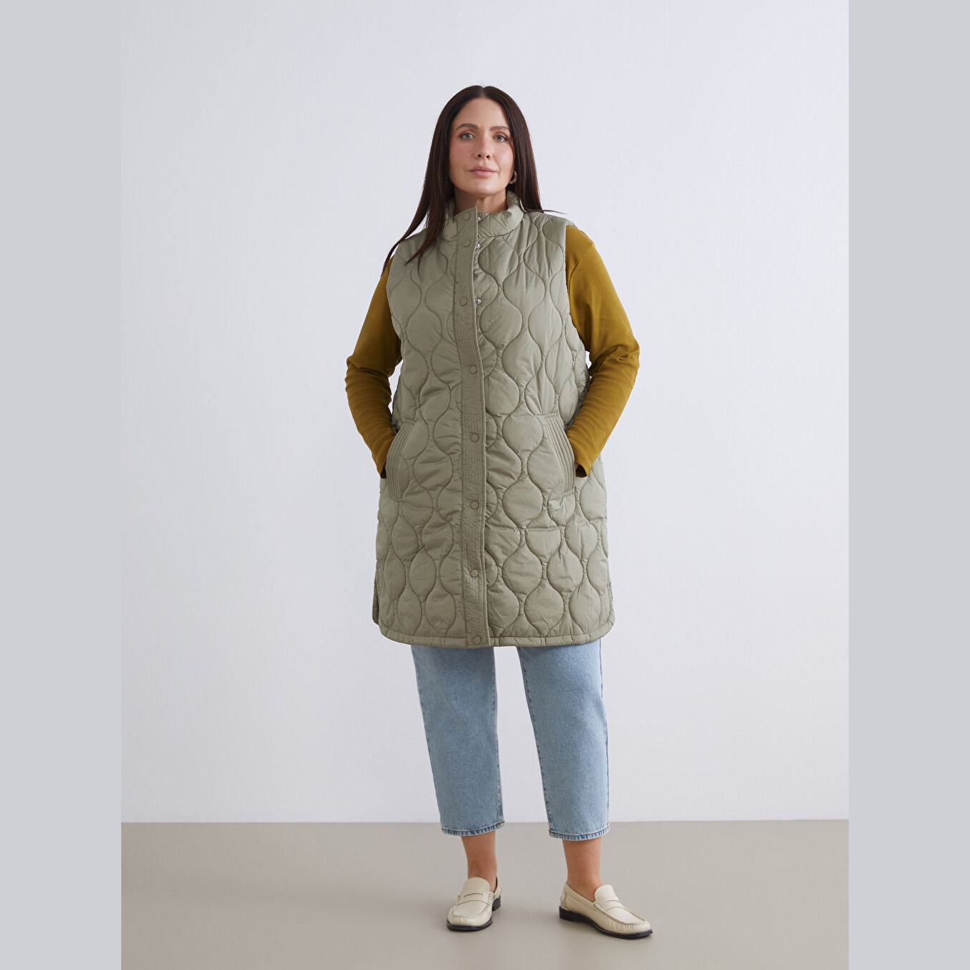 سترة نسائية شتوية بياقة مستقيمة من LCW Modest – زيتي (قصة واسعة، تصميم محتشم متوسط الطول، خامة كابيتوني خفيفة، بدون قبعة، مزودة بسحاب أمامي، مثالية للإطلالات اليومية المحتشمة ضمن مجموعة المقاسات الكبيرة)