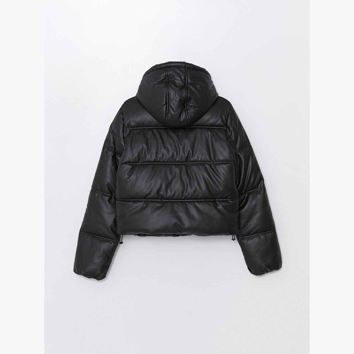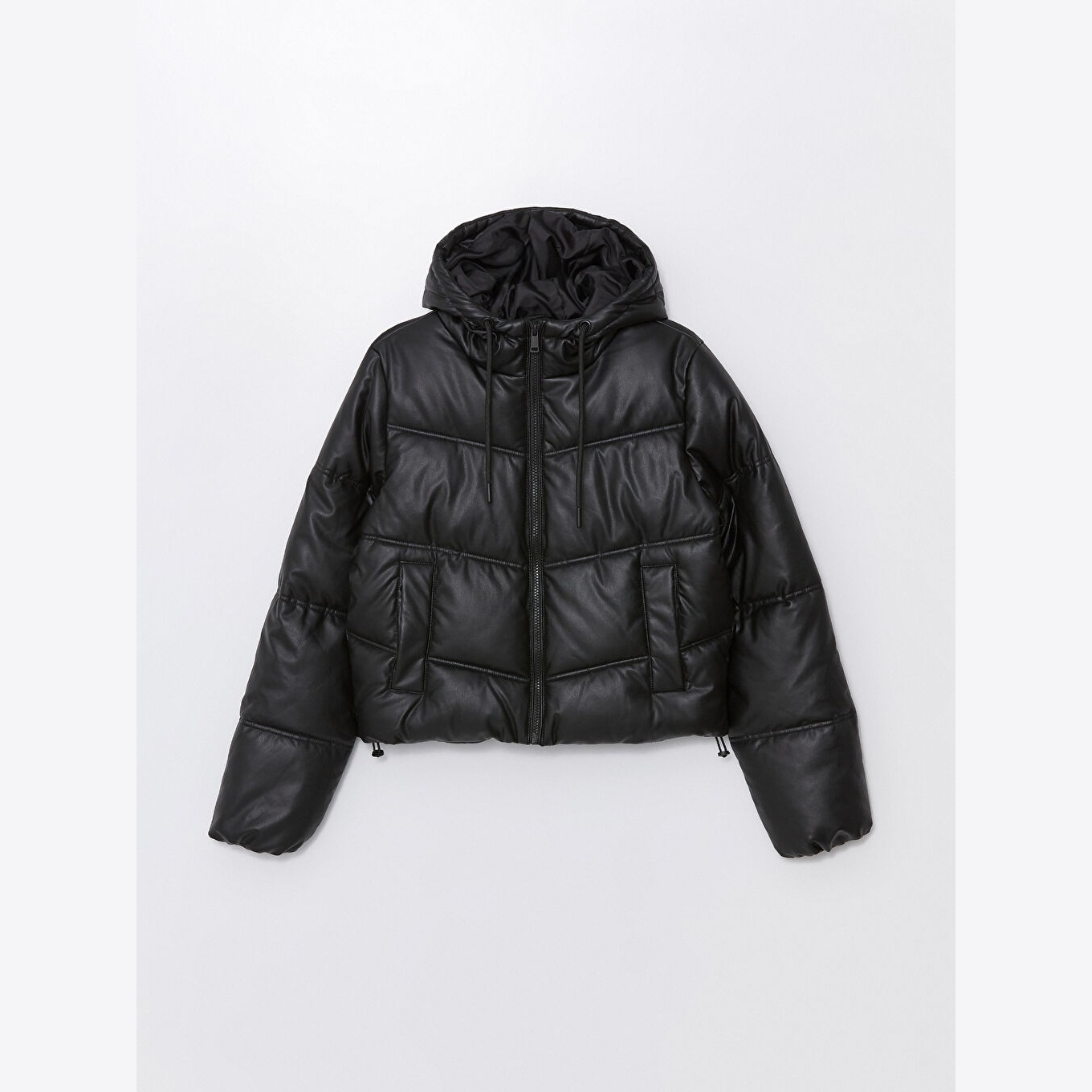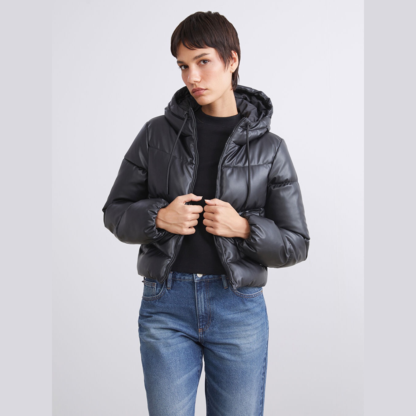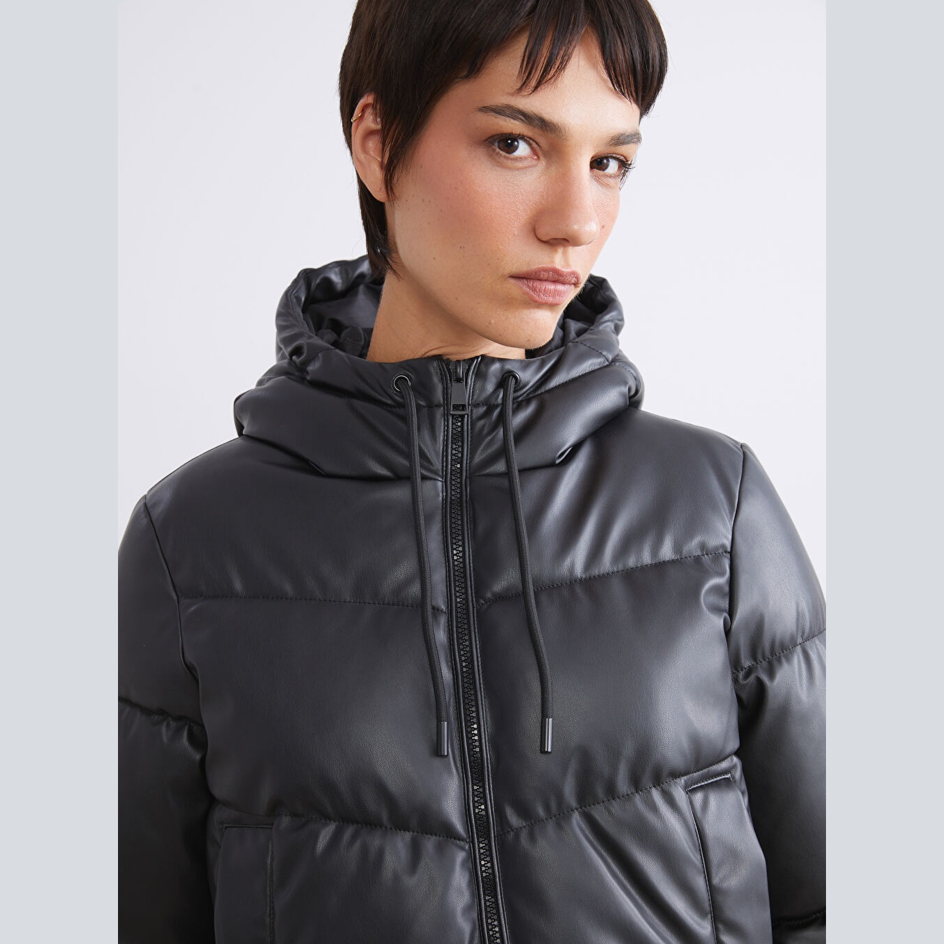 معطف نسائي شتوي بقبعة من LCW Vision – أسود (قصة واسعة، تصميم قصير، خامة جلد صناعي سادة بسماكة عالية، مزود بسحاب أمامي وقبعة ثابتة، مثالي للإطلالات الشتوية اليومية بأسلوب عصري وجريء)