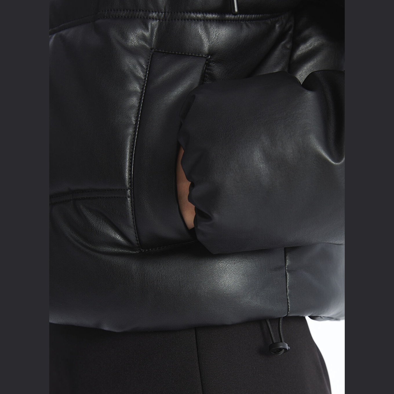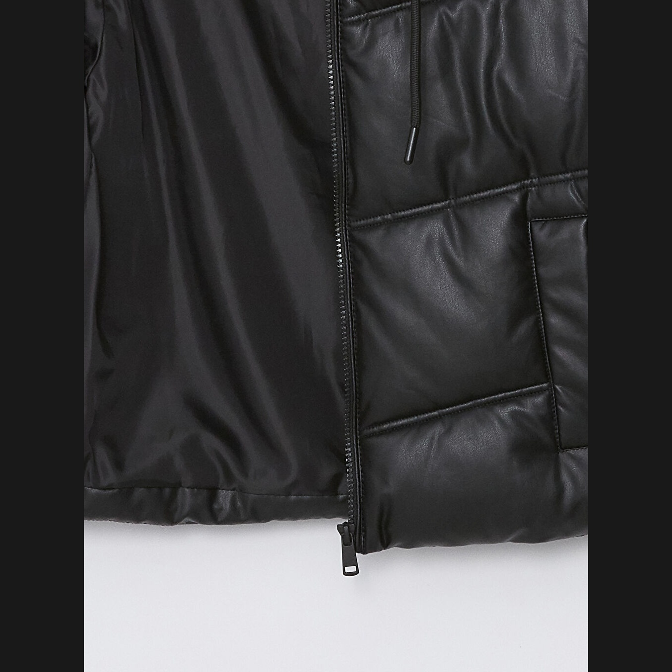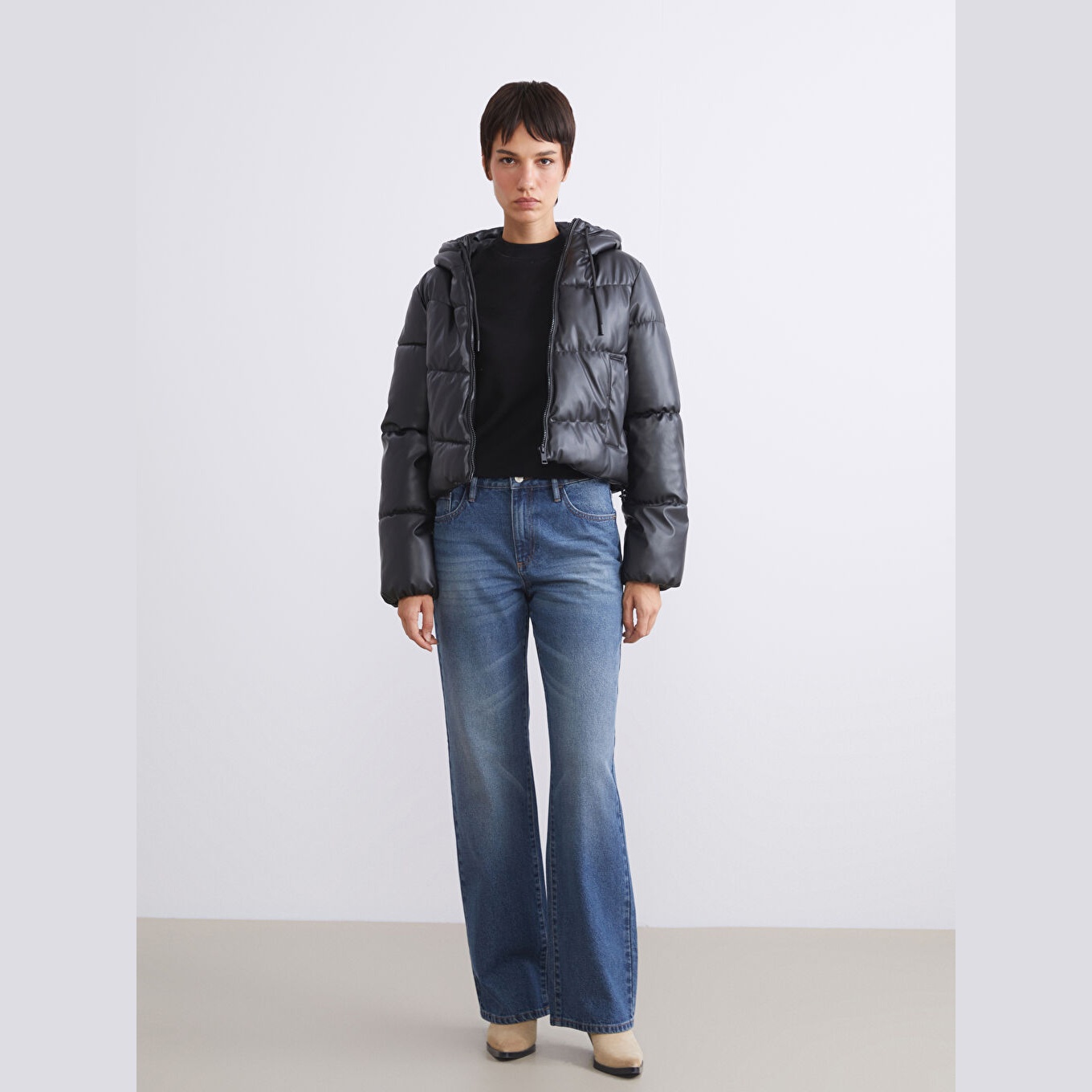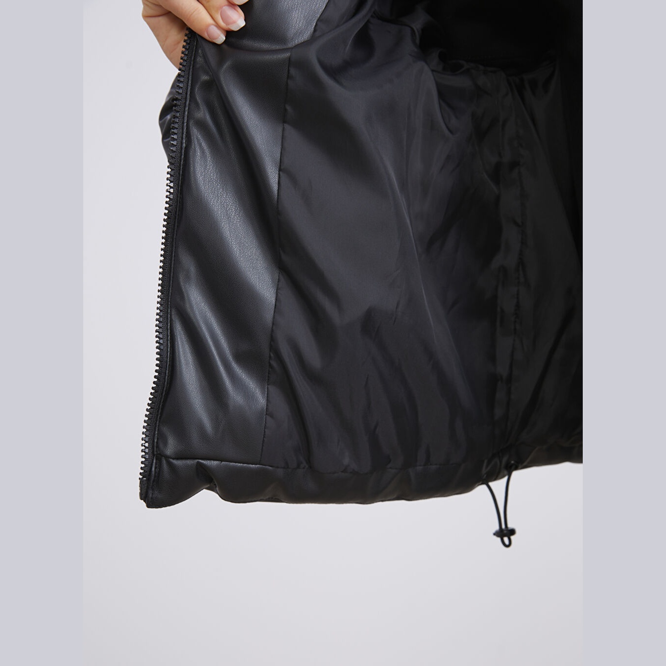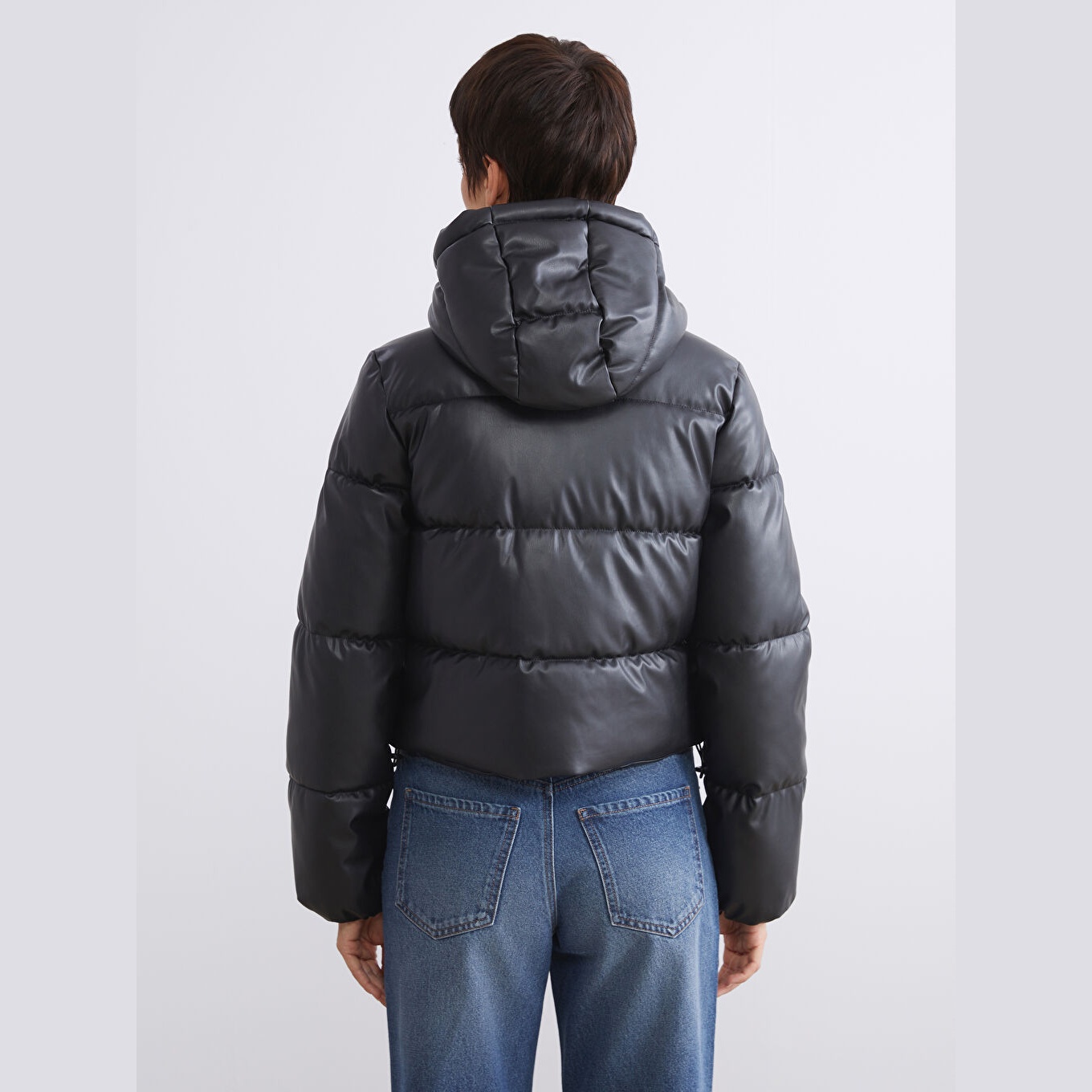 معطف نسائي شتوي بقبعة من LCW Vision – أسود (قصة واسعة، تصميم قصير، خامة جلد صناعي سادة بسماكة عالية، مزود بسحاب أمامي وقبعة ثابتة، مثالي للإطلالات الشتوية اليومية بأسلوب عصري وجريء)