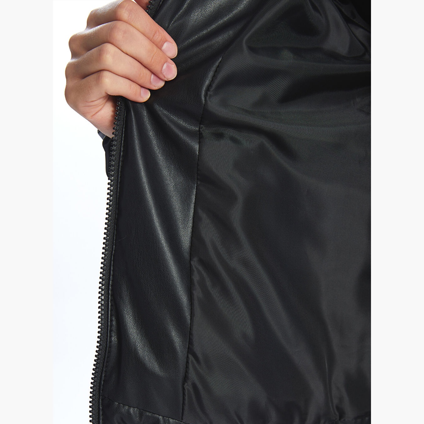 معطف شتوي بلون أسود من مجموعة LCW Vision، تصميم عملي بقبعة ثابتة للحماية من الرياح، قصة واسعة (Loose Fit) تمنحك مظهرًا عصريًا ومريحًا، خامة خارجية من جلد صناعي (طبقة بولي يوريثان فوق قماش بوليستر)، تصميم سادة بدون نقوش، مبطّنة بالكامل بـ%100 بوليستر، مع حشوة داخلية من %100 بوليستر، بطول قصير يُقاس من الكتف، مزود بسحاب أمامي، مثالي للإطلالات اليومية في الطقس البارد بأسلوب جريء ومميز.