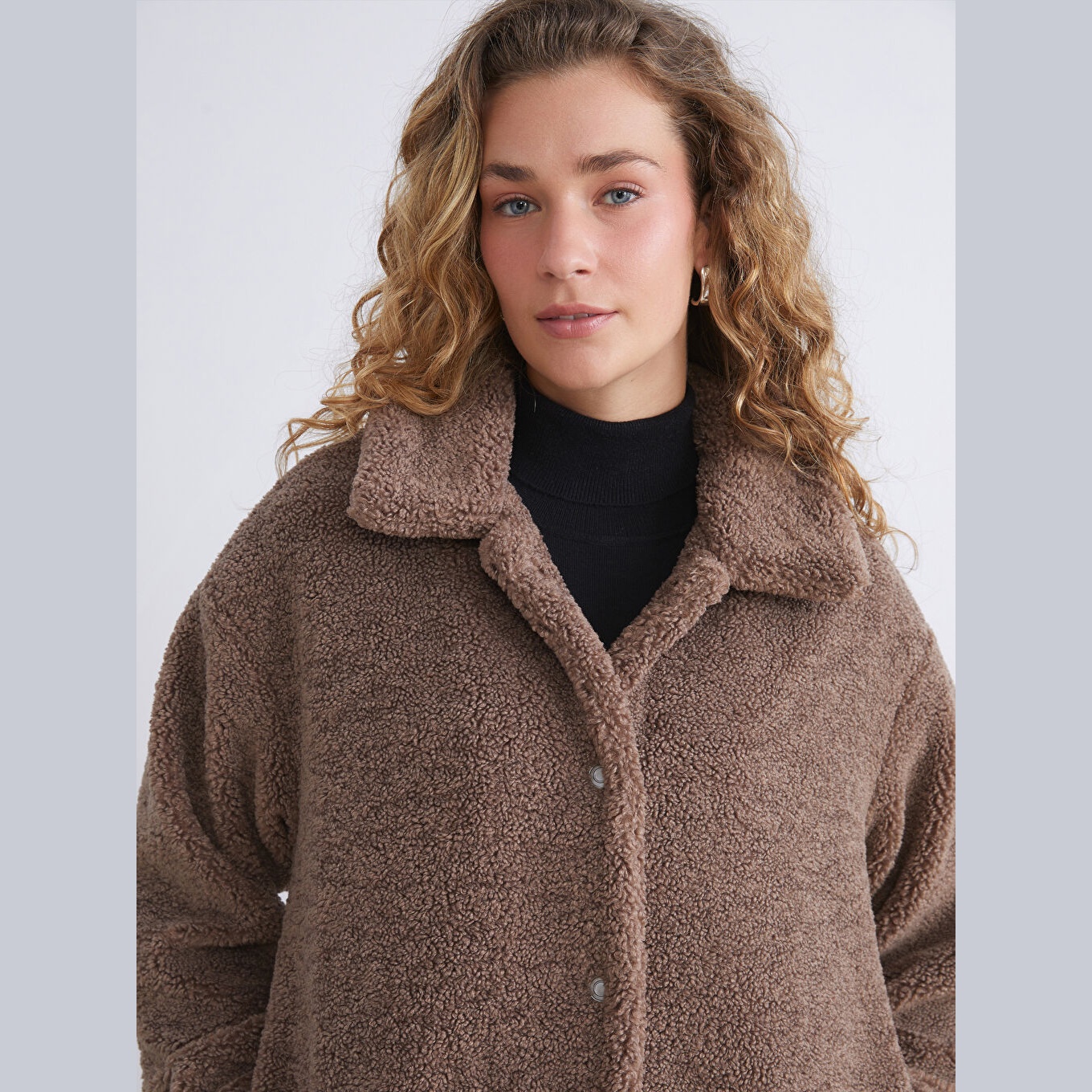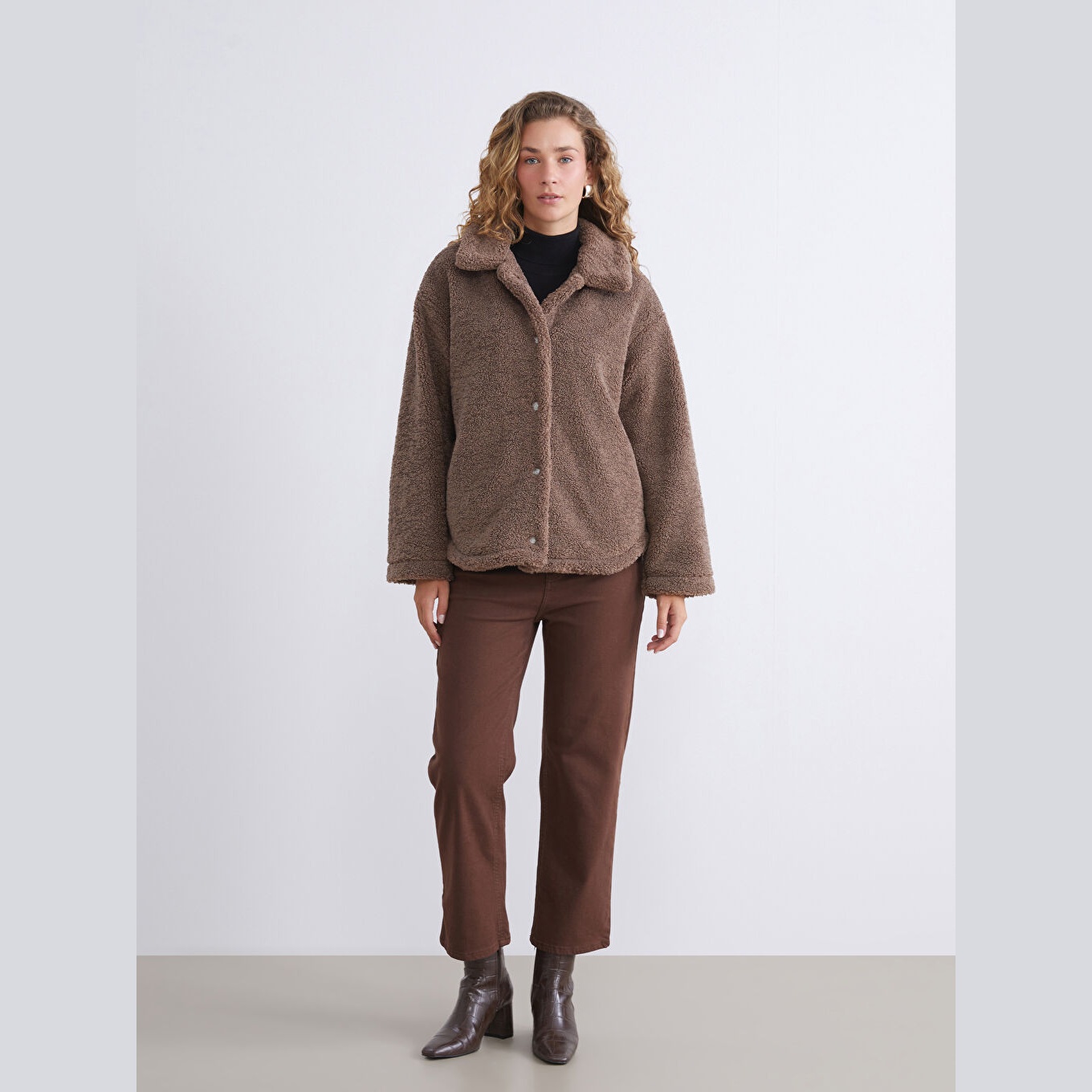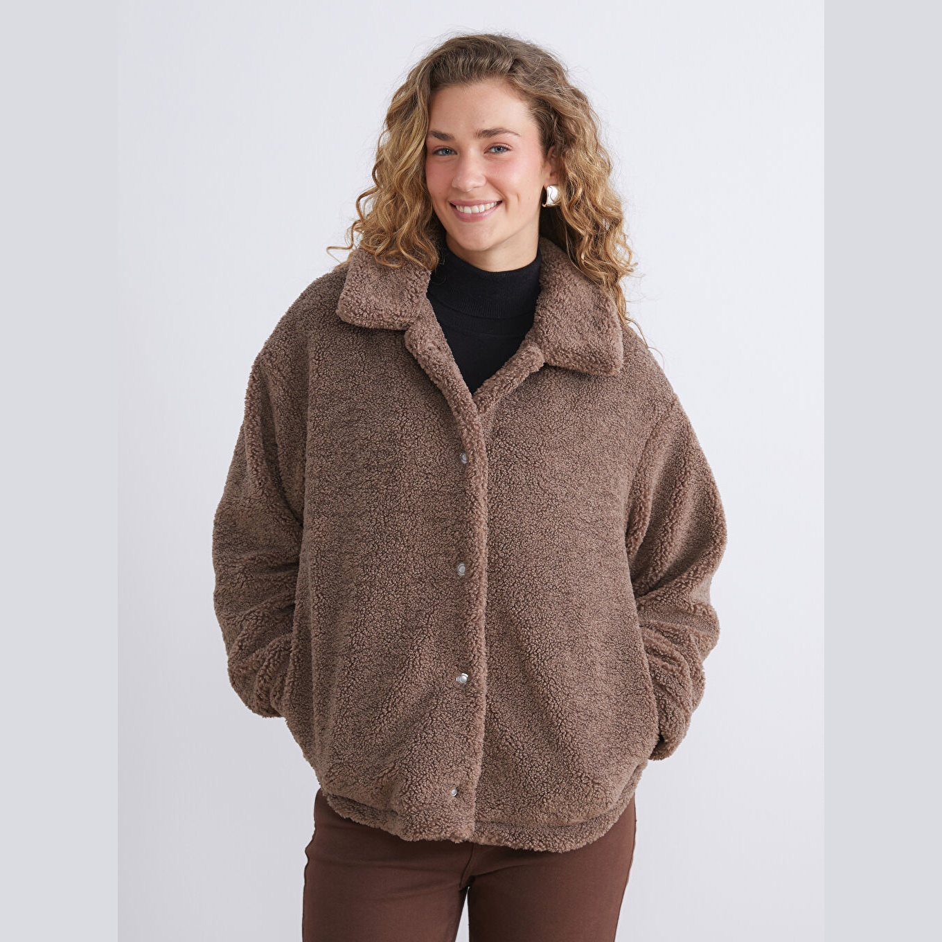 جاكيت نسائي بستايل بيلوش بياقة قميصية من LCW Modest – بني (قصة واسعة، تصميم قصير، خامة بيلوش ناعمة بسماكة عالية، مزود بأزرار أمامية، مثالي للإطلالات الشتوية اليومية بأسلوب دافئ وعصري)