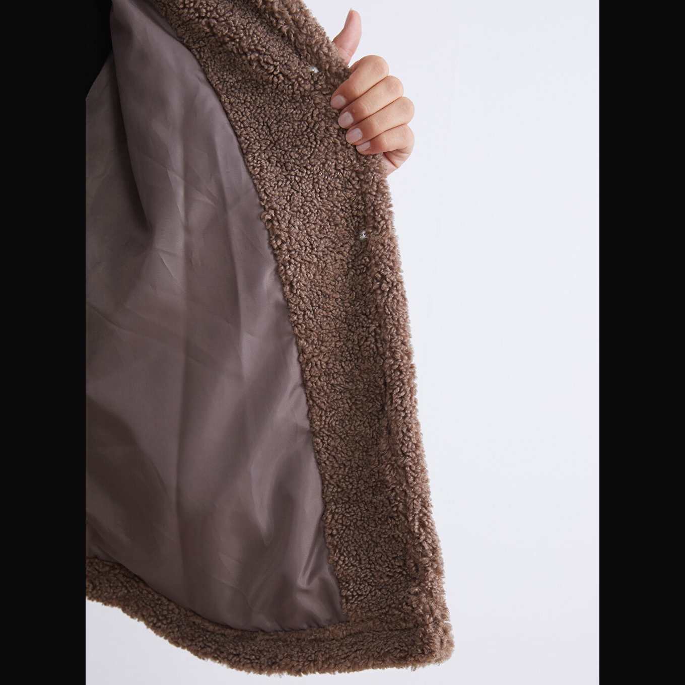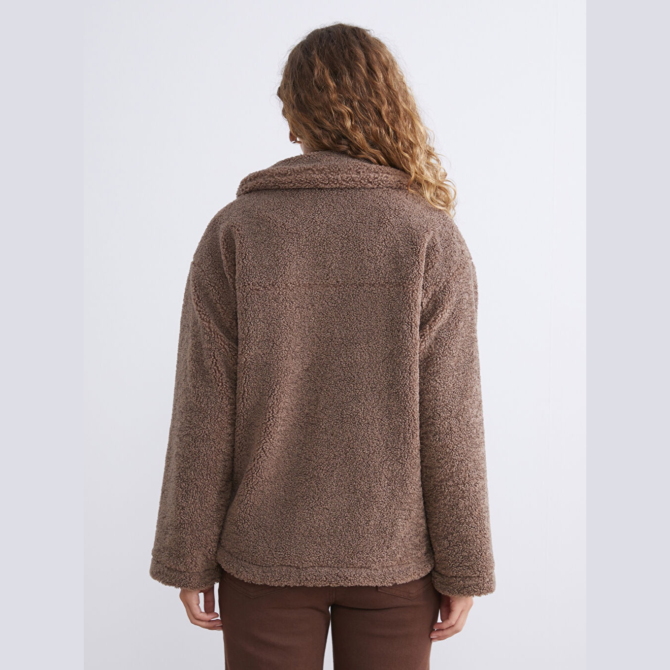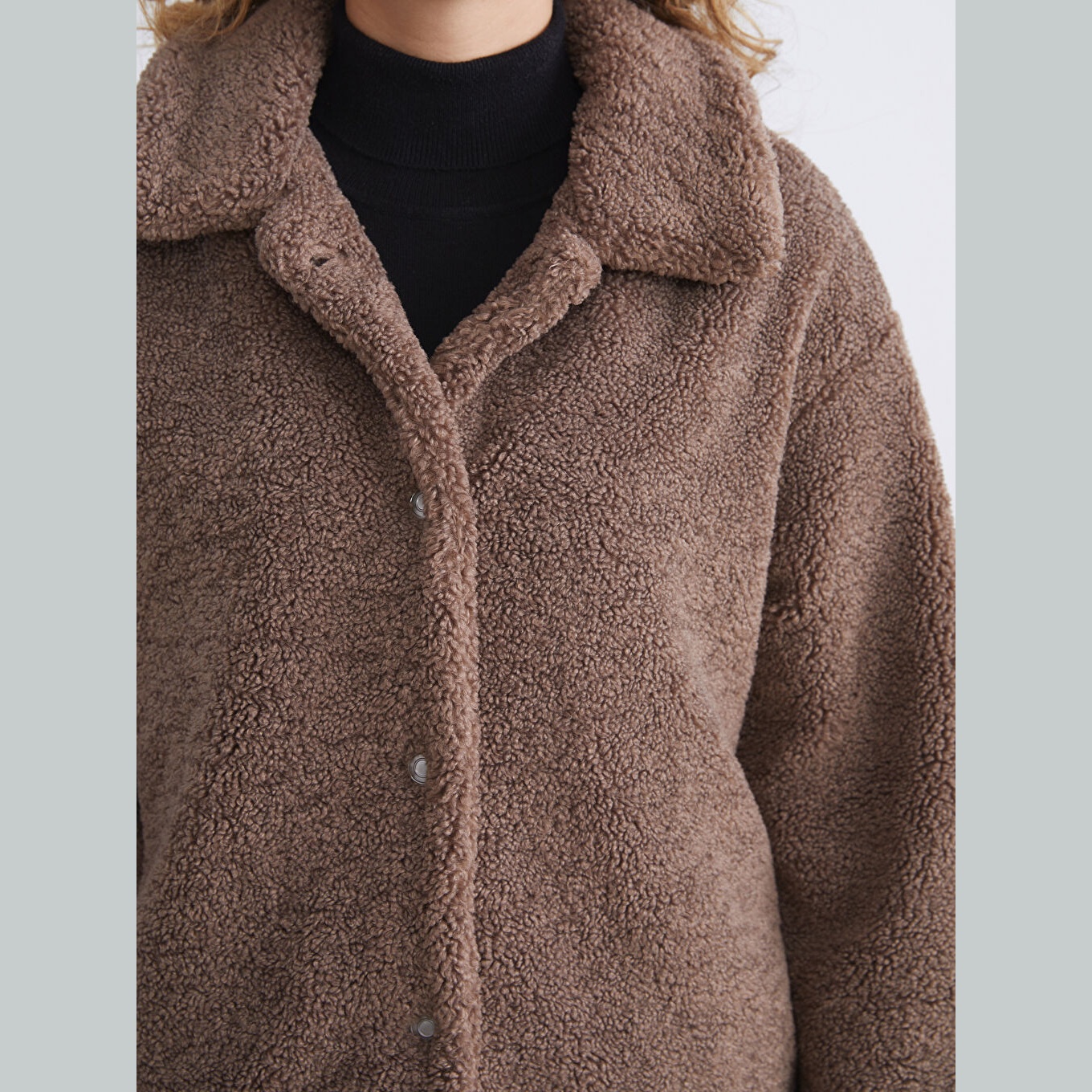 جاكيت نسائي بستايل بيلوش بياقة قميصية من LCW Modest – بني (قصة واسعة، تصميم قصير، خامة بيلوش ناعمة بسماكة عالية، مزود بأزرار أمامية، مثالي للإطلالات الشتوية اليومية بأسلوب دافئ وعصري)