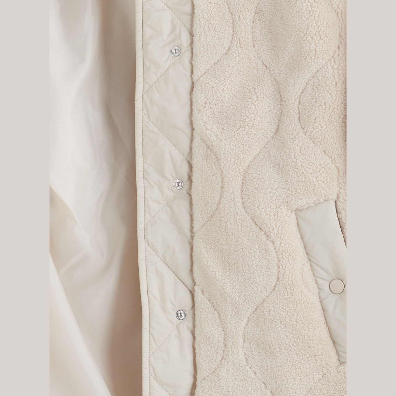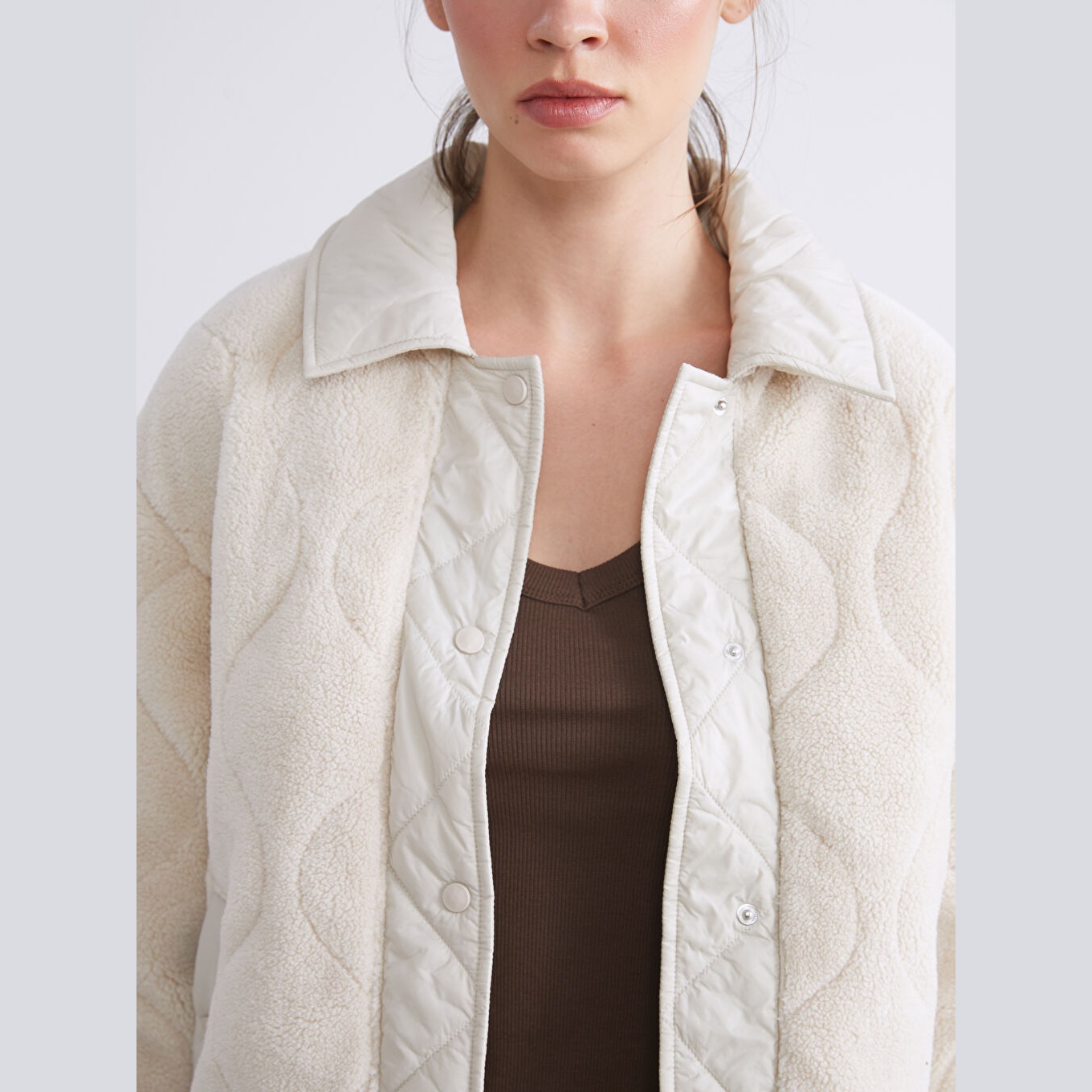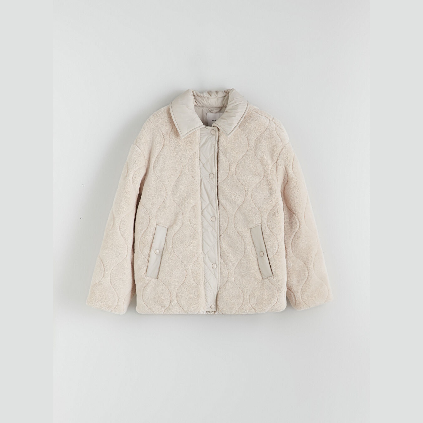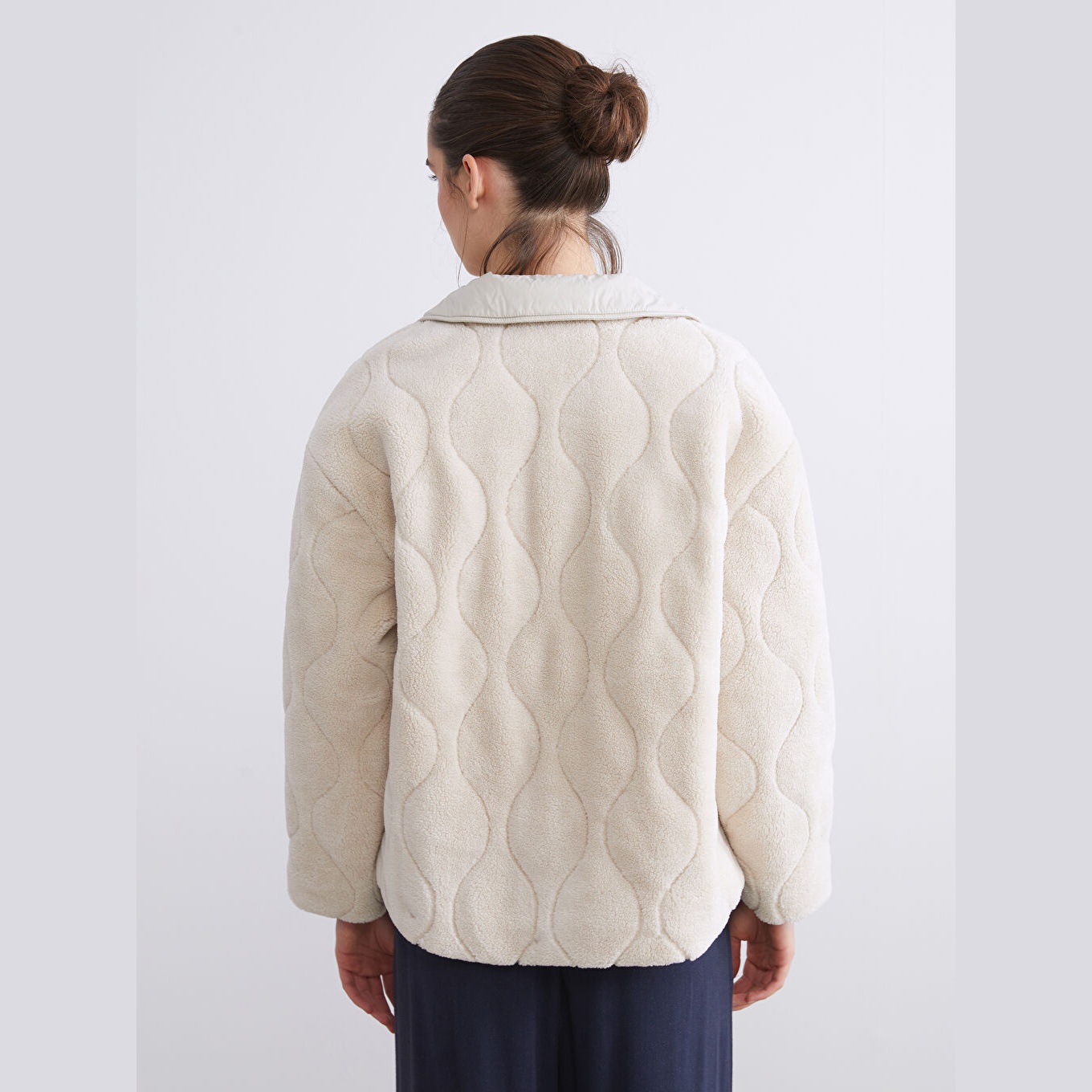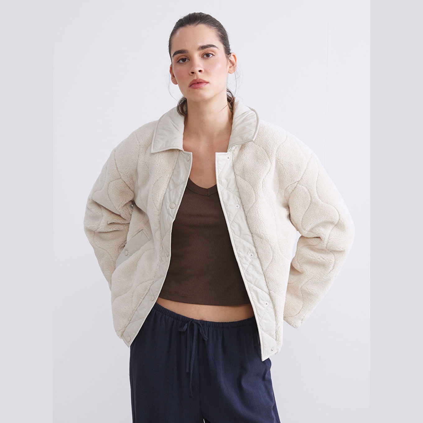جاكيت شتوي بلون إكرو من مجموعة LCW Vision، تصميم بياقة قميصية بدون قبعة، قصة واسعة (Loose Fit) تمنحك مظهرًا مريحًا وعصريًا، خامة خارجية من %100 بوليستر بنسيج بيلوش مبطّن (كابيتوني)، مبطّنة بالكامل بـ%100 بوليستر، مع حشوة داخلية من %100 بوليستر، تصميم سادة، بطول ميدي يُقاس من الكتف، مزود بأزرار أمامية، مثالي للإطلالات اليومية في الأجواء الباردة بأسلوب أنيق ودافئ.