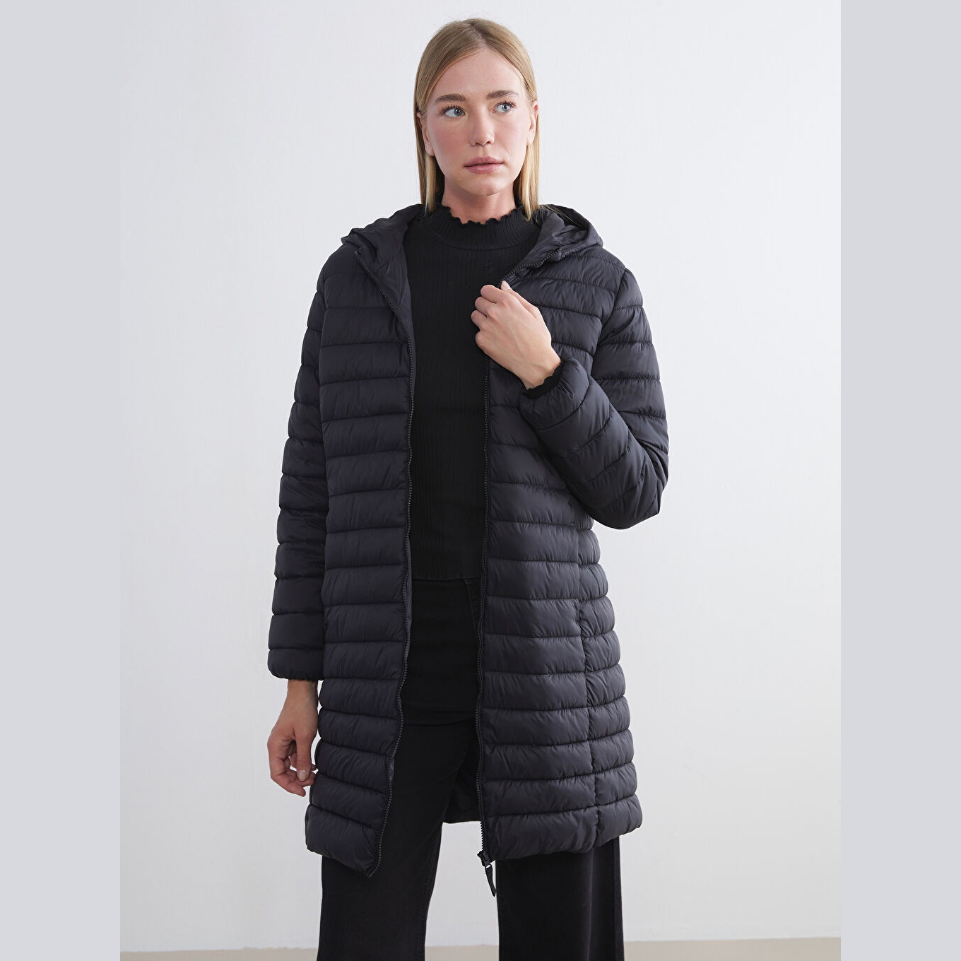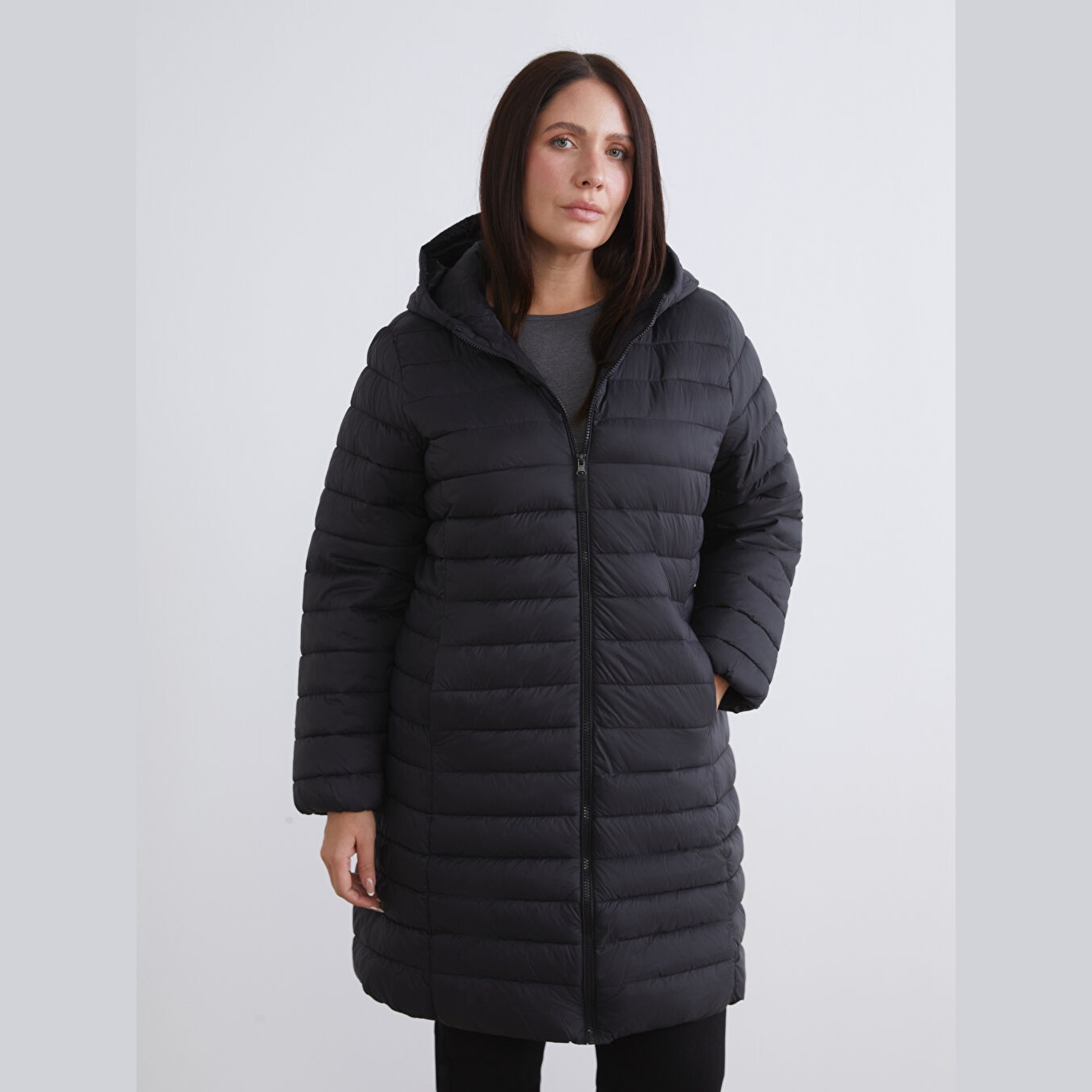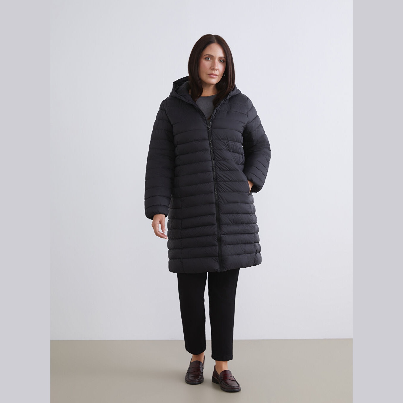 معطف نسائي شتوي بقبعة من LCWAIKIKI Büyük Beden – أسود (قصة قياسية، تصميم ميدي، خامة بولياميد سادة بسماكة متوسطة، مزود بسحاب أمامي وقبعة ثابتة، مثالي للإطلالات الشتوية اليومية بأسلوب عملي ومريح للمقاسات الكبيرة)