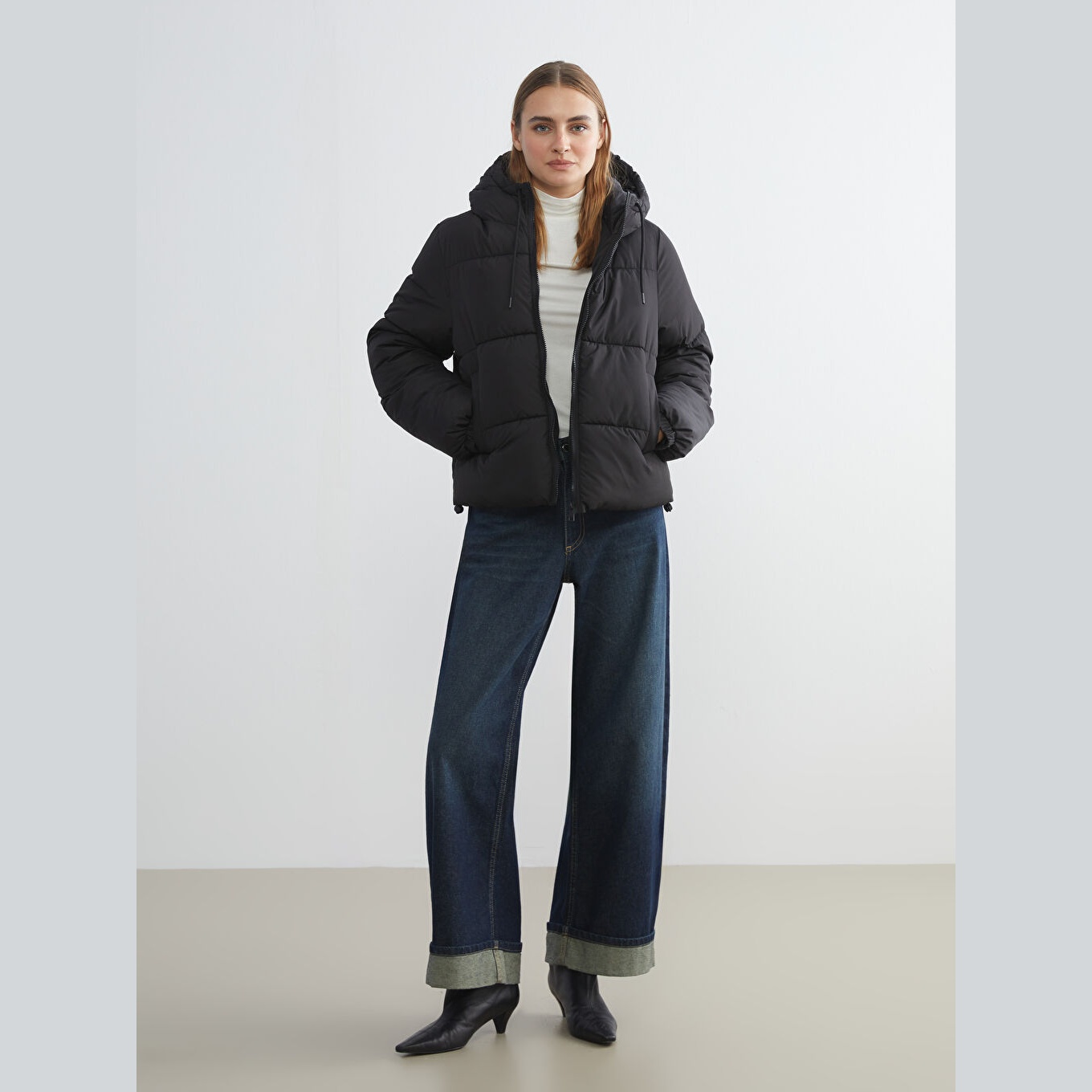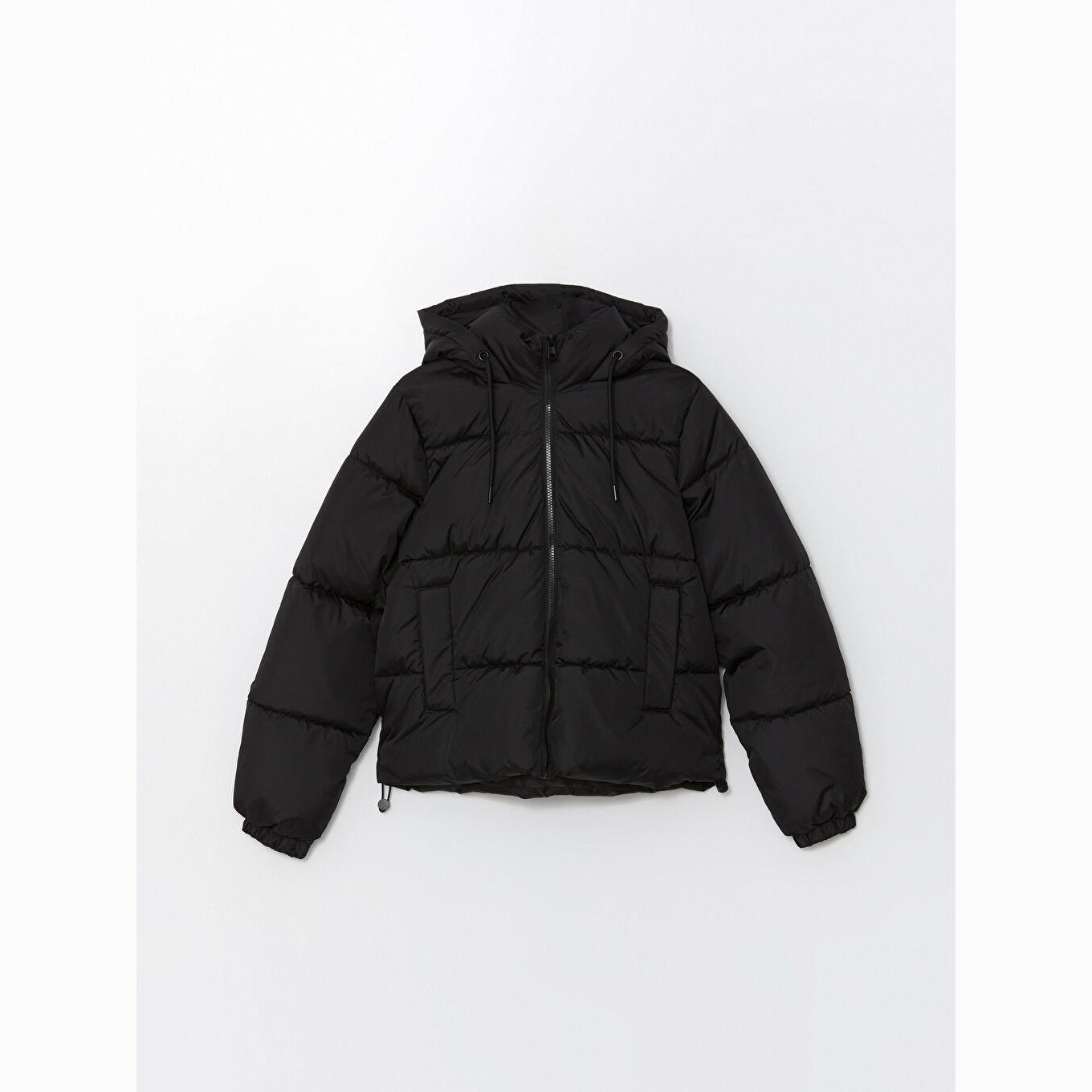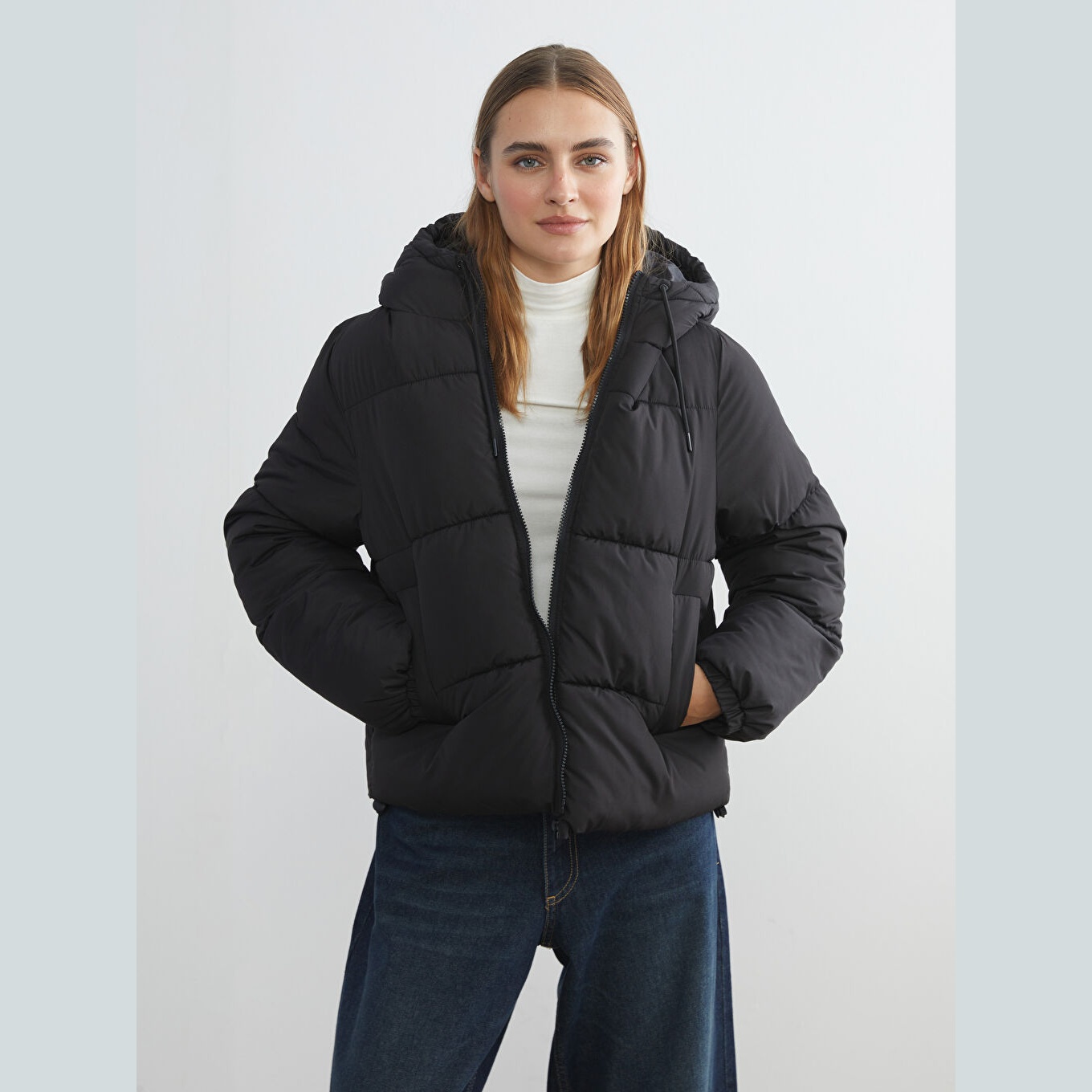 جاكيت نسائي شتوي بقبعة من LCW Vision – أسود (قصة واسعة، تصميم قصير، خامة بوليستر سادة بسماكة متوسطة، مزود بسحاب أمامي وقبعة ثابتة، مثالي للإطلالات الشتوية اليومية بأسلوب عملي وعصري)