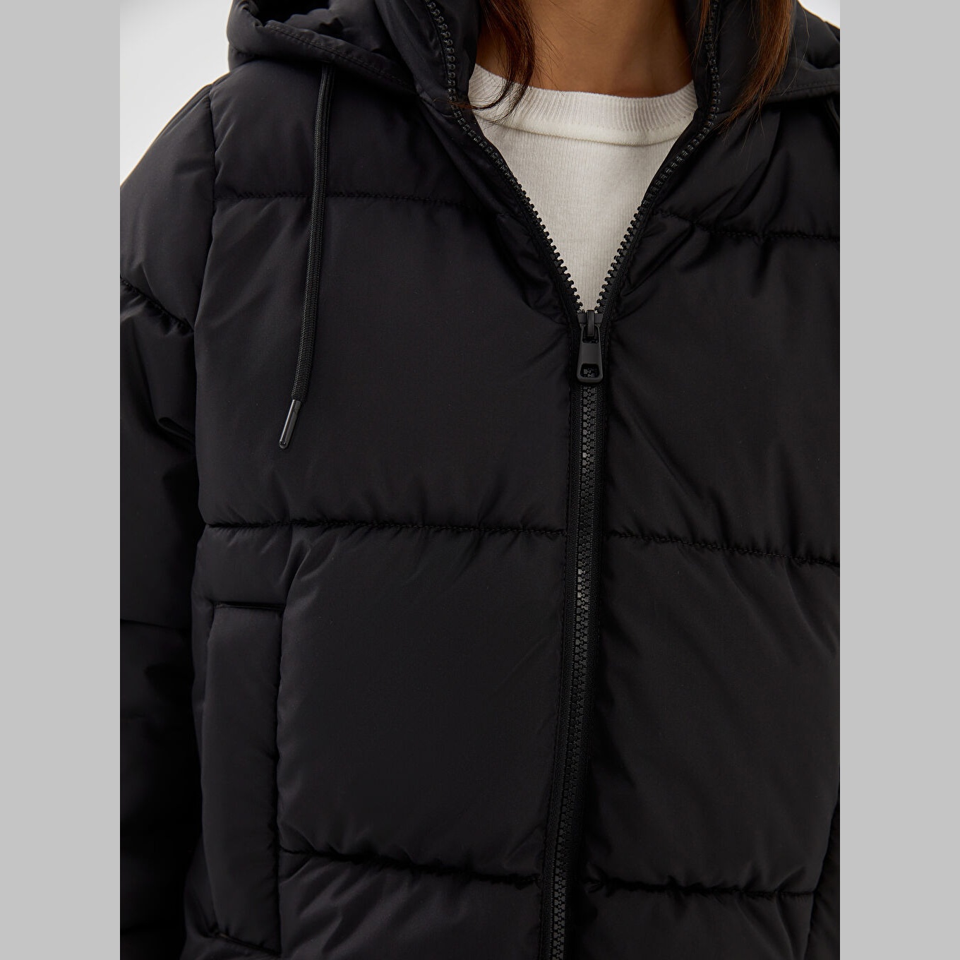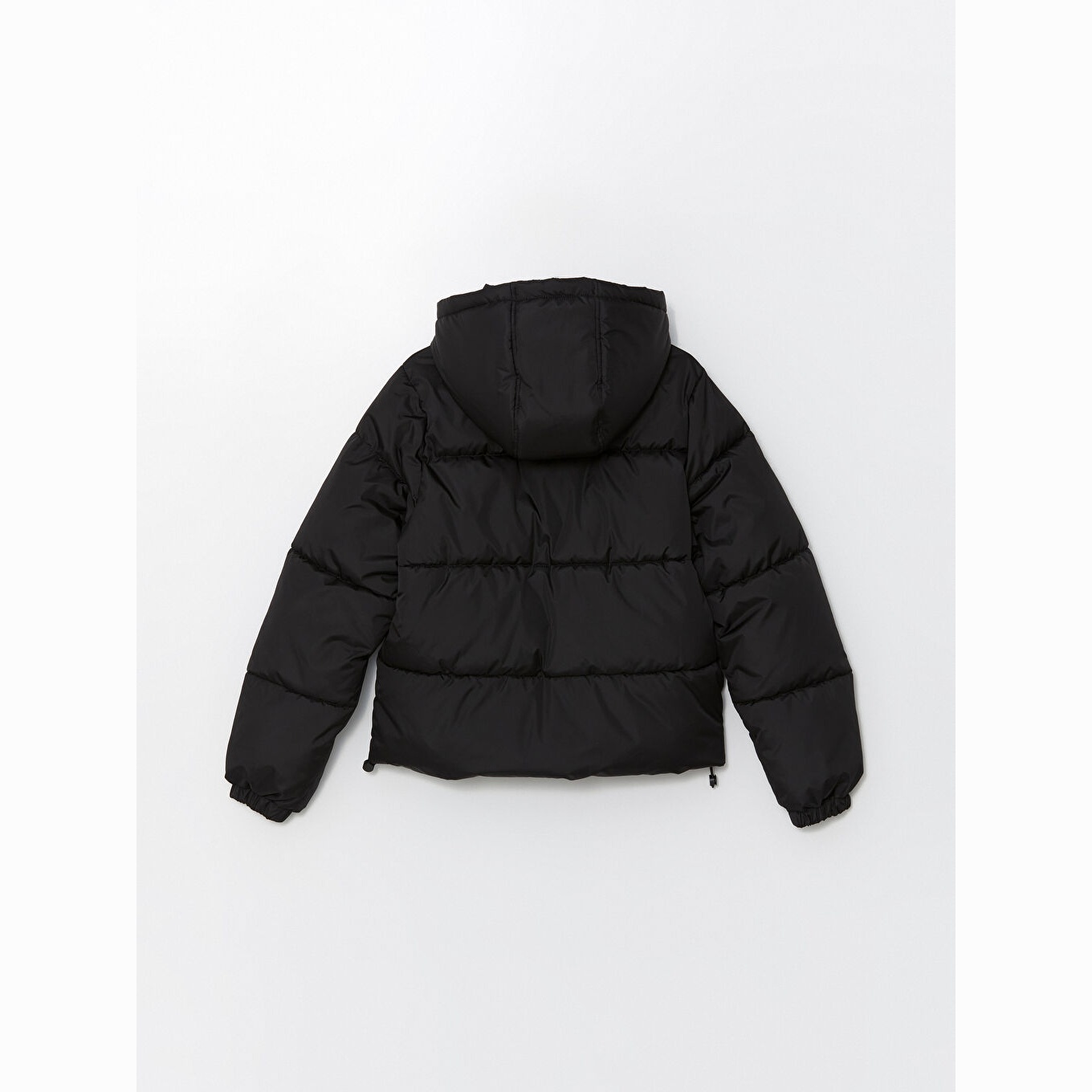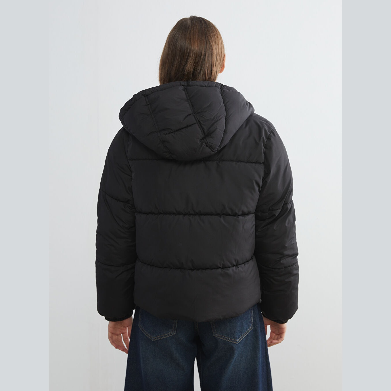 جاكيت نسائي شتوي بقبعة من LCW Vision – أسود (قصة واسعة، تصميم قصير، خامة بوليستر سادة بسماكة متوسطة، مزود بسحاب أمامي وقبعة ثابتة، مثالي للإطلالات الشتوية اليومية بأسلوب عملي وعصري)