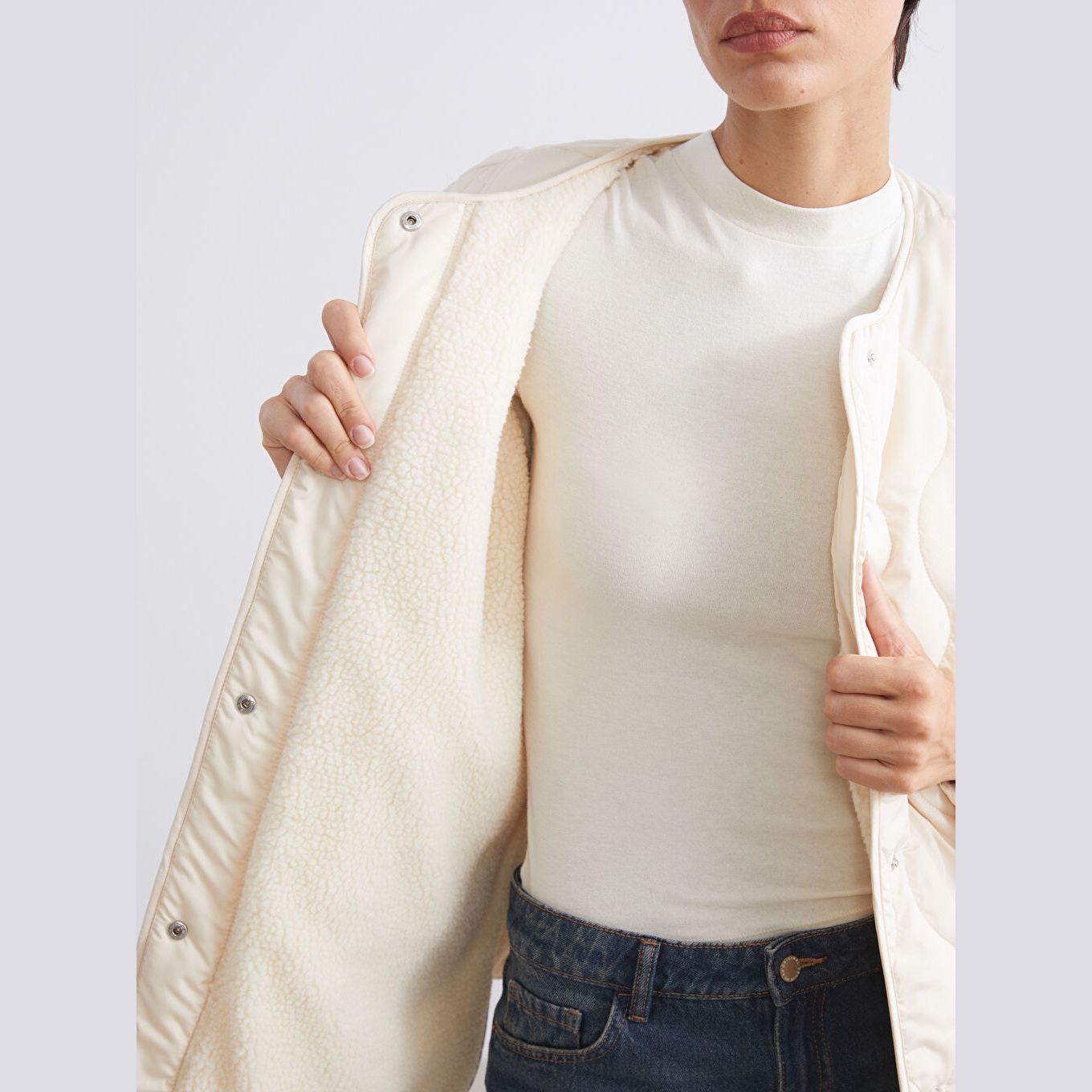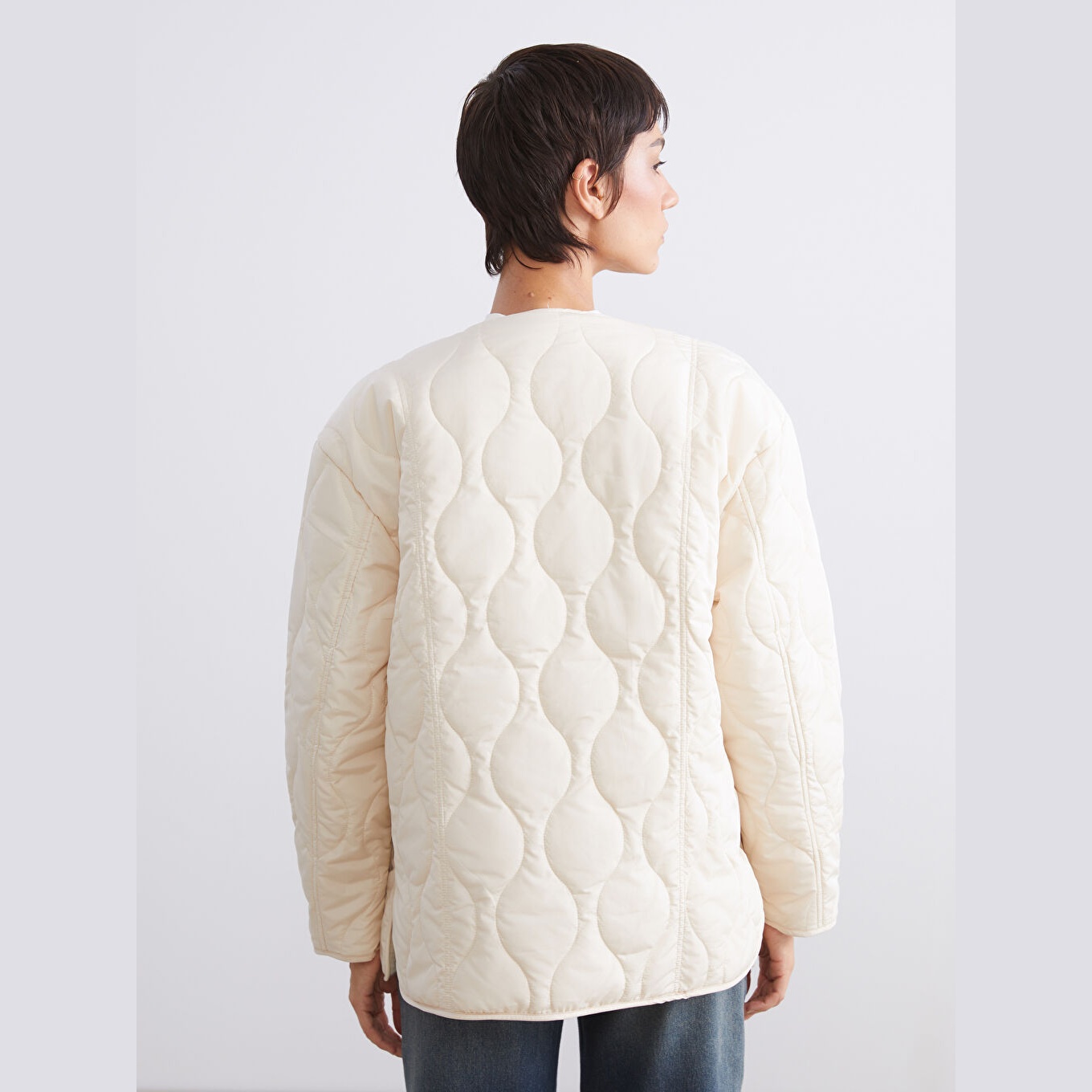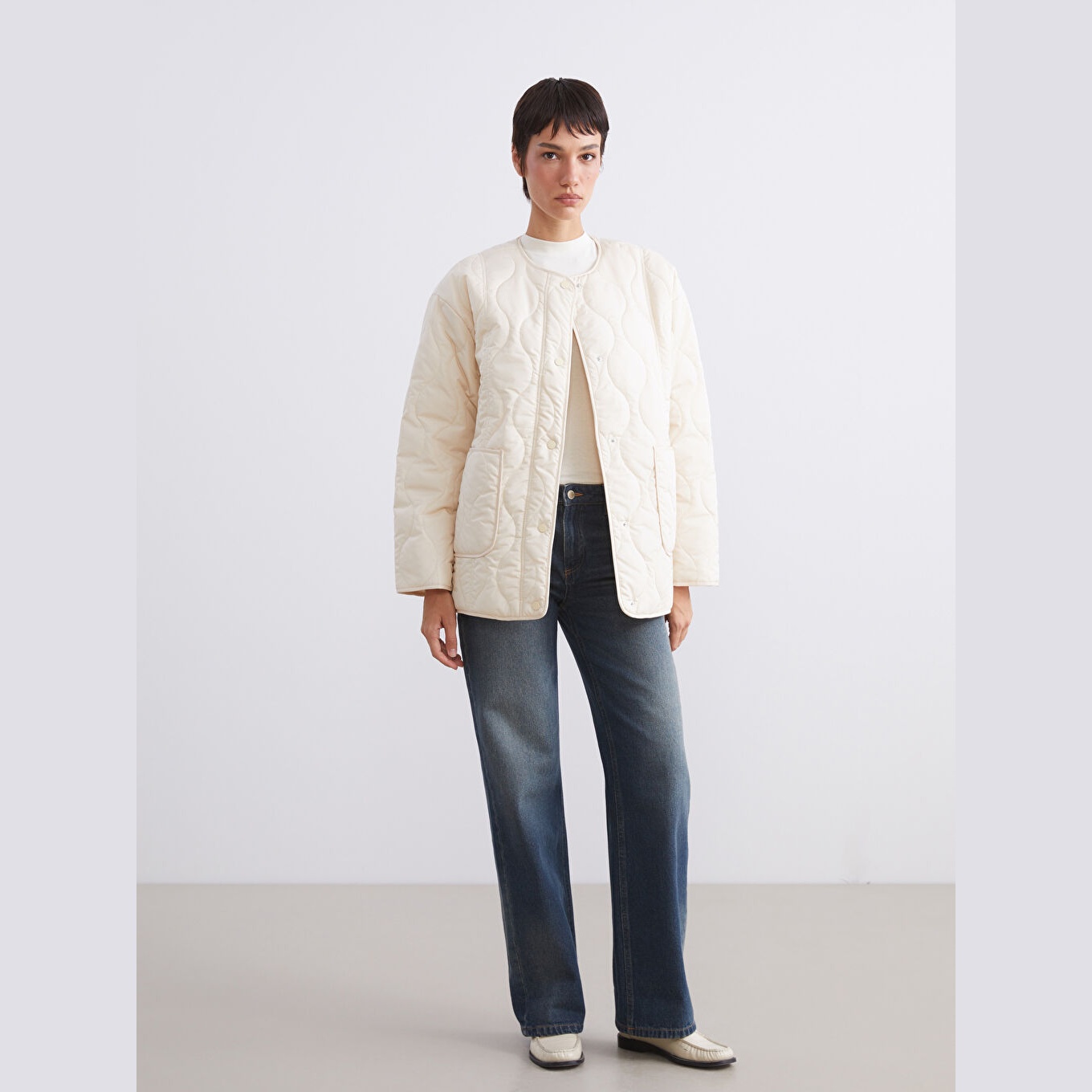 معطف شتوي بلون إكرو من مجموعة LCW Vision، تصميم بياقة دائرية (Bisiklet Yaka) بدون قبعة، قصة واسعة (Loose Fit) تمنحك مظهرًا مريحًا وعصريًا، خامة خارجية من %100 بوليستر بنمط كابيتوني، مبطّنة بطبقتين من %100 بوليستر، مع حشوة داخلية من %100 بوليستر، بطانة داخلية بملمس بيلوش ناعم، تصميم سادة، بطول ميدي يُقاس من الكتف، مزود بسحاب أمامي، مثالي للإطلالات اليومية في الطقس البارد بأسلوب أنيق ودافئ.