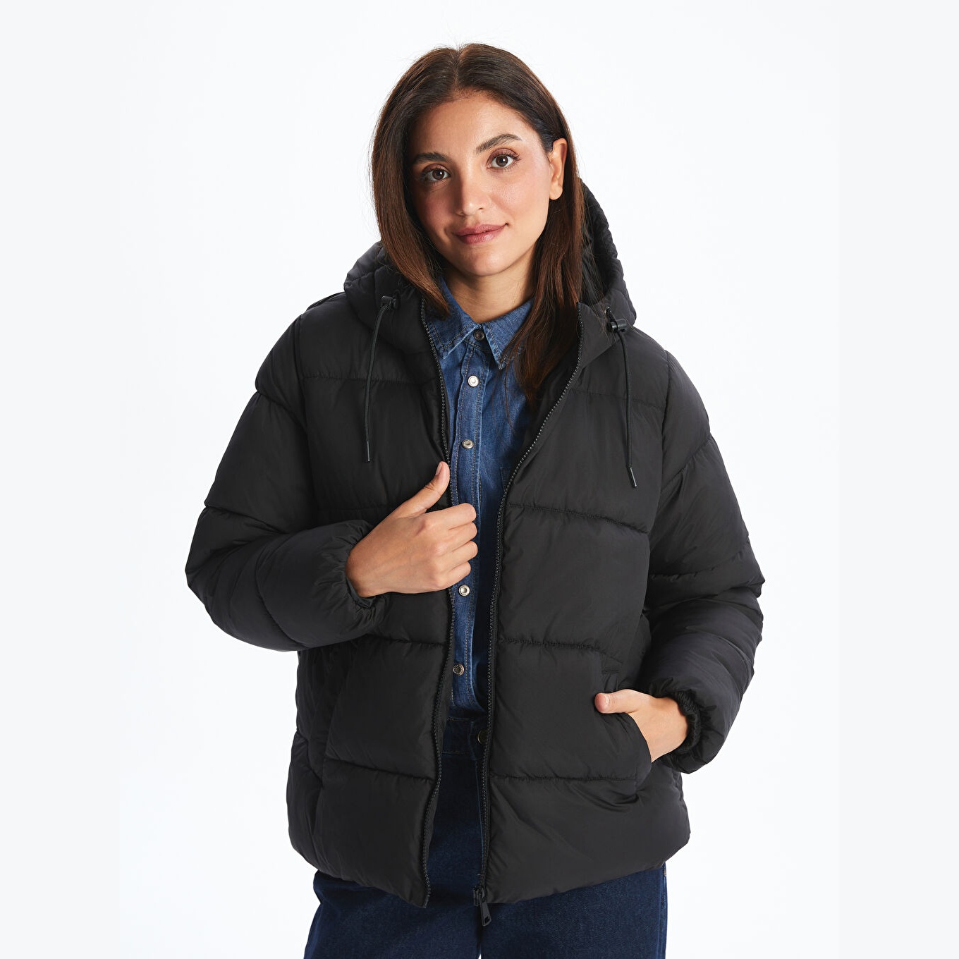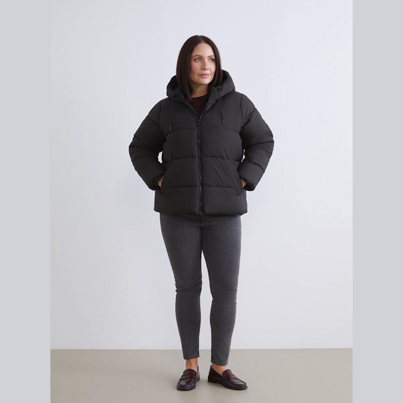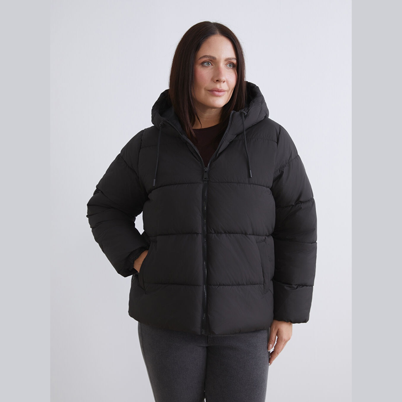 جاكيت نسائي شتوي بقبعة من LCWAIKIKI Büyük Beden – أسود (قصة واسعة، تصميم قصير، خامة بوليستر سادة بسماكة عالية، مزود بسحاب أمامي وقبعة ثابتة، مثالي للإطلالات الشتوية اليومية بأسلوب عملي ومريح للمقاسات الكبيرة)