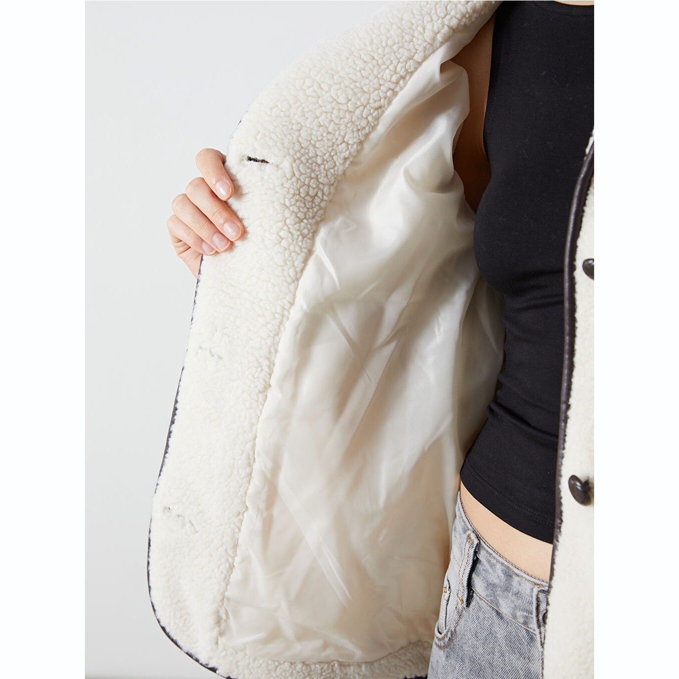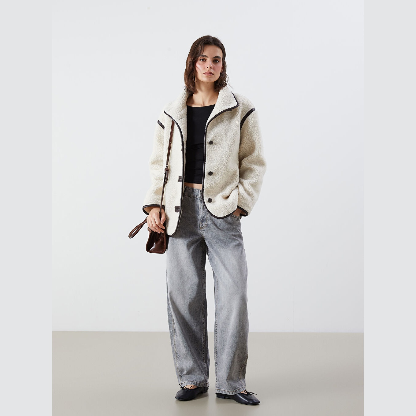جاكيت نسائي شتوي من LCW Vision – إكرو (قصة واسعة، تصميم ميدي، خامة بيليوش ناعمة مع تفاصيل بولي يوريثان، بياقة قميص، بدون قبعة، مثالي للإطلالات الشتوية اليومية بأسلوب أنيق وفاخر)