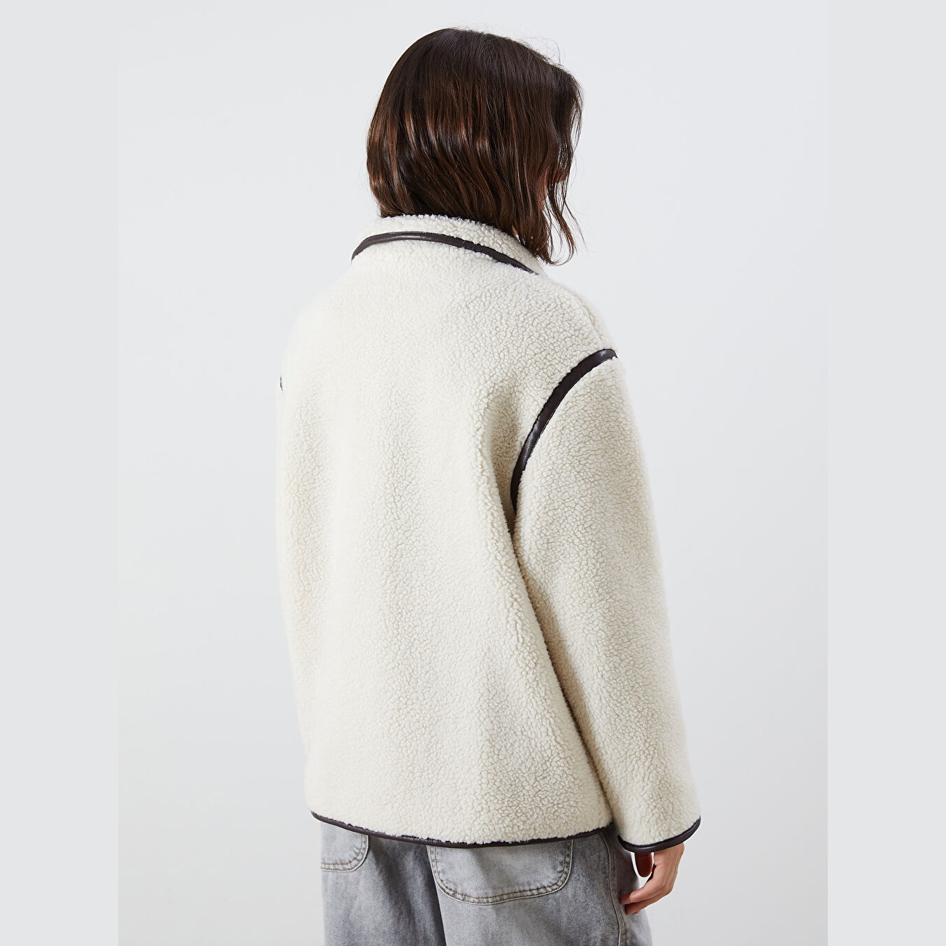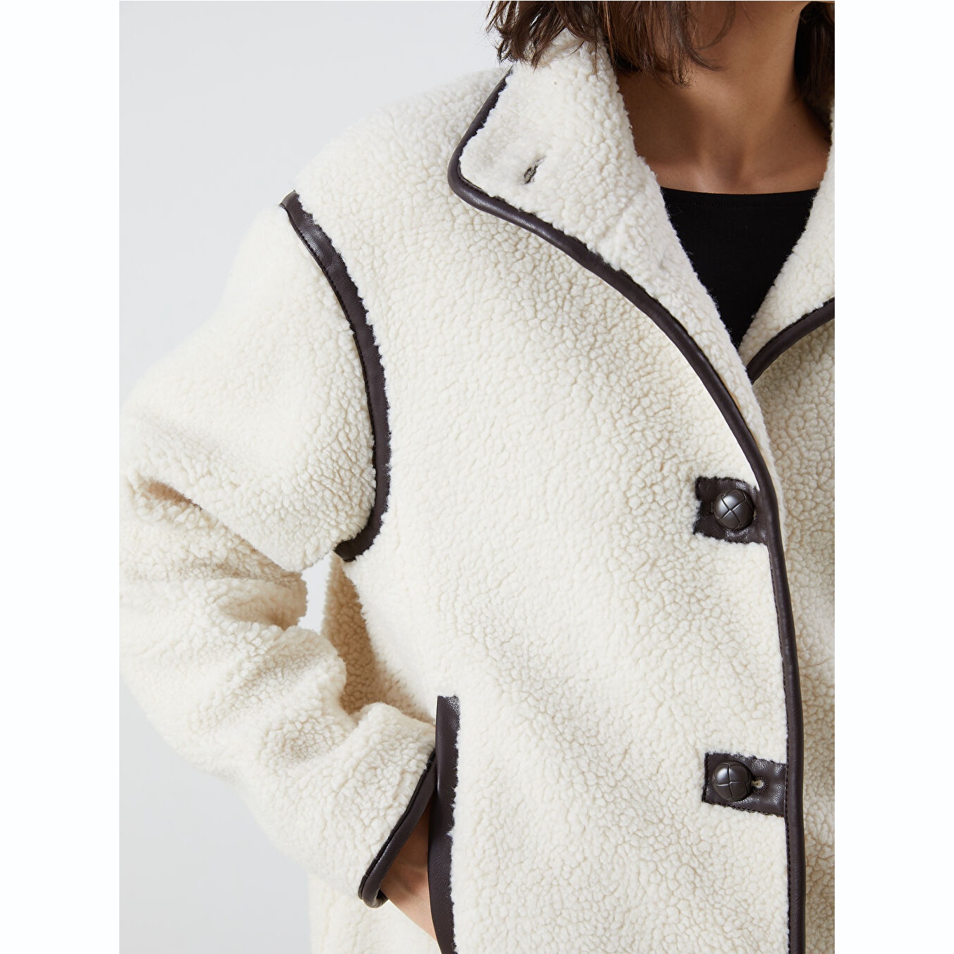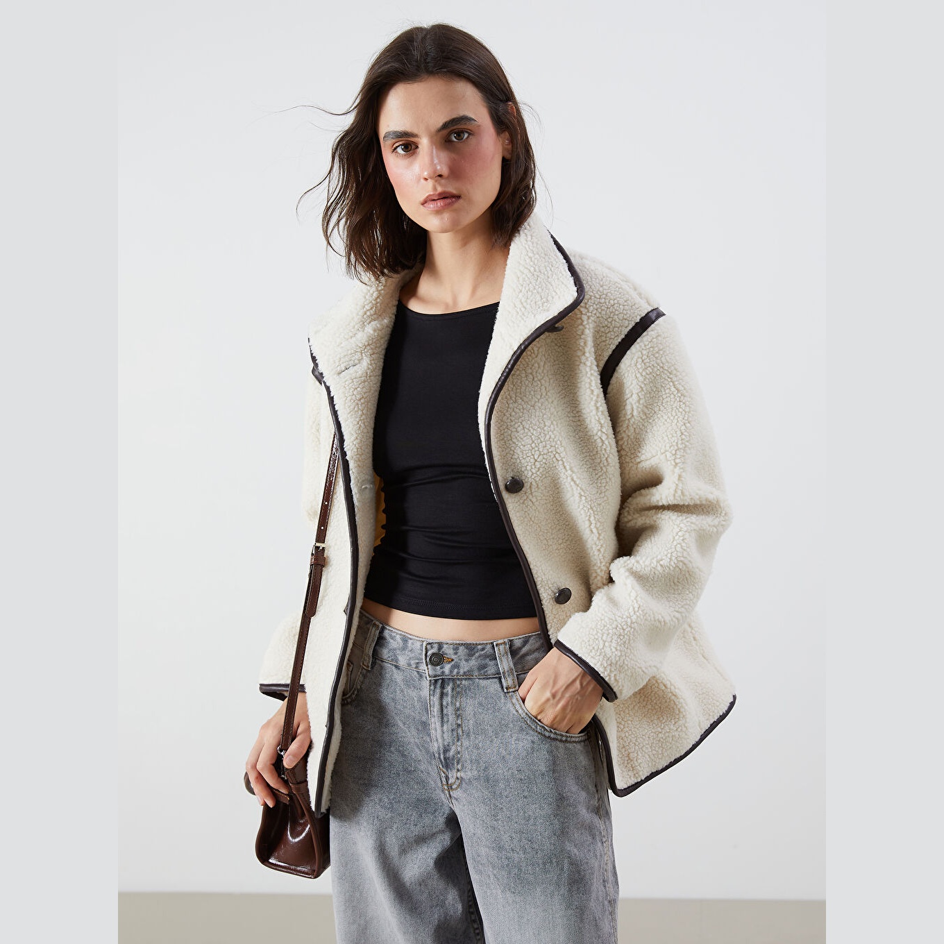 جاكيت شتوي بلون إكرو من مجموعة LCW Vision، تصميم بياقة قميص (Ceket Yaka) يمنحك مظهرًا أنيقًا وكلاسيكيًا، قصة واسعة (Loose Fit) توفر راحة وأناقة، خامة خارجية من %100 بوليستر بملمس بيليوش ناعم، مع تفاصيل إضافية من %100 بولي يوريثان تضيف لمسة فاخرة، مبطّنة بالكامل بـ%100 بوليستر، تصميم سادة بدون نقوش، بطول ميدي يُقاس من الكتف، بدون قبعة، مثالي للإطلالات اليومية في الطقس البارد بأسلوب أنيق ومريح.