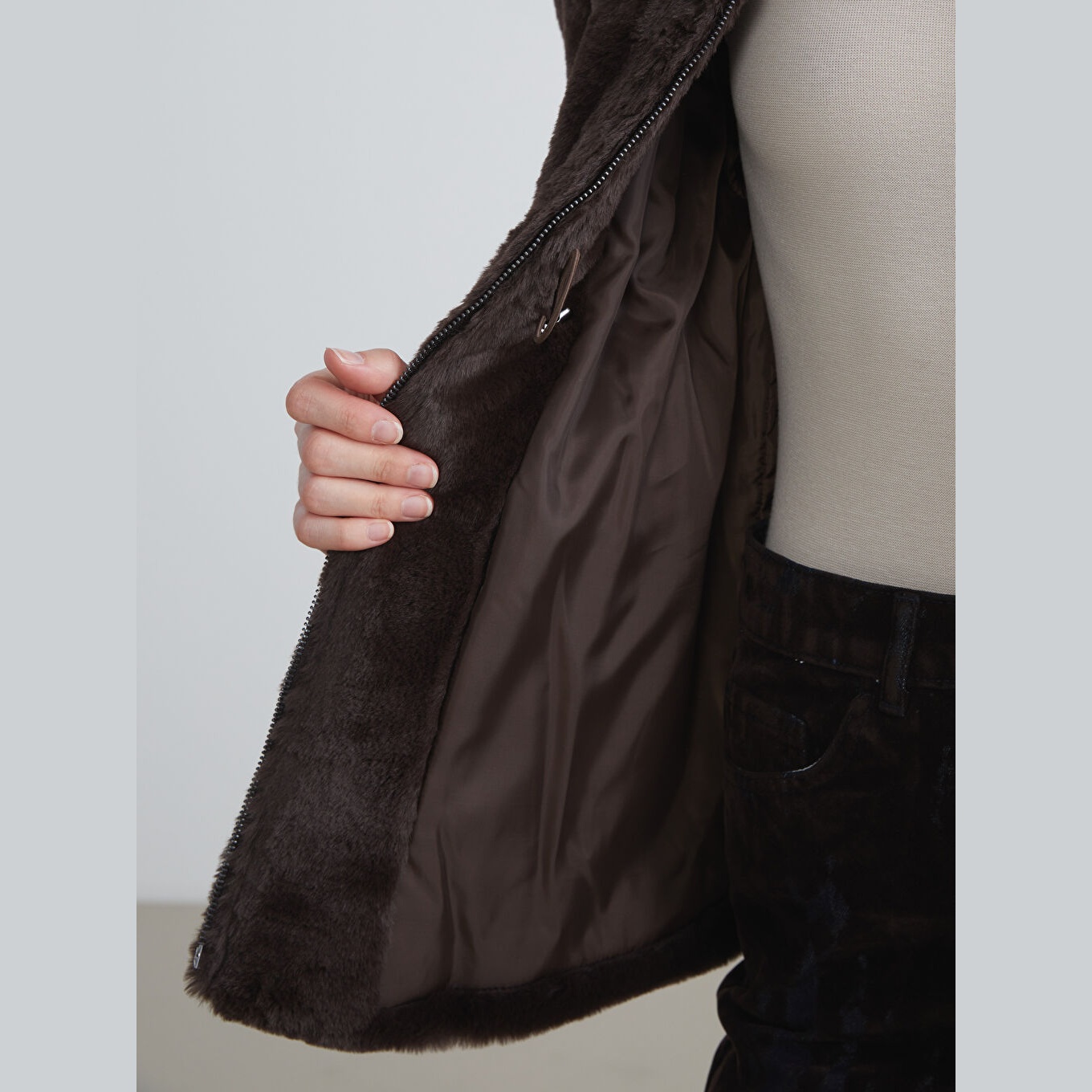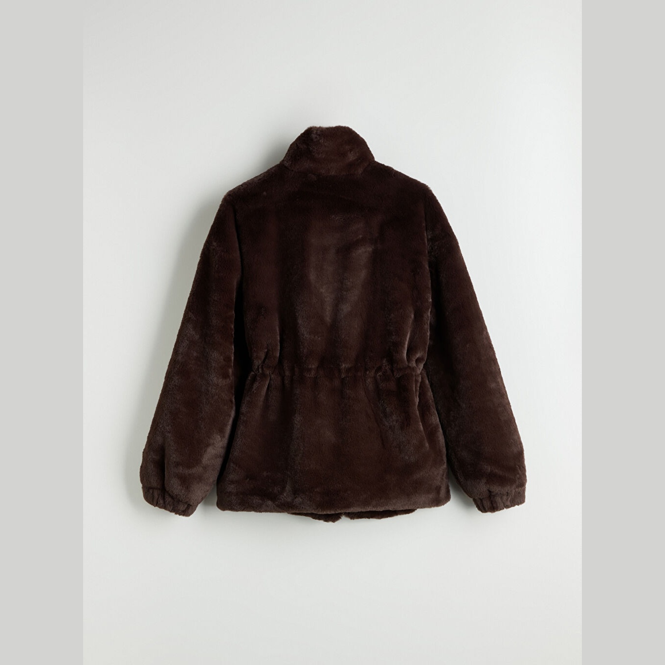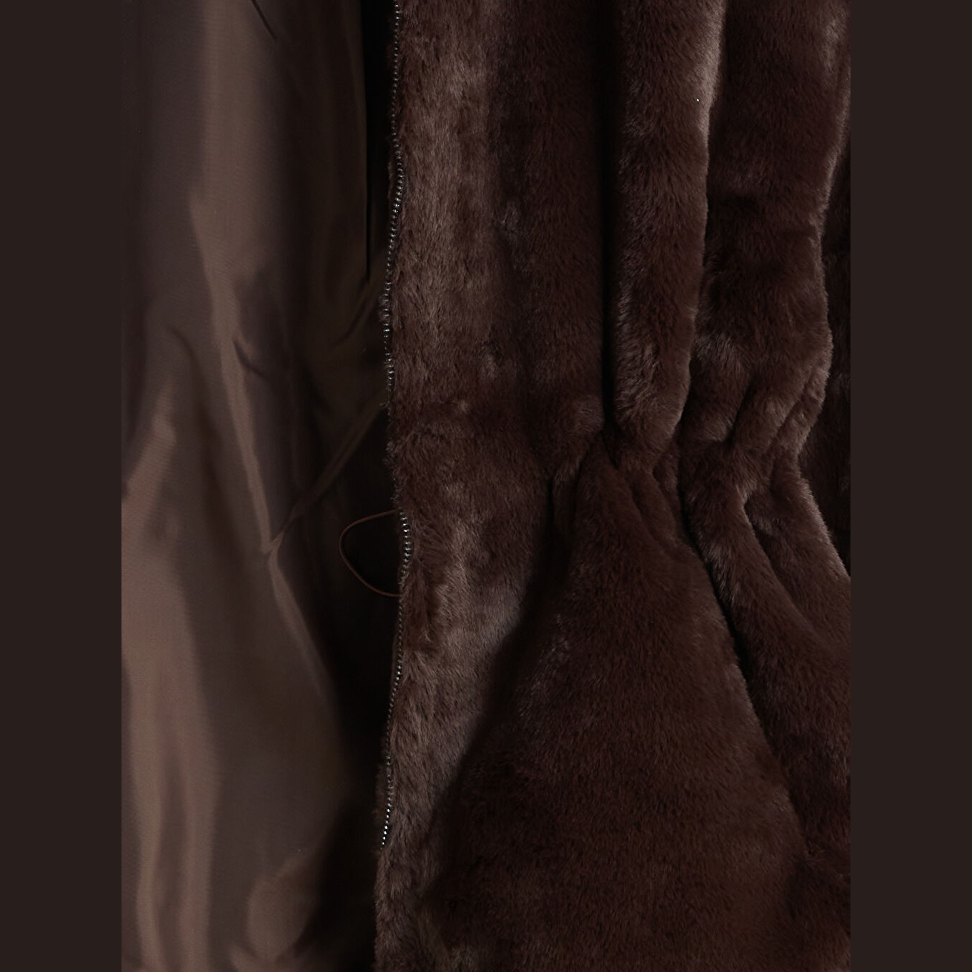 جاكيت نسائي شتوي من LCW Vision – بني (قصة واسعة، تصميم ميدي، خامة بيليوش ناعمة، بياقة مستقيمة، بدون قبعة، مثالي للإطلالات الشتوية اليومية بأسلوب أنيق ودافئ)