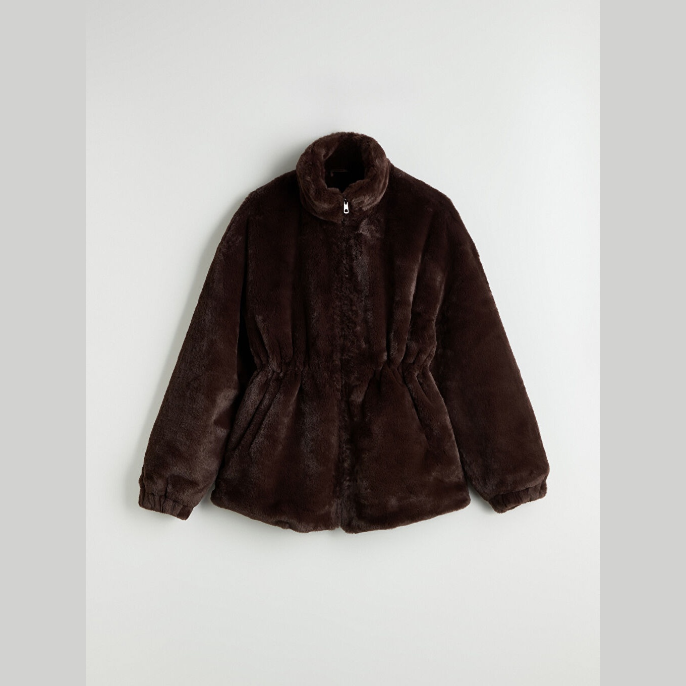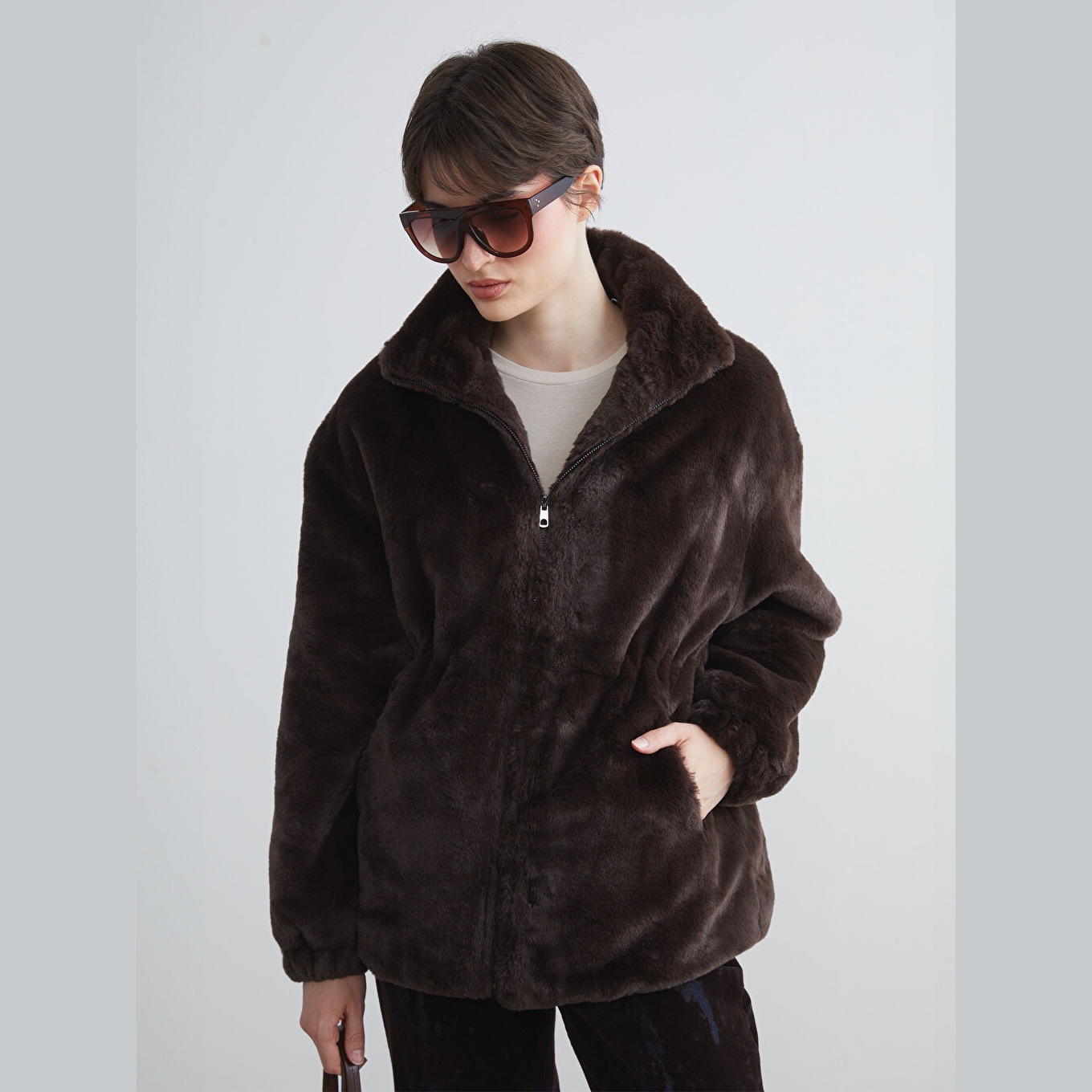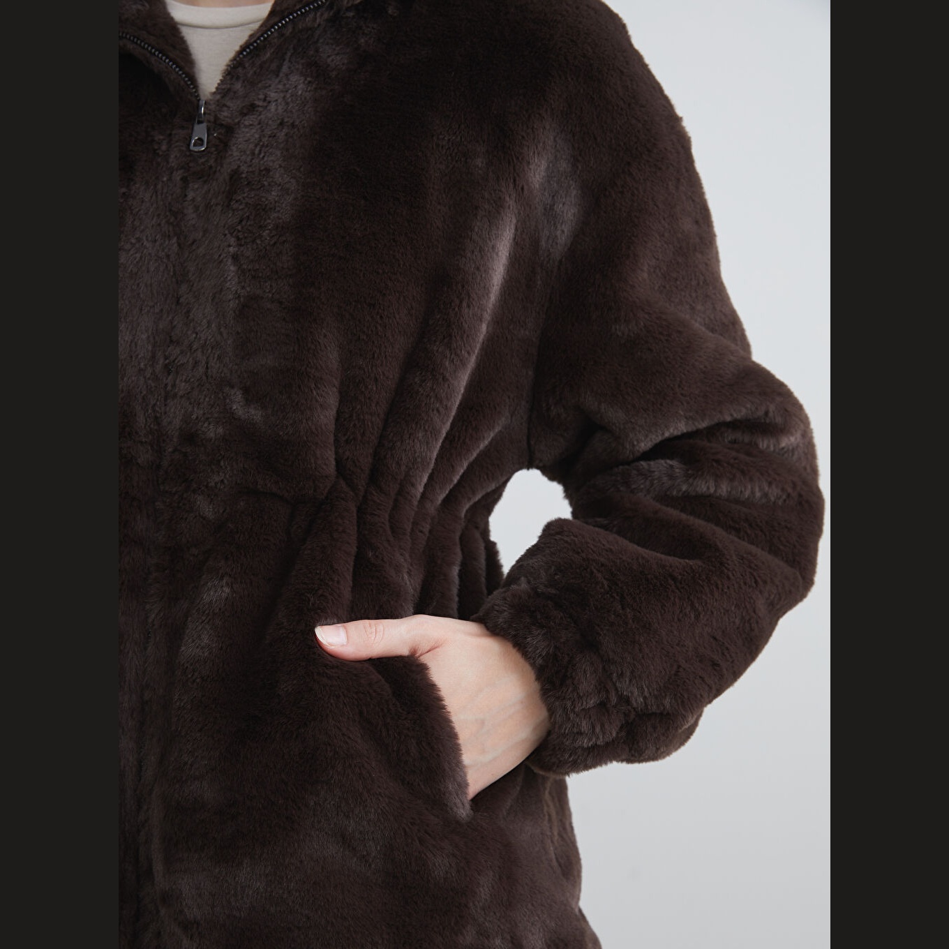 جاكيت نسائي شتوي من LCW Vision – بني (قصة واسعة، تصميم ميدي، خامة بيليوش ناعمة، بياقة مستقيمة، بدون قبعة، مثالي للإطلالات الشتوية اليومية بأسلوب أنيق ودافئ)