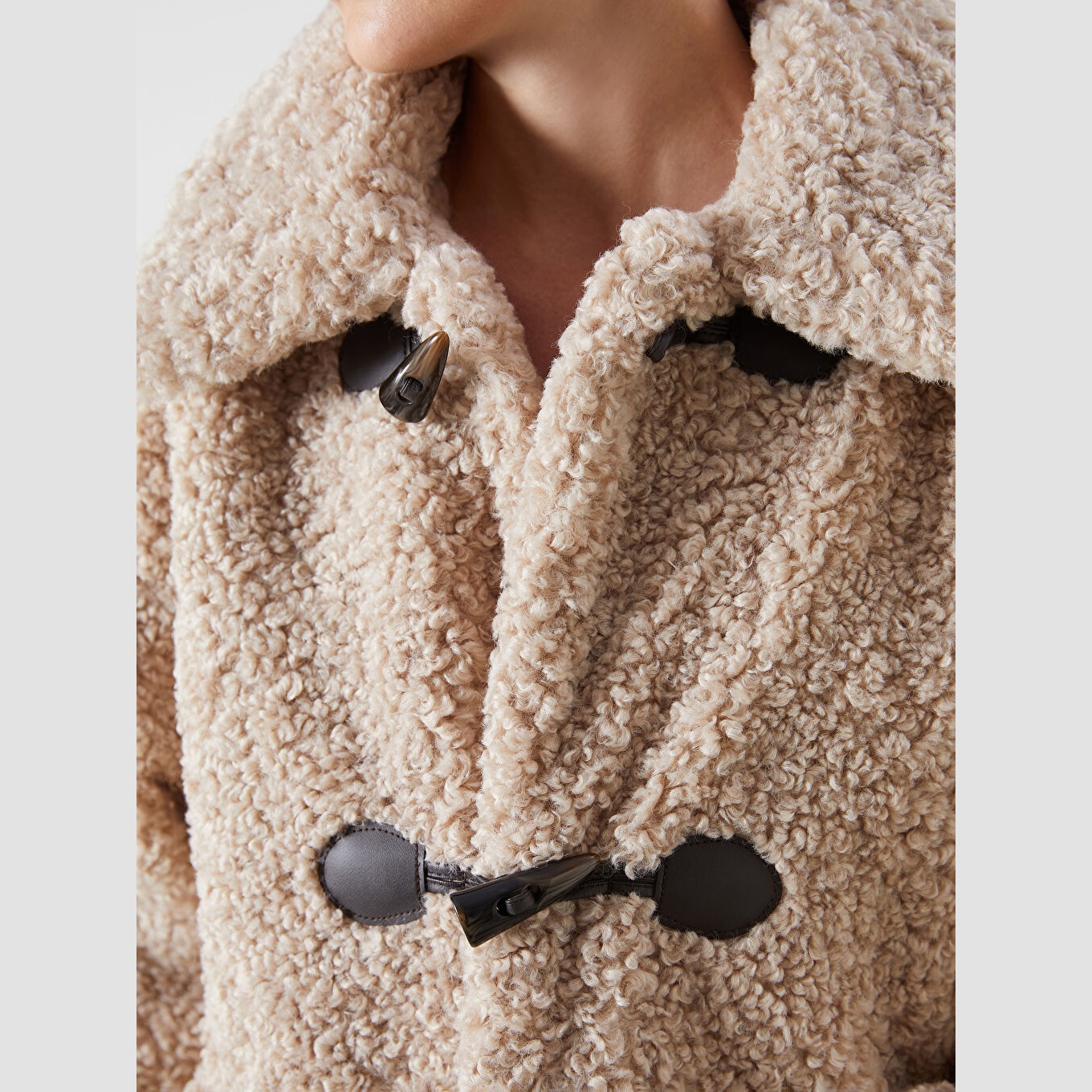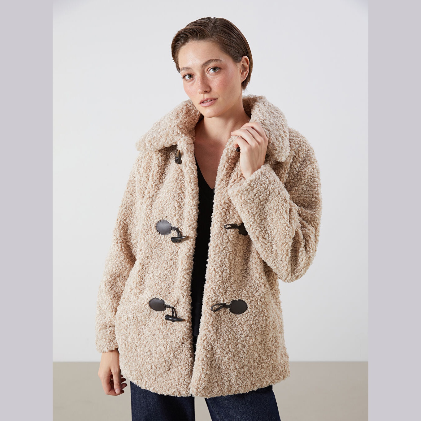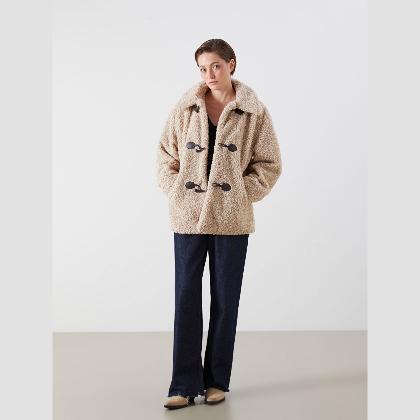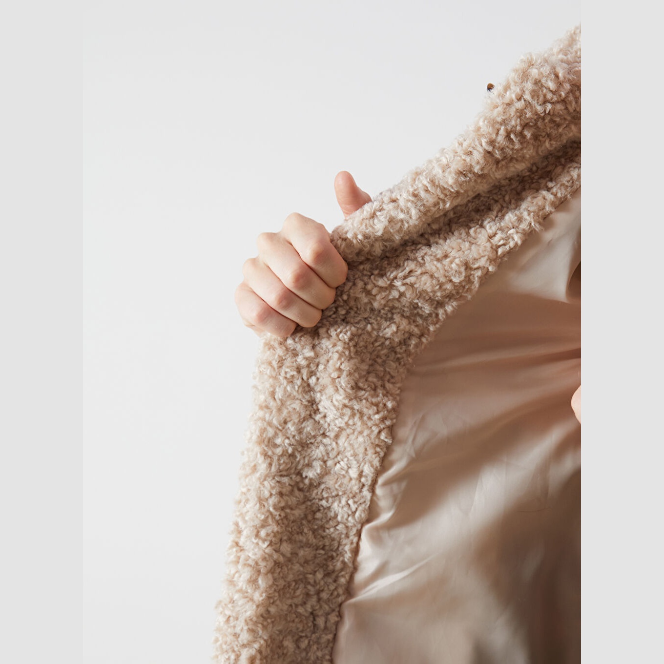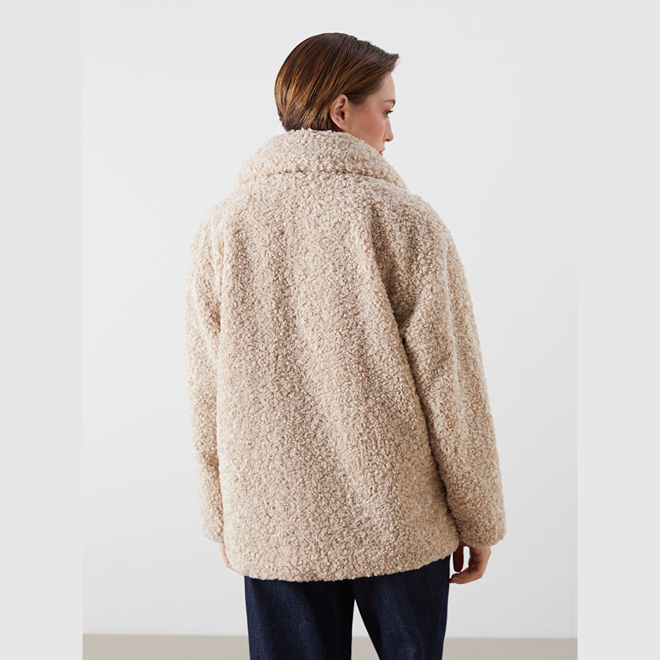 جاكيت نسائي شتوي من LCW Vision – بيج (قصة واسعة، تصميم ميدي، خامة بيليوش ناعمة، بياقة قميص، بدون قبعة، مثالي للإطلالات الشتوية اليومية بأسلوب أنيق ودافئ)