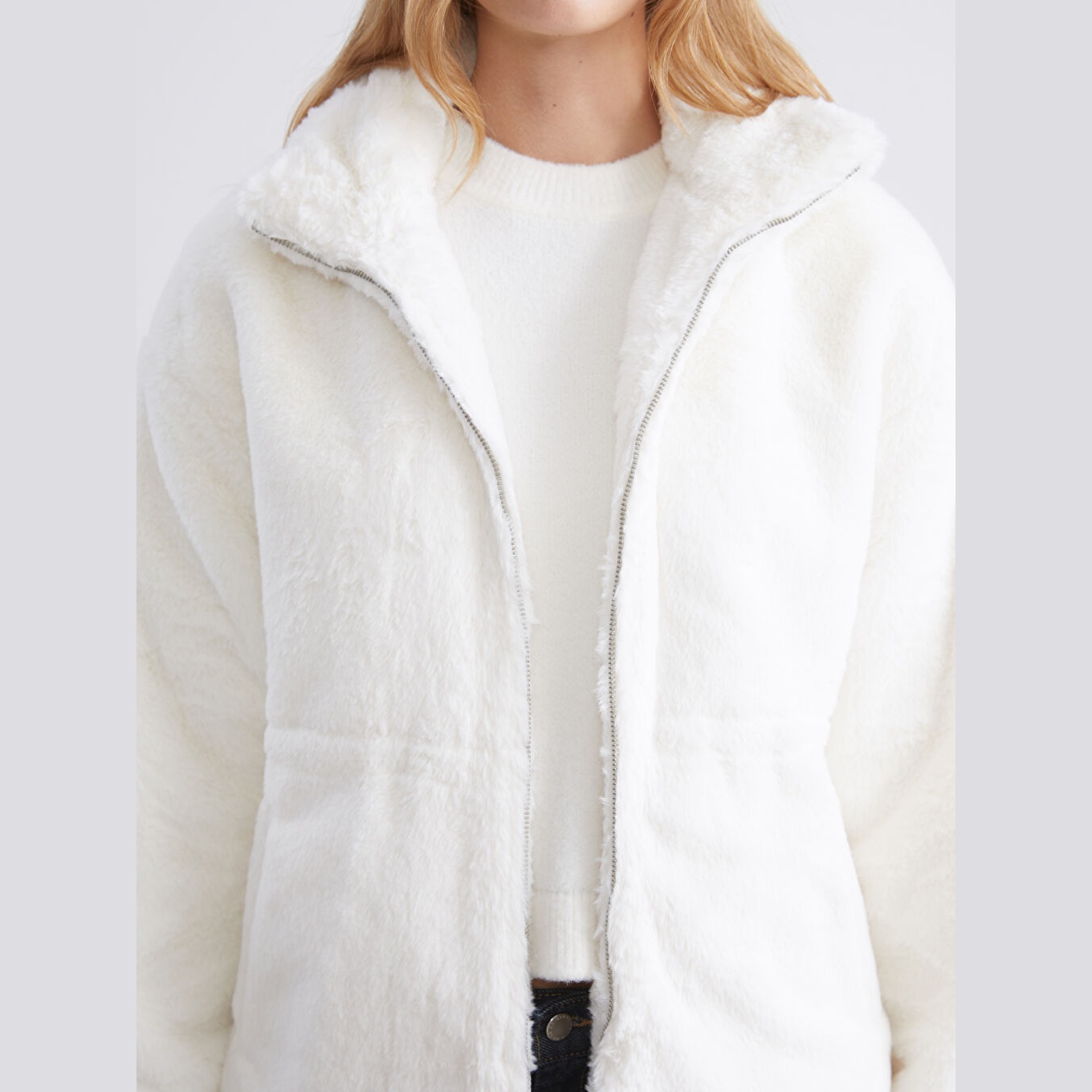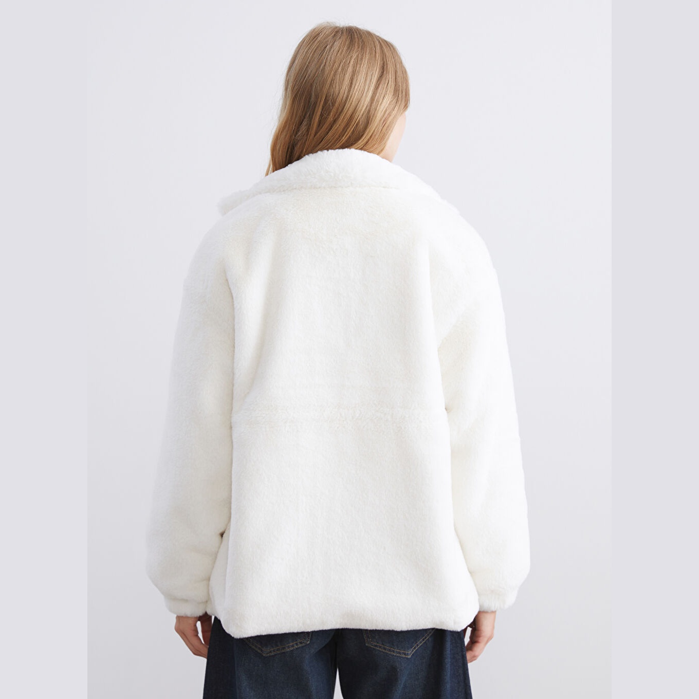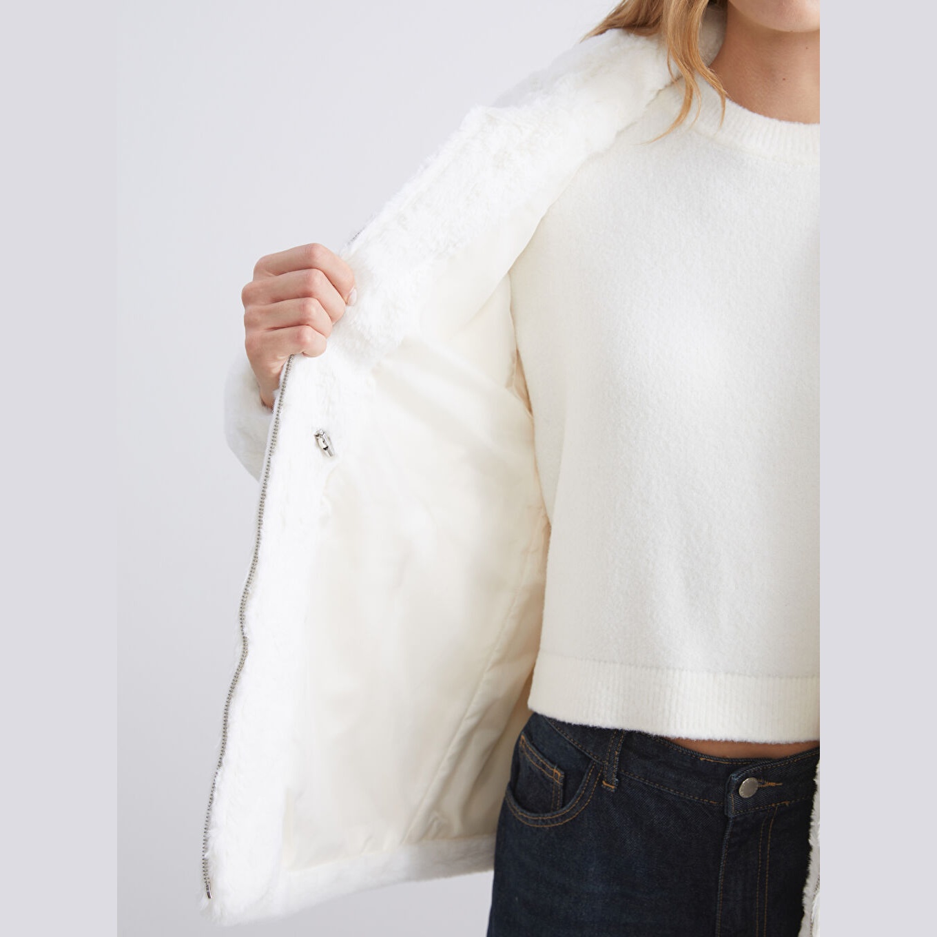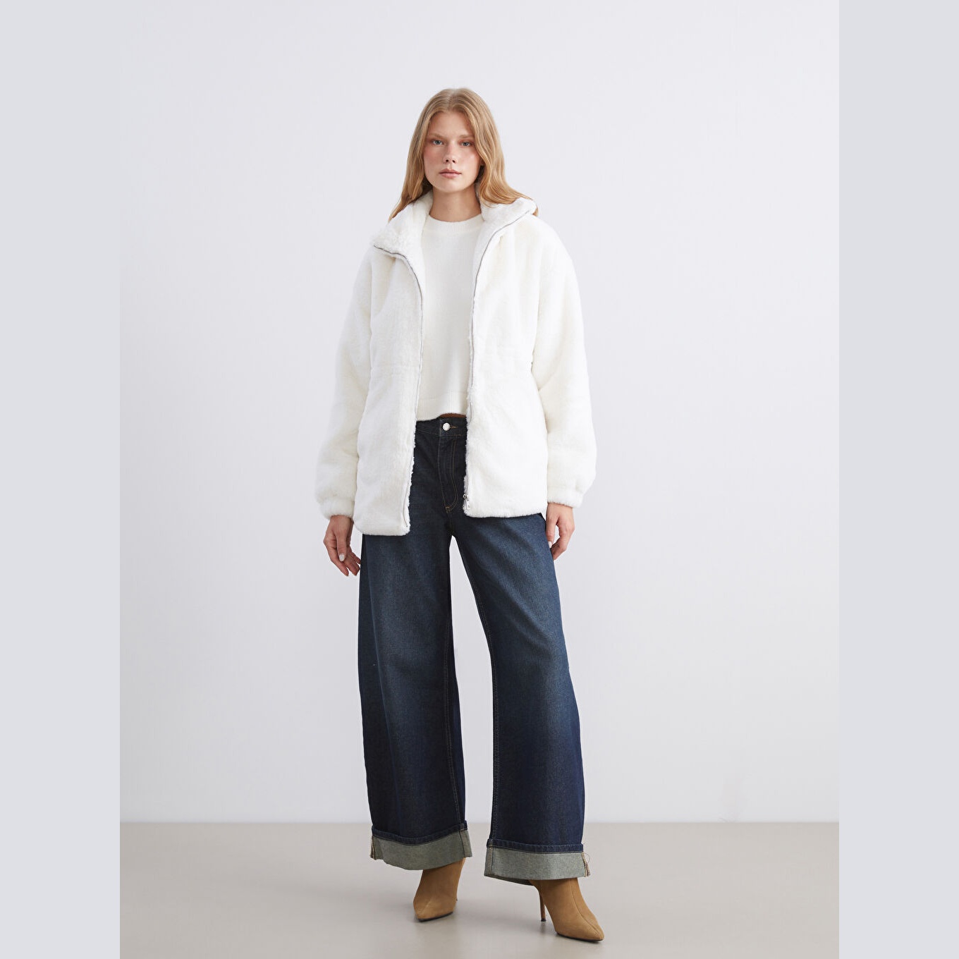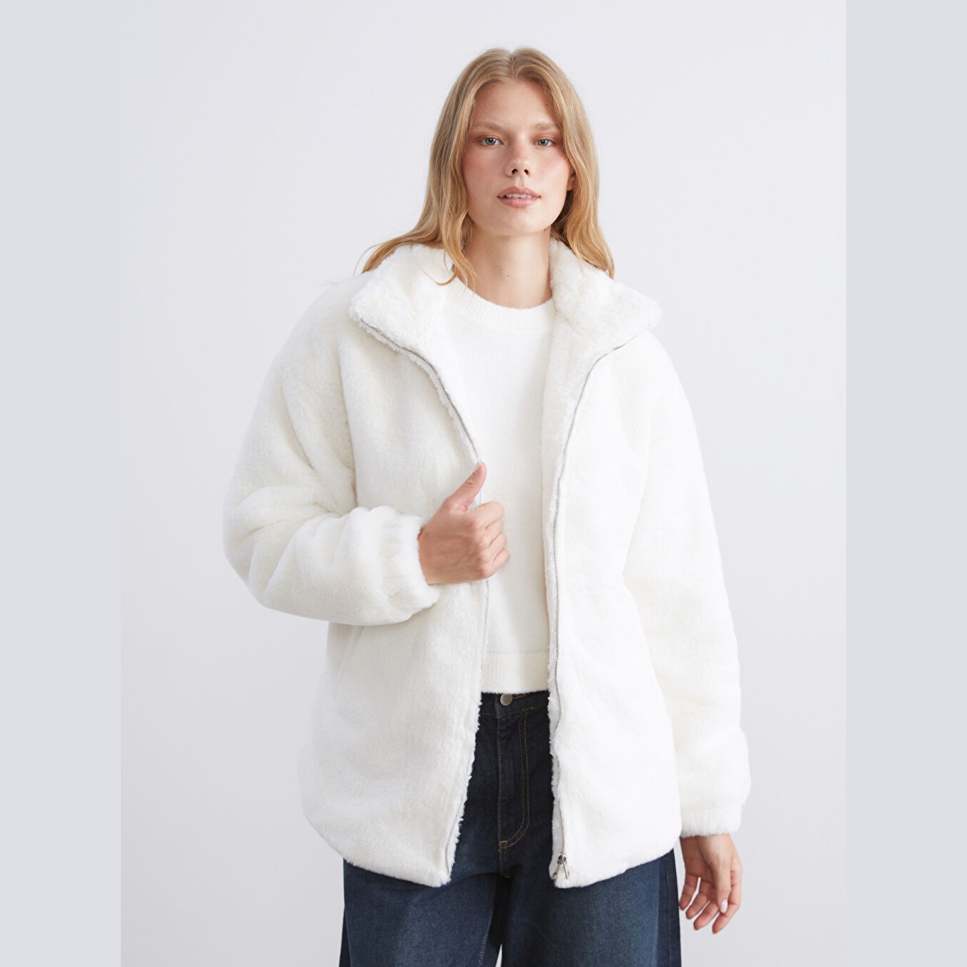 جاكيت نسائي شتوي من LCW Vision – إكرو (قصة واسعة، تصميم ميدي، خامة بيليوش ناعمة، بياقة مستقيمة، بدون قبعة، مثالي للإطلالات الشتوية اليومية بأسلوب أنيق ودافئ)