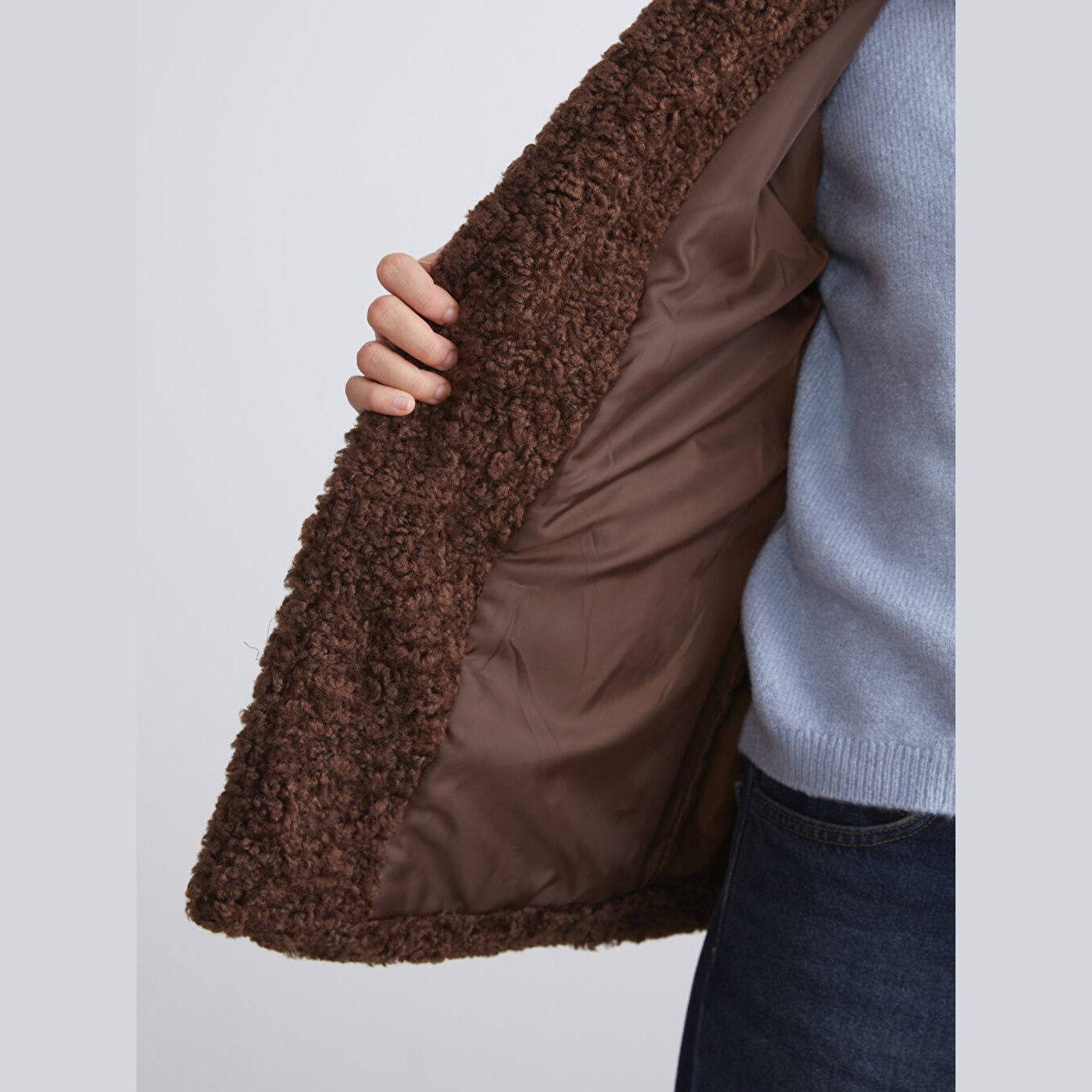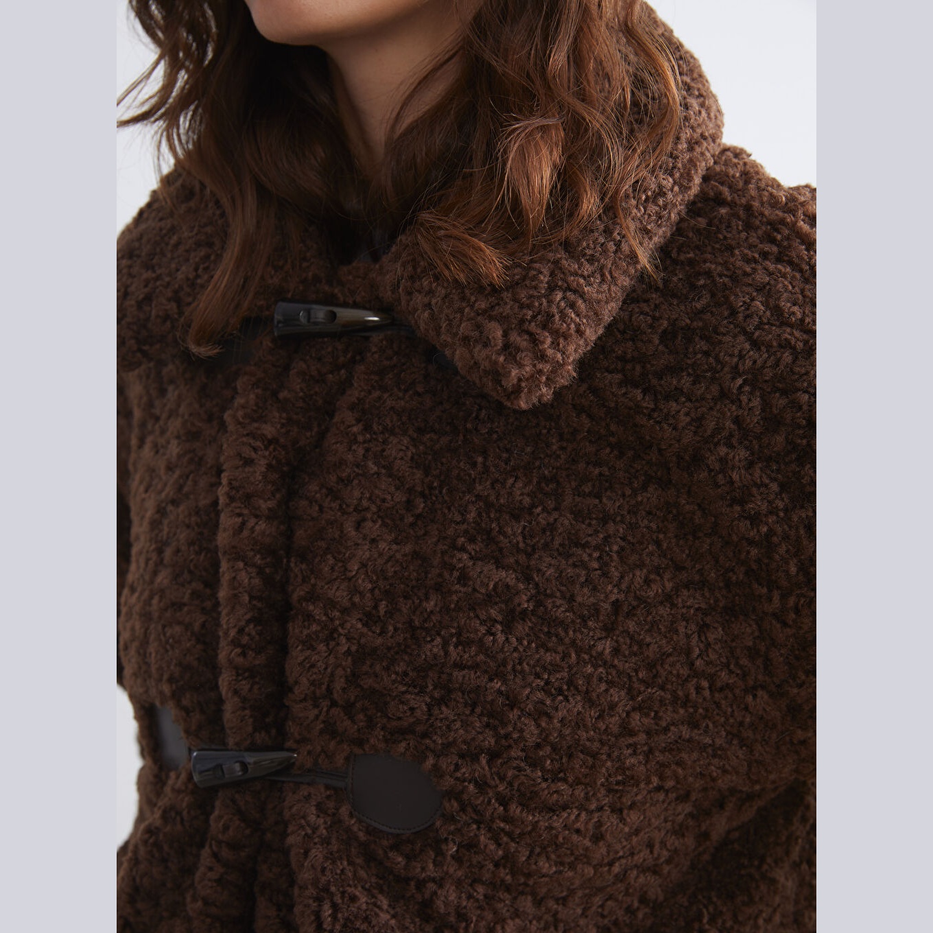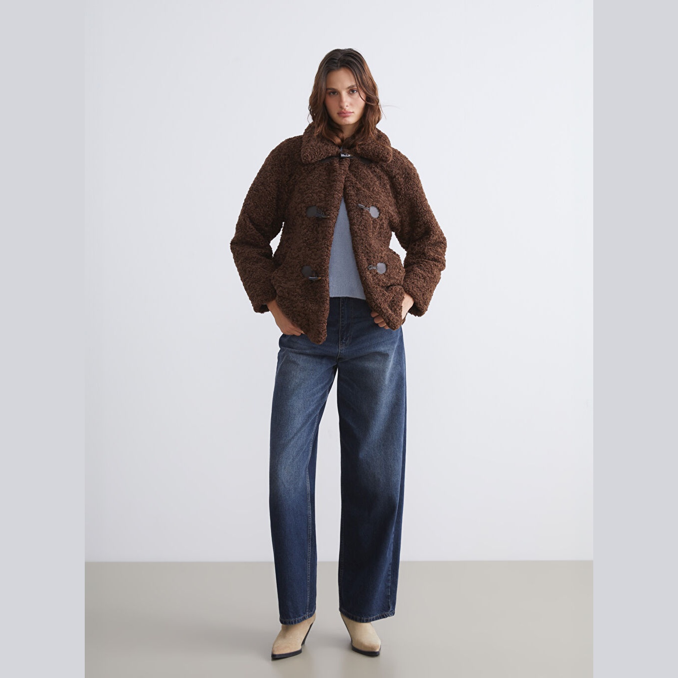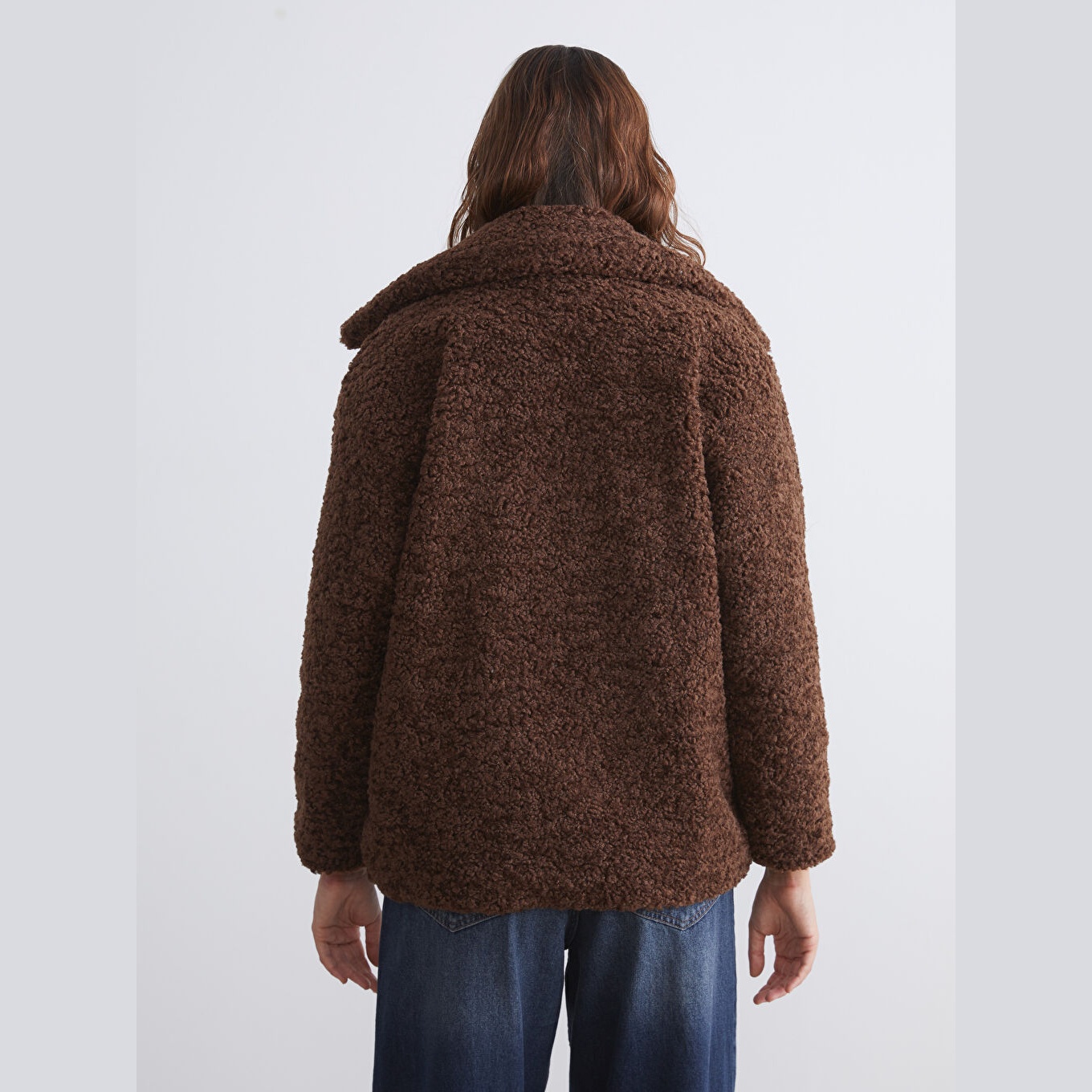 جاكيت نسائي شتوي من LCW Vision – بني (قصة واسعة، تصميم ميدي، خامة بيليوش ناعمة، بياقة قميص، بدون قبعة، مثالي للإطلالات الشتوية اليومية بأسلوب أنيق ودافئ)