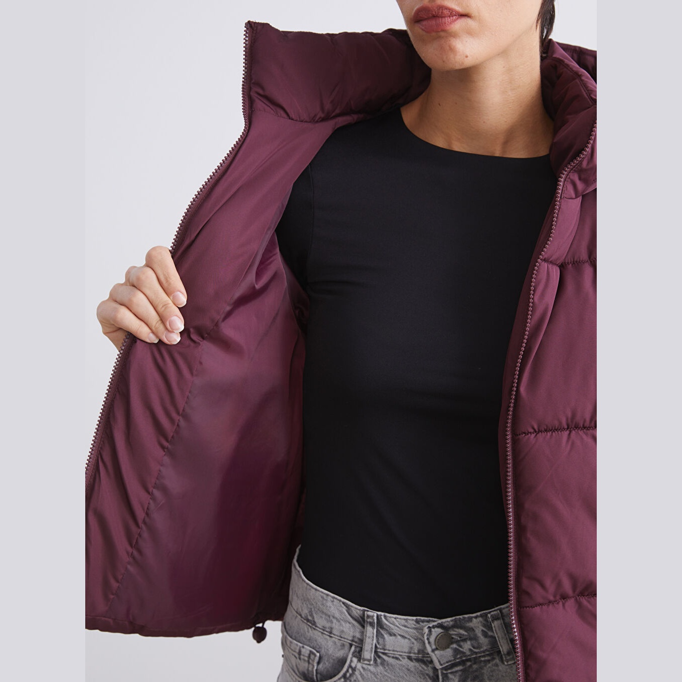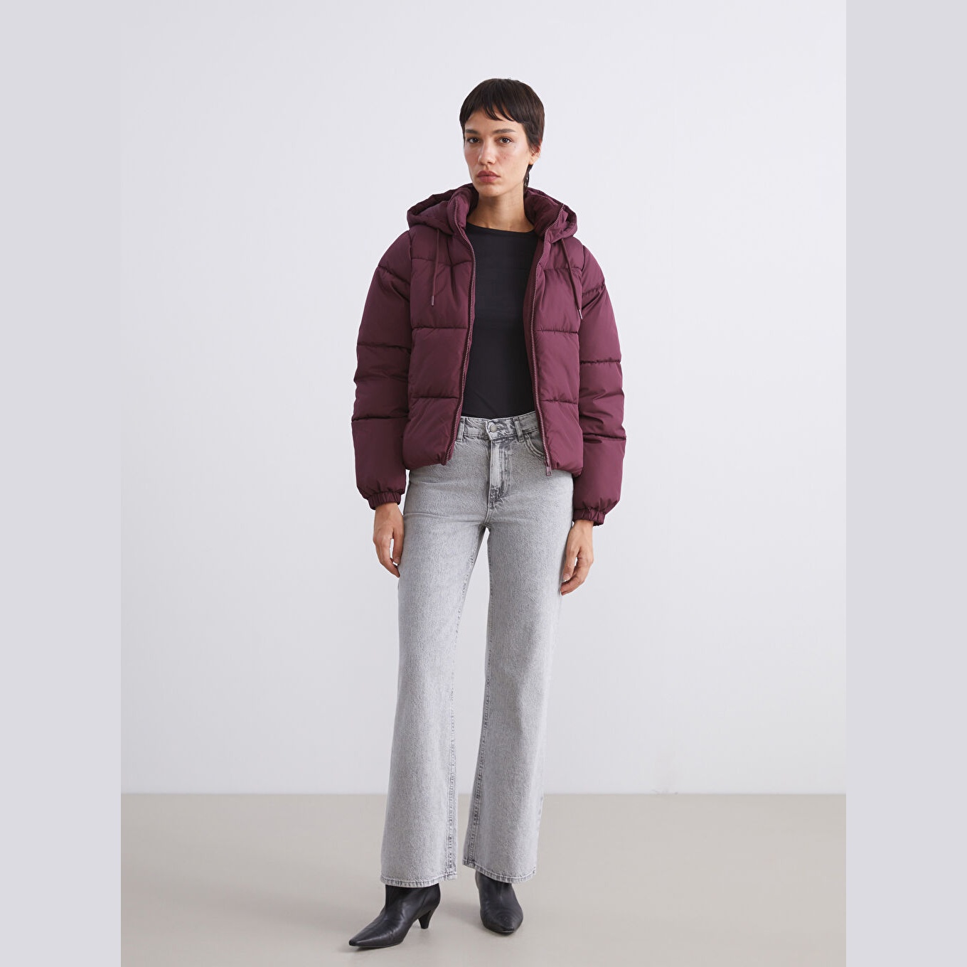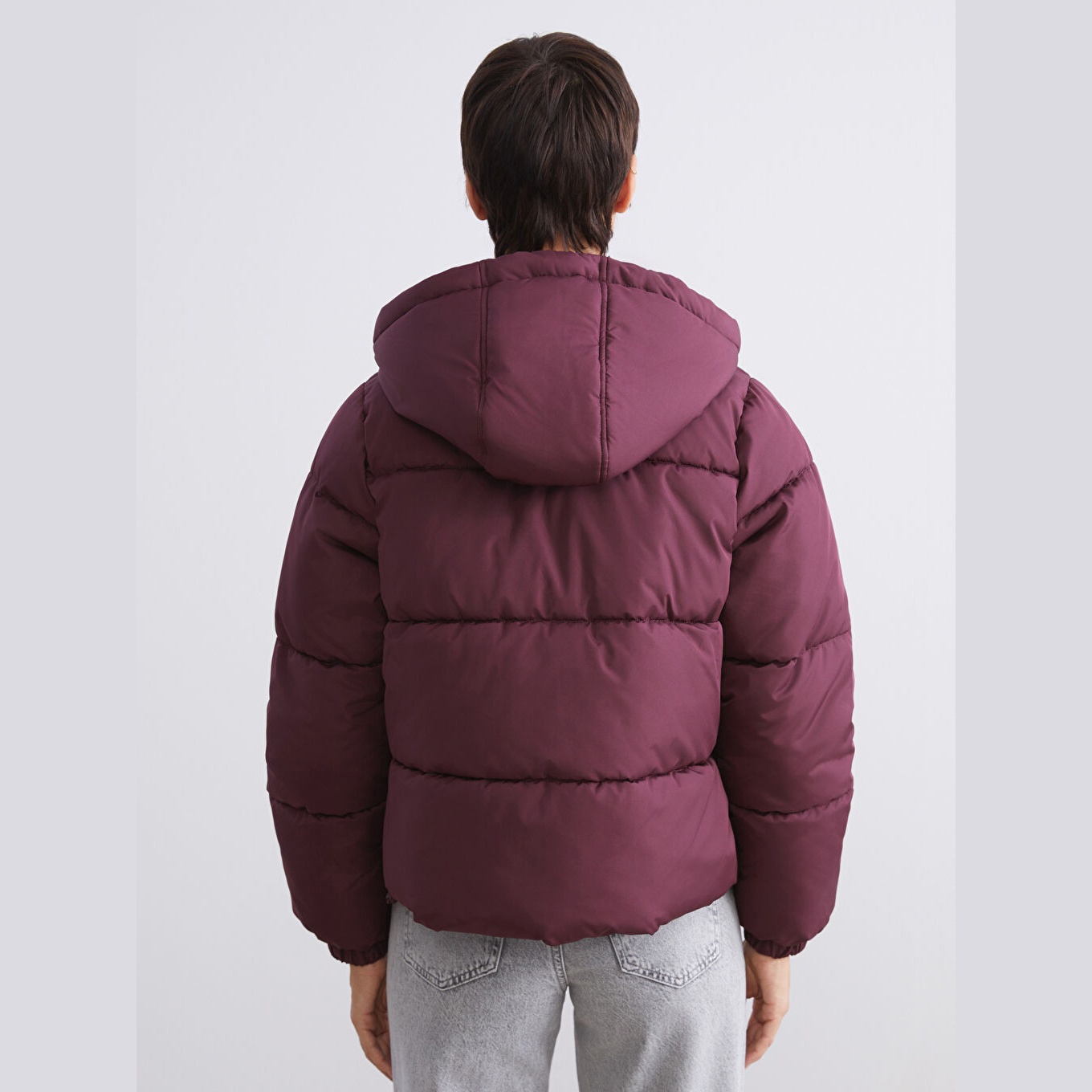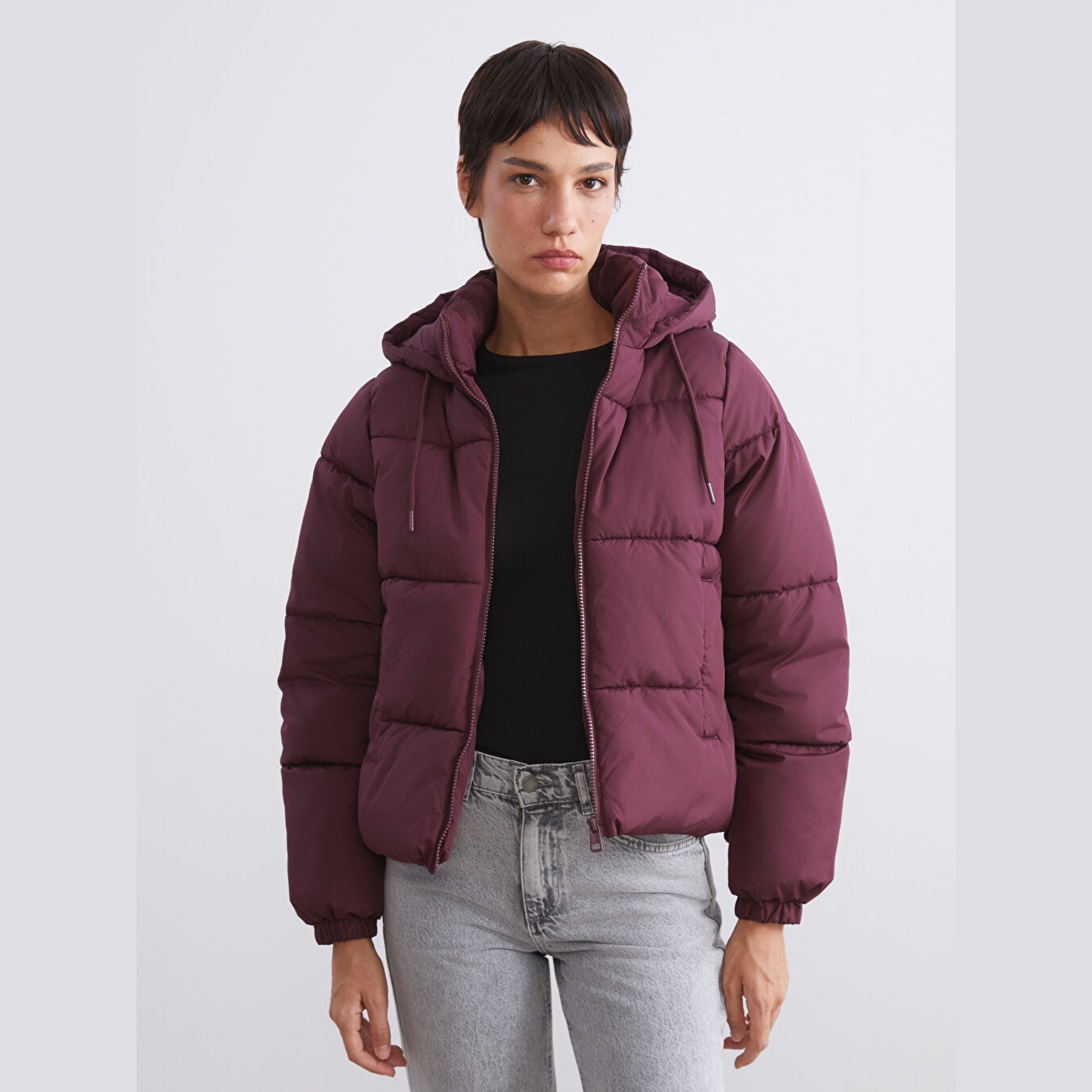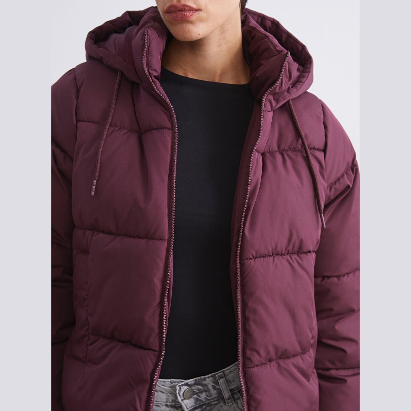 جاكيت نسائي شتوي من LCW Vision – خمري (قصة واسعة، تصميم قصير، خامة بوليستر سادة، قبعة ثابتة، سحاب أمامي، مثالي للإطلالات الشتوية اليومية بأسلوب عملي ودافئ)